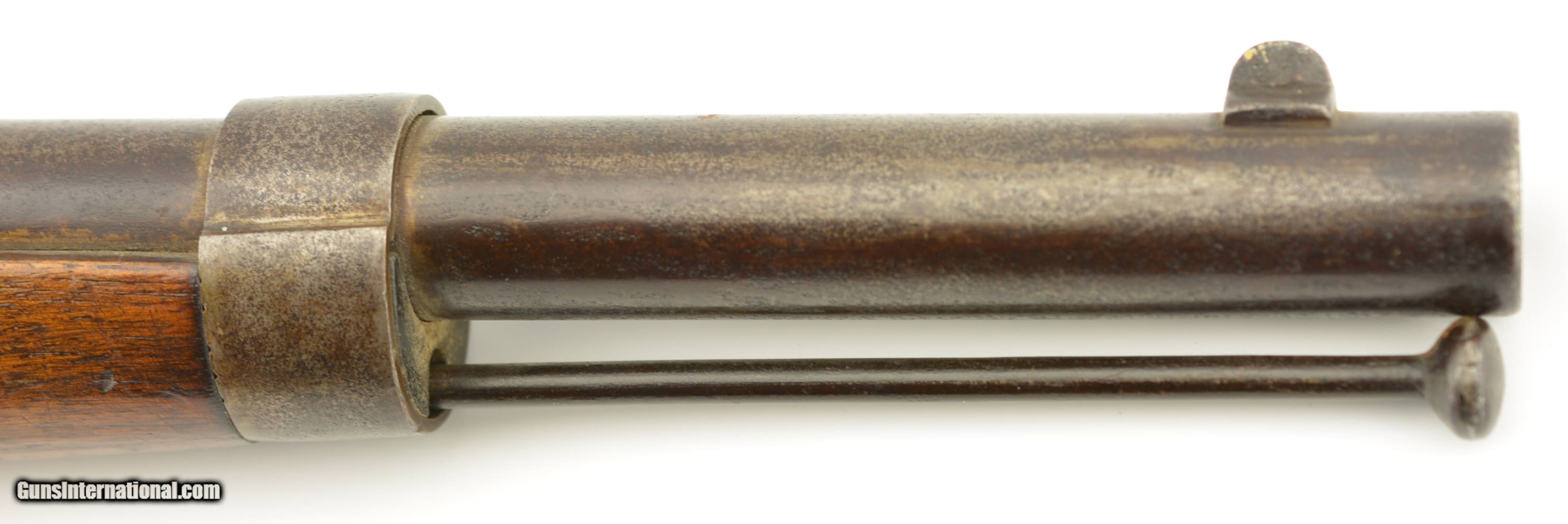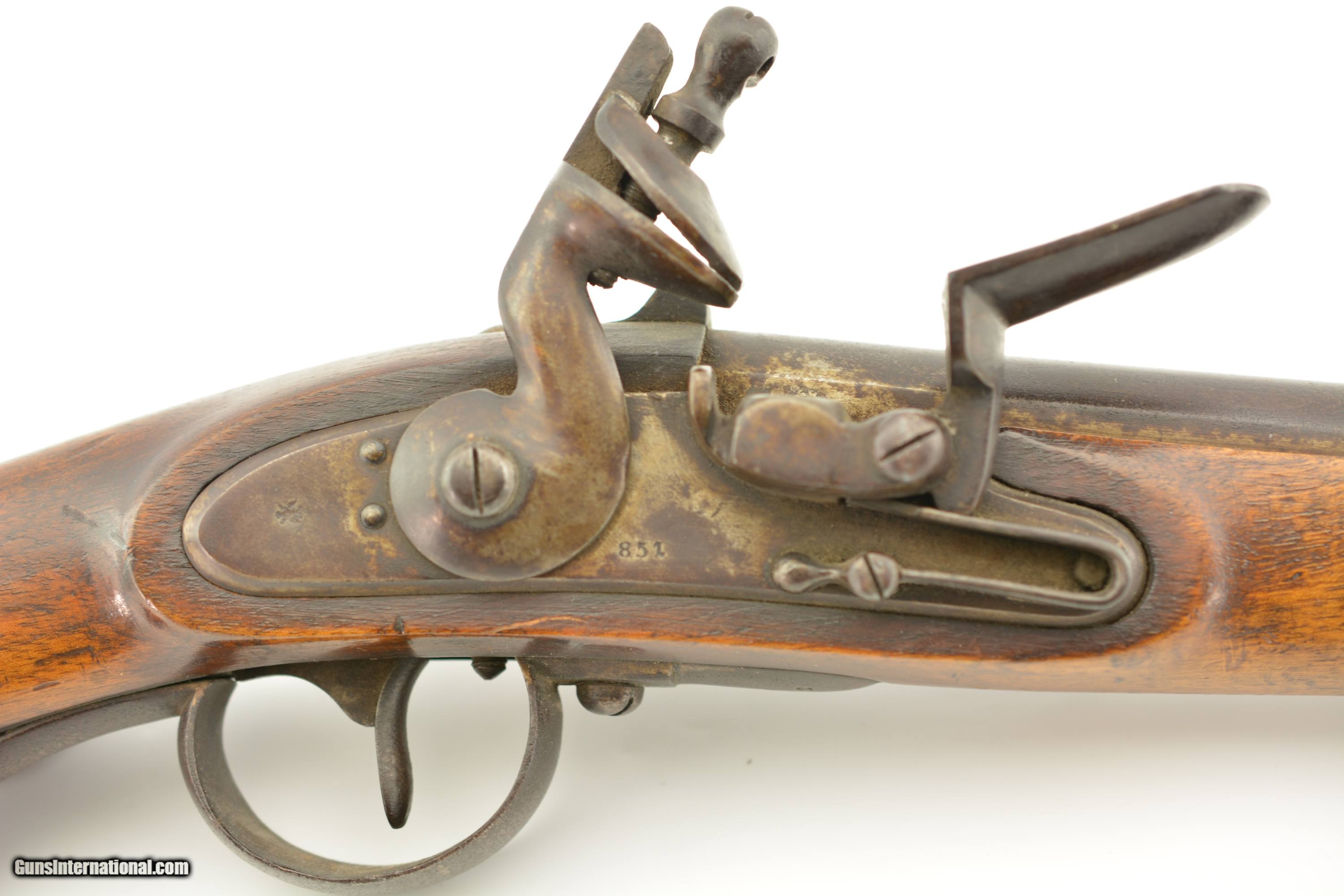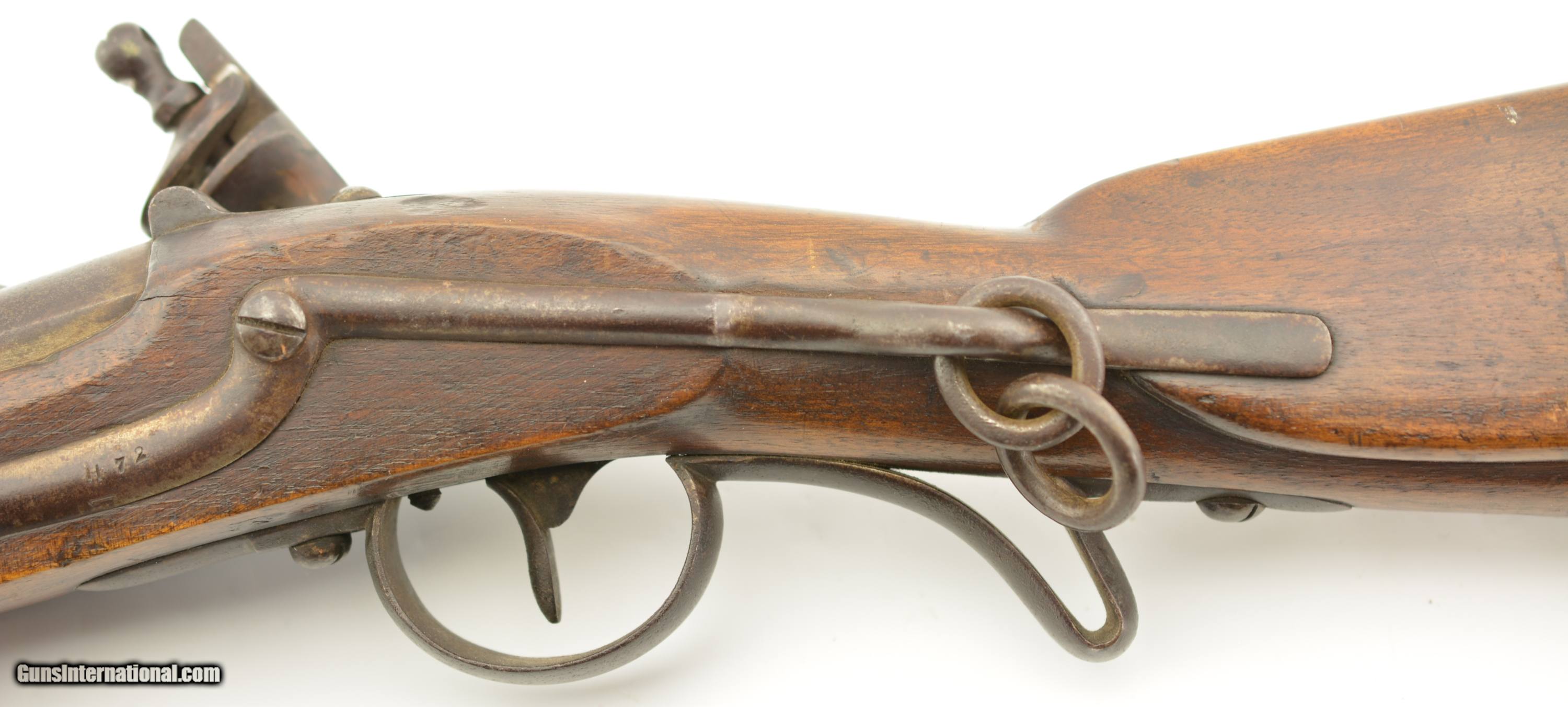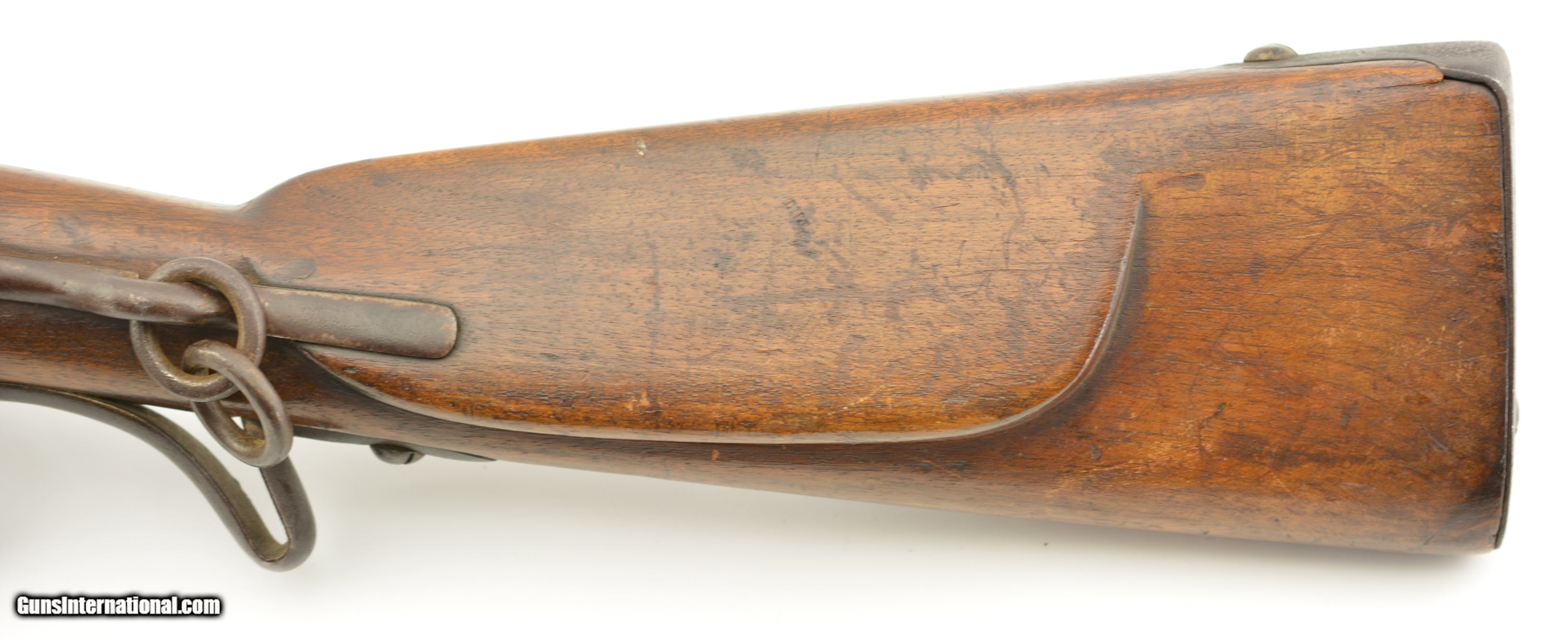 Description: NSN, .69 Caliber, 14 1/2" smoothbore barrel with a fine, bright bore that has a small amount of mild freckling towards the muzzle. This is an original, unconverted flintlock carbine, dated "851" (1851) on the Double Eagle marked lockplate. The metal has a more or less uniform plum-brown patina with areas of mottled gray on the lockplate and breech end of the barrel. The barrel itself has a maker stamp on the top of the breech: "GB", and has thin, pinprick pitting along the top. Three "H 72" part numbers are present on the trigger guard, sideplate, and barrel band, with a further "22" stamp on the top of the band. The touchhole exhibits almost no erosion, and the gun appears to have seen very little use. The action is quite robust and fully functional. The walnut stock has an old varnished finish added over numerous minor handling marks and blemishes, and a single very small chip near the toe of the butt on the right side. A correct metal ramrod is included with the carbine. Most of these original flintlock carbines were converted to percussion in the mid-19th century and large numbers were shipped to the US during the Civil War. Original flintlock carbines are very rarely encountered, and this example is in very good-near fine overall condition. Antique SOLD Antique: Yes Manufacturer: Austrian Model: Carbine Caliber Info: .69 Gauge Info: .69 |