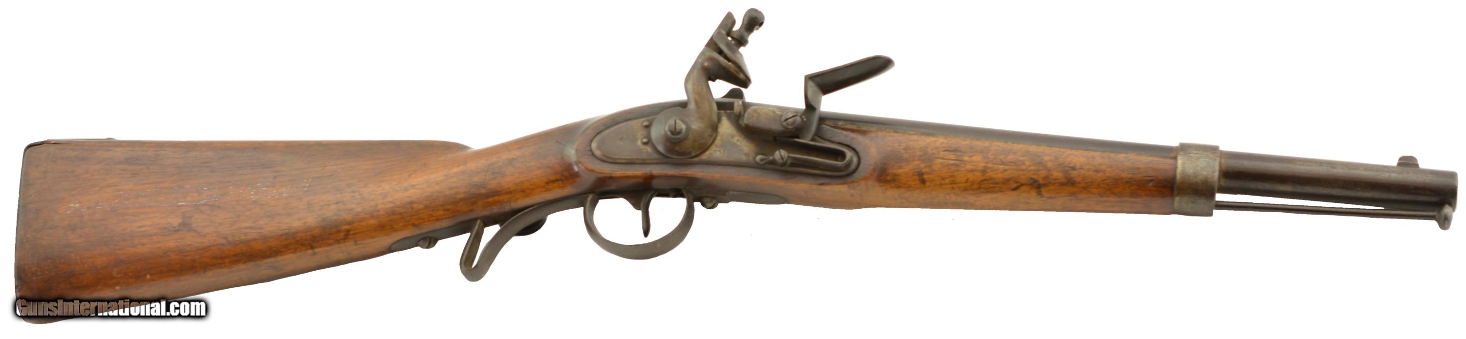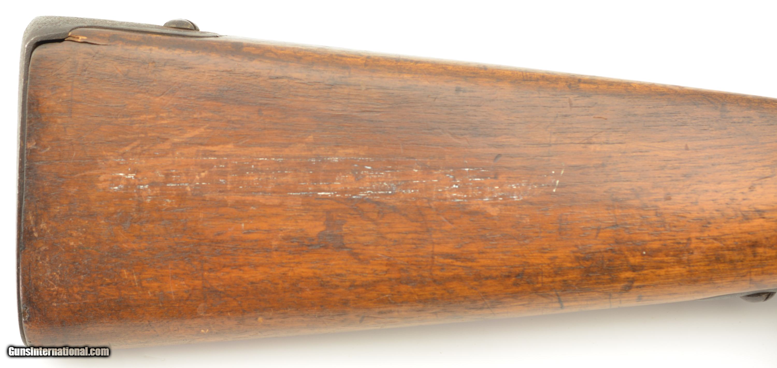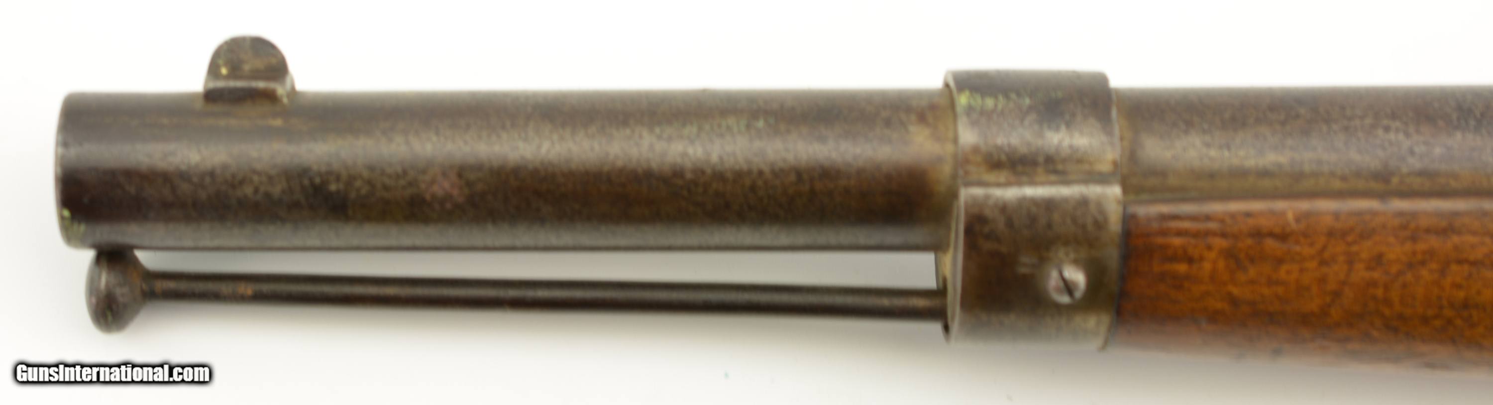Description: NSN, .69 Caliber, 14 1/2" smoothbore barrel with a fine, bright bore that has a small amount of mild freckling towards the muzzle. This is an original, unconverted flintlock carbine, dated "851" (1851) on the Double Eagle marked lockplate. The metal has a more or less uniform plum-brown patina with areas of mottled gray on the lockplate and breech end of the barrel. The barrel itself has a maker stamp on the top of the breech: "GB", and has thin, pinprick pitting along the top. Three "H 72" part numbers are present on the trigger guard, sideplate, and barrel band, with a further "22" stamp on the top of the band. The touchhole exhibits almost no erosion, and the gun appears to have seen very little use. The action is quite robust and fully functional. The walnut stock has an old varnished finish added over numerous minor handling marks and blemishes, and a single very small chip near the toe of the butt on the right side. A correct metal ramrod is included with the carbine. Most of these original flintlock carbines were converted to percussion in the mid-19th century and large numbers were shipped to the US during the Civil War. Original flintlock carbines are very rarely encountered, and this example is in very good-near fine overall condition. Antique SOLD Antique: Yes Manufacturer: Austrian Model: Carbine Caliber Info: .69 Gauge Info: .69 |