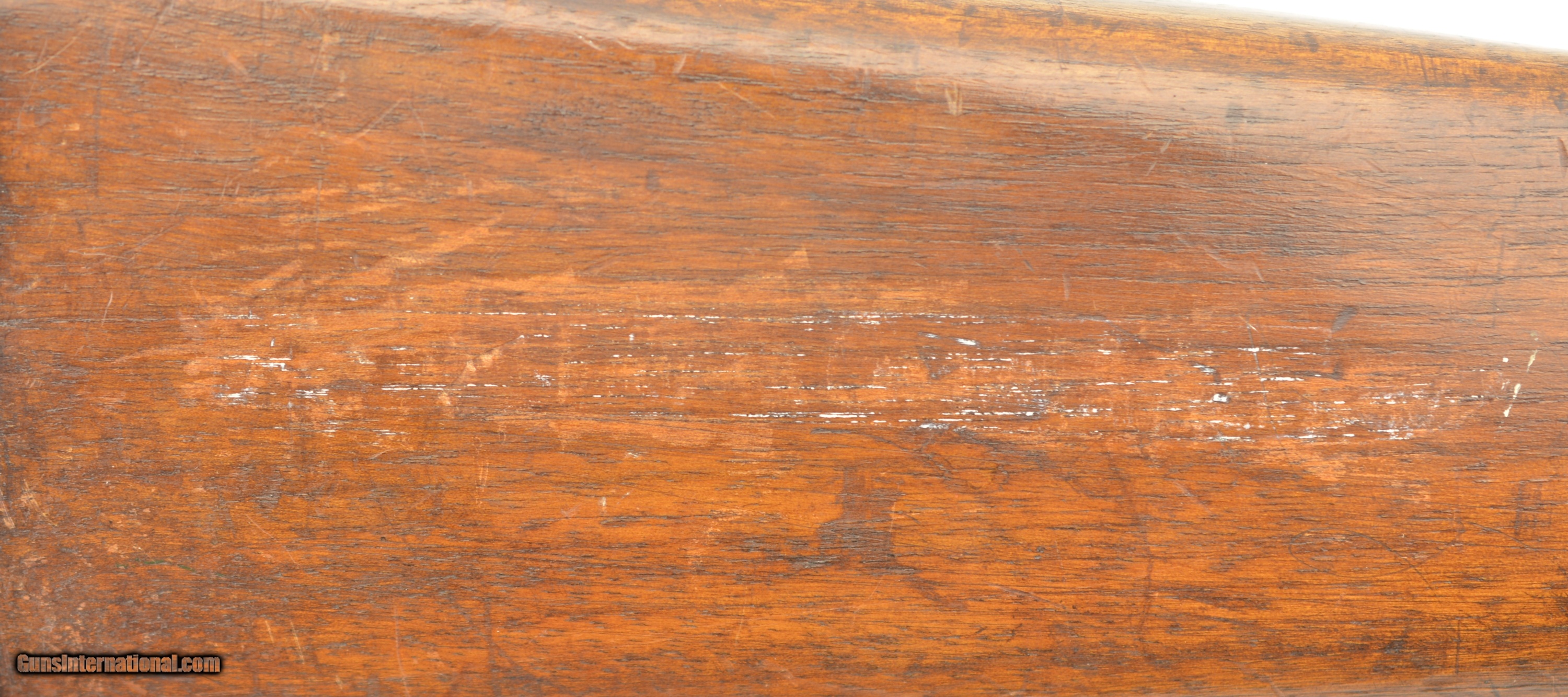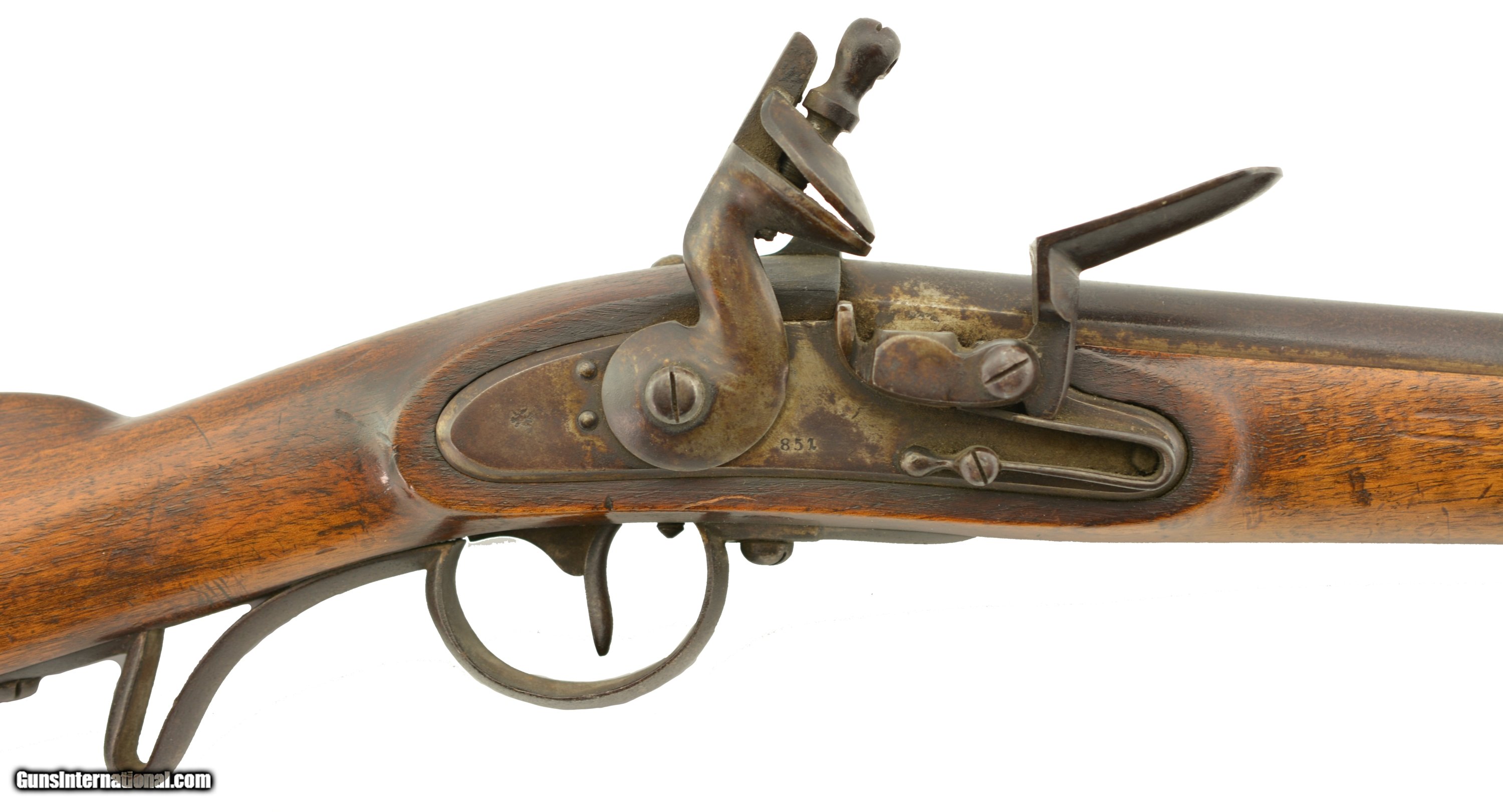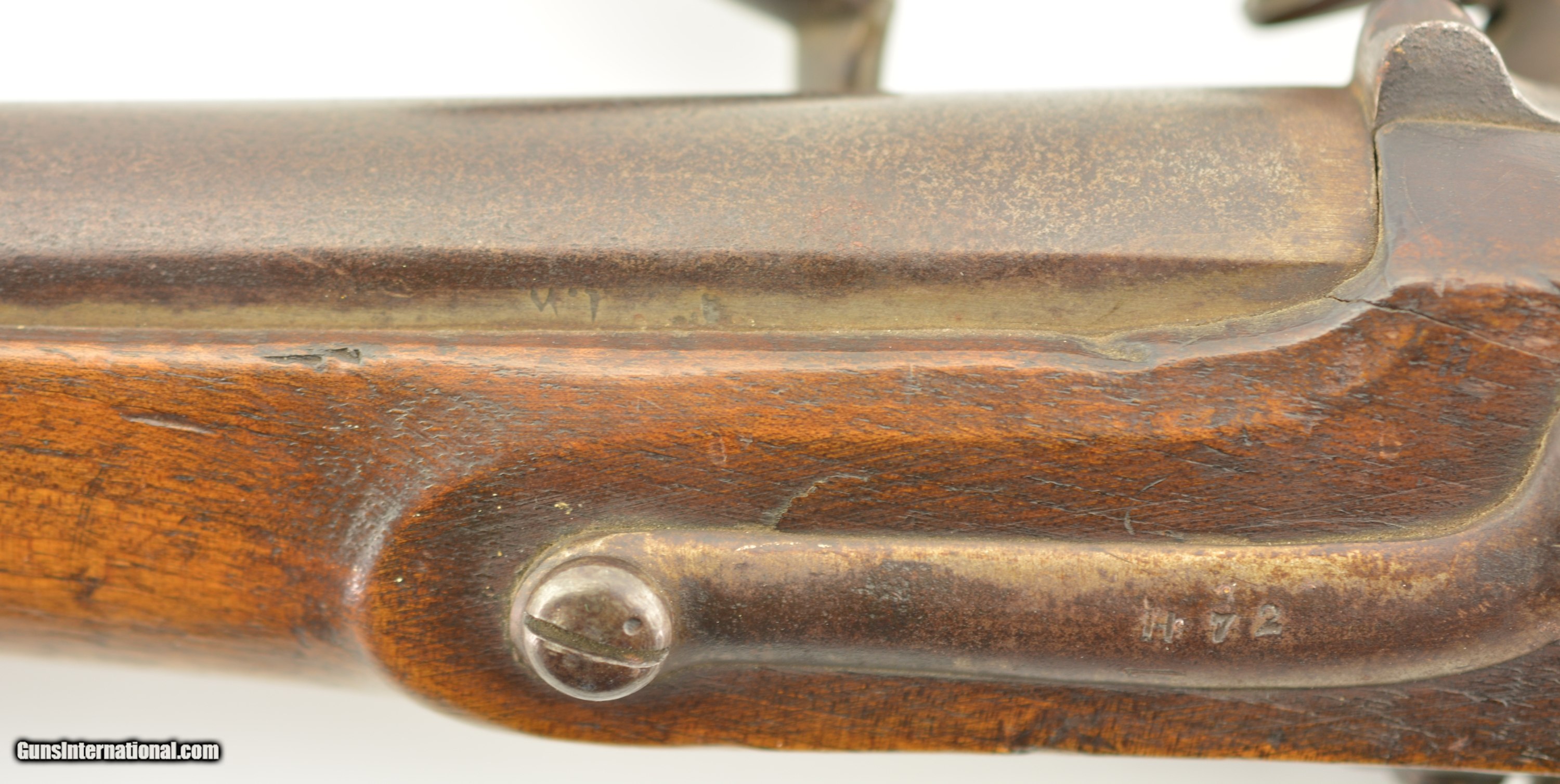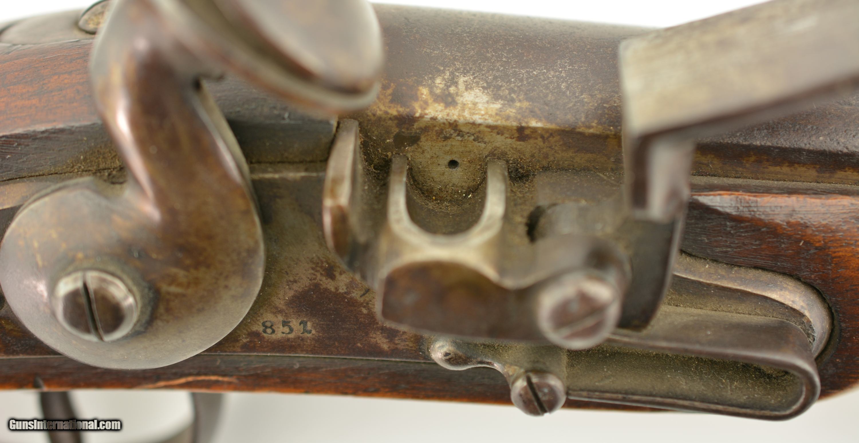 Description: NSN, .69 Caliber, 14 1/2" smoothbore barrel with a fine, bright bore that has a small amount of mild freckling towards the muzzle. This is an original, unconverted flintlock carbine, dated "851" (1851) on the Double Eagle marked lockplate. The metal has a more or less uniform plum-brown patina with areas of mottled gray on the lockplate and breech end of the barrel. The barrel itself has a maker stamp on the top of the breech: "GB", and has thin, pinprick pitting along the top. Three "H 72" part numbers are present on the trigger guard, sideplate, and barrel band, with a further "22" stamp on the top of the band. The touchhole exhibits almost no erosion, and the gun appears to have seen very little use. The action is quite robust and fully functional. The walnut stock has an old varnished finish added over numerous minor handling marks and blemishes, and a single very small chip near the toe of the butt on the right side. A correct metal ramrod is included with the carbine. Most of these original flintlock carbines were converted to percussion in the mid-19th century and large numbers were shipped to the US during the Civil War. Original flintlock carbines are very rarely encountered, and this example is in very good-near fine overall condition. Antique SOLD Antique: Yes Manufacturer: Austrian Model: Carbine Caliber Info: .69 Gauge Info: .69 |