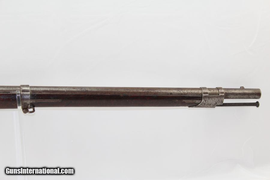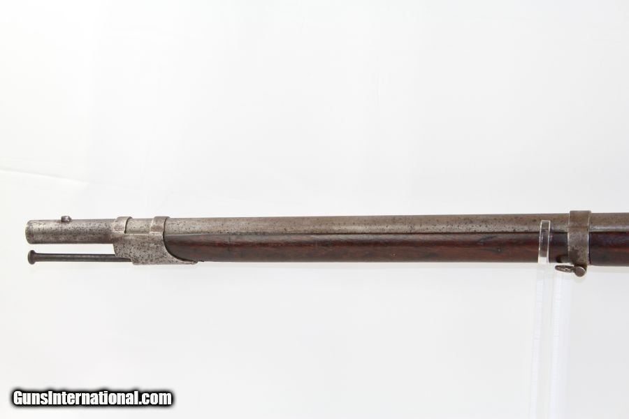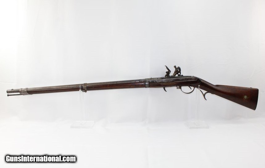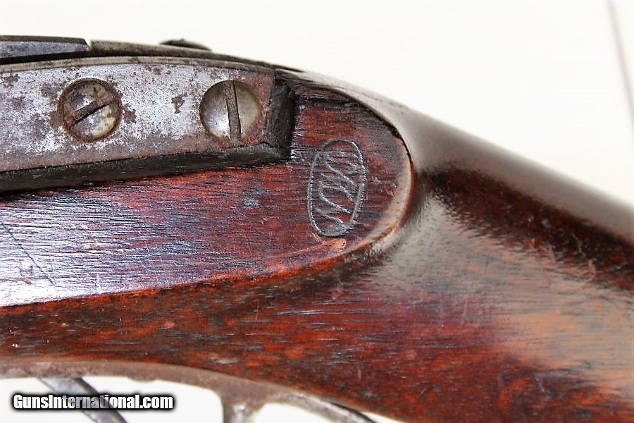 Description: Scarce SIMEON NORTH US M1819 Hall FLINTLOCK Musket Original US Military Flintlock Dated “1835” Here we present a Simeon North Hall Breech-Loading Model 1819 Flintlock Musket in its unaltered state, manufactured in 1835. In January of 1827, the US Ordnance Department contracted with Simeon North to produce 5,000 flintlock Hall Rifles. John Harris Hall was an innovative inventor and forward thinking gunsmith during his time. Aside from his contributions to mass production, Hall also designed and developed the M1819 Hall Rifle that bears his name. Though a single shot long gun, the primary quality of this rifle was its patented breech loading system which allowed the operator to load and reload his weapon at the action as opposed to the muzzle. The breechblock pivots upwards for loading and is released via a lever device (a.k.a. fishtail) that protrudes from the bottom of the stock forward of the trigger. This meant the shooter no longer had to stand his weapon on its butt and engage in a time-consuming reloading process. The M1819 Hall Rifle became the first breech loading rifle in the world to be adopted in significant quantities by a national army. In 1819, the United States Army formally adopted the Hall Rifle into inventory, superseding the Harpers Ferry Model 1803 flintlock line, with an order for 1,000 Hall Rifles, thus earning the designation of “Model 1819”. Many Model 1819 muskets saw conversion to percussion in the lead in to the Civil War, becoming the Model 1841 Hall Rifle. In total, 23,500 Model 1819 Hall Rifles were produced. Hall died long before the war on February 26, 1841, though not before leaving his imprint on firearms and mass production history. This rifle bears the inspection mark of Nahum W. Patch on the left stock flat and another on the top rear of the stock comb. The overall condition is good. The iron parts have a mixed gray patina. The markings are clear. The walnut stock shows lots of use and remains solid. The bore is dark and dusty. The action is excellent. Own the original! This is a legitimate antique and not a reproduction. Barrel is 32-3/4 inches. Caliber: .52 Flintlock Overall condition as seen in photos. Very Fast. Very Safe. FREE SHIPPING WORLDWIDE. Delivered directly to your door by express mail! Guaranteed AUTHENTIC & Includes CERTIFICATE OF AUTHENTICITY. ancestryguns $3350 #8574 SOLD Antique: Yes |