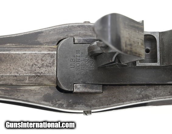U.S. Model 1819 Hall Flintlock Rifle. Gorgeous Model 1819 rifle with a S. North breech dated 1832. The North contract rifles exclusively used barrel band springs to secure the barrel to the rifle. It is our professional opinion that the breech has been placed in a Hall stock. Metal is brown/gray patina with traces of original brown finish. Wood is good, has some minor wear. A crack is noted on the left-side above the trigger guard. Overall a great-looking Hall rifle!