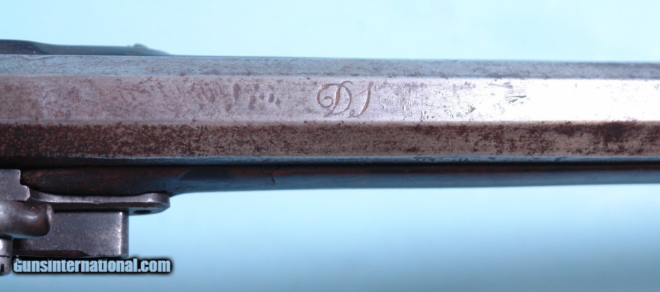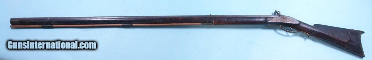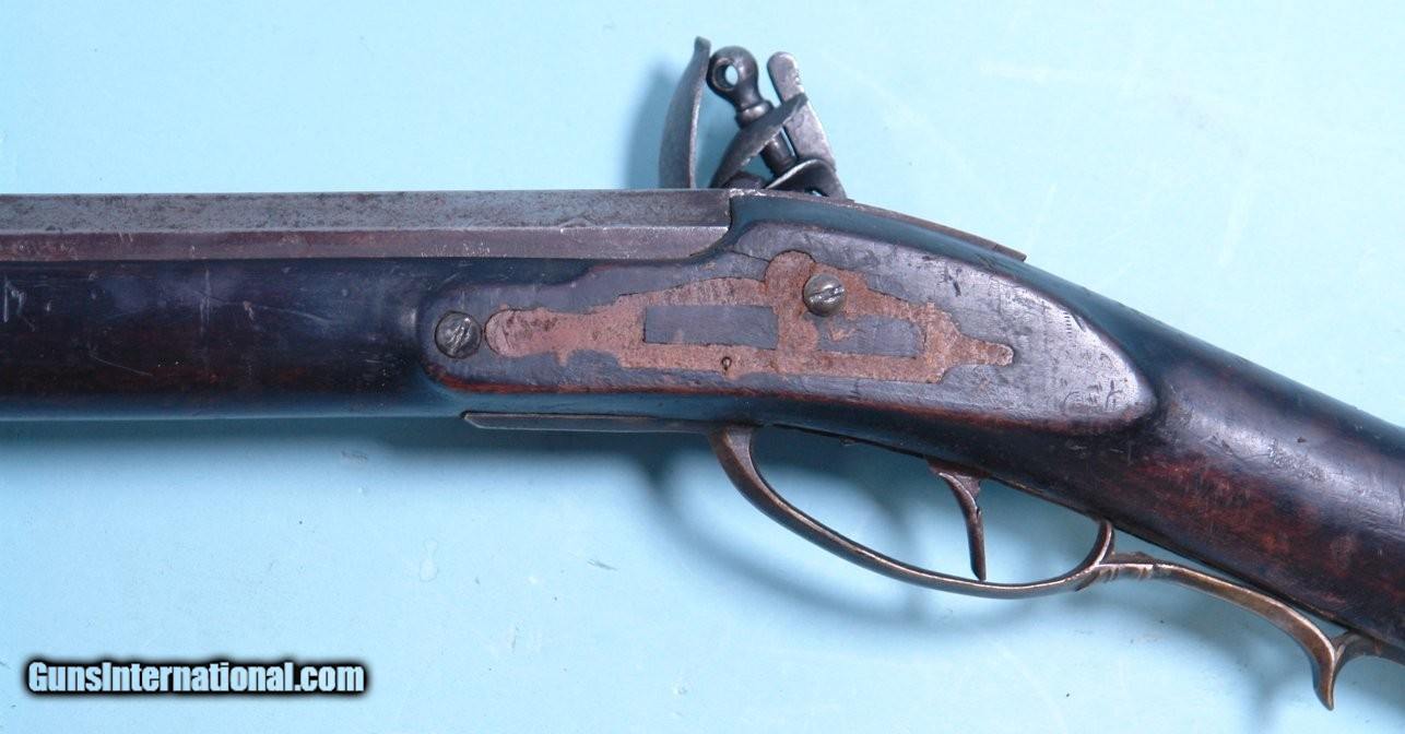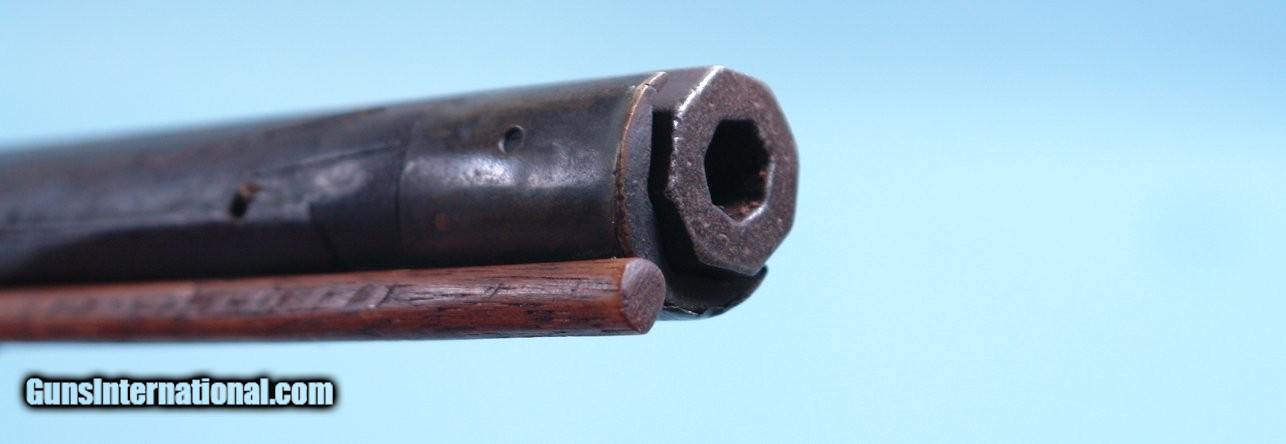 Description: WAR OF 1812 ERA VIRGINIA FLINTLOCK MILITIA LONGRIFLE SIGNED “DS”. 44 ½” rifled .50caliber octagon sighted barrel signed in script “DS”. Maple stock with the original dark stained finish and brass mounts and trigger guard. Double triggers with forward trigger missing. Openwork side plate lost long ago replaced with contrasting color wood filler. Lock a replacement with very scarce British Pattern 1810 Tower Baker Rifle lock with all the original lock parts. Touch hole re-bushed with screw in plug and probable re-conversion. Ramrod original. Probably the work of the well known Spitzer shop in New Market. Has many features common to their rifles. Nice untouched look overall with the unusual British Baker Rifle lock fitting well and looking like it has been on it for a very long time. $1750. SOLD Antique: Yes |