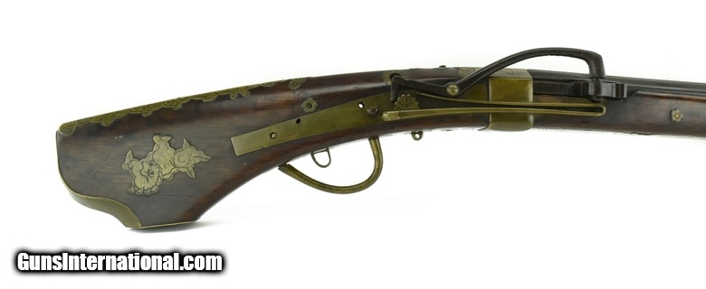 Japanese “Tanegashima” Matchlock Rifle. Barrel length 40”, overall length 51 ½”. Tulip shape flared muzzle. Various engraved brass inlay such as birds, samurai helmet, dragon, sacred pearl, Shi-Shi dog, and flowers. Action works perfectly. Fine condition.