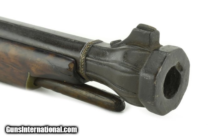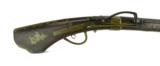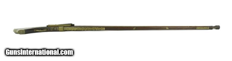 Description: Japanese “Tanegashima” Matchlock Rifle. Barrel length 40”, overall length 51 ½”. Tulip shape flared muzzle. Various engraved brass inlay such as birds, samurai helmet, dragon, sacred pearl, Shi-Shi dog, and flowers. Action works perfectly. Fine condition. SOLD Antique: Yes |