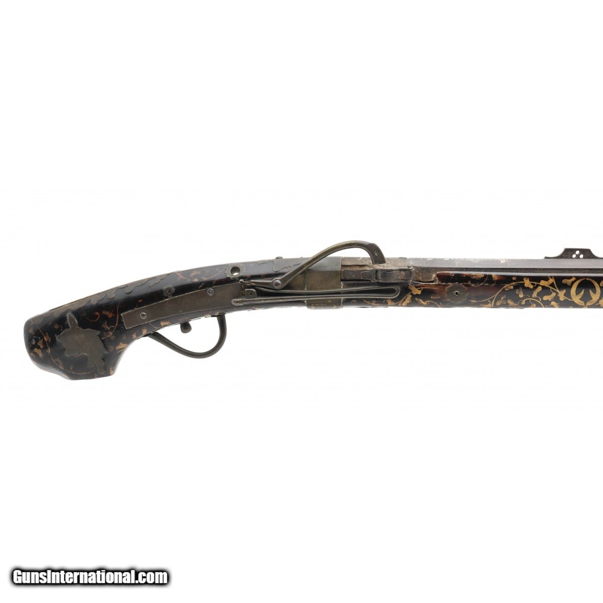 Description: "Made circa 1800. 65 caliber with a 39" barrel. Very neat example of Japanese match lock. Barrel has a dark brown patina. The barrels has silver inlays. The muzzle is a cannon type. The stock has laquer work and has inlays. Very neat example! SOLD Antique: Yes |