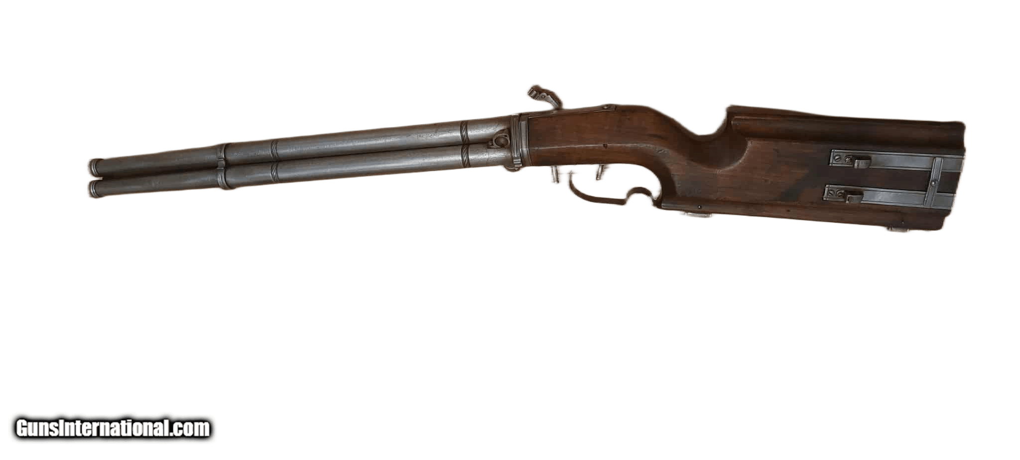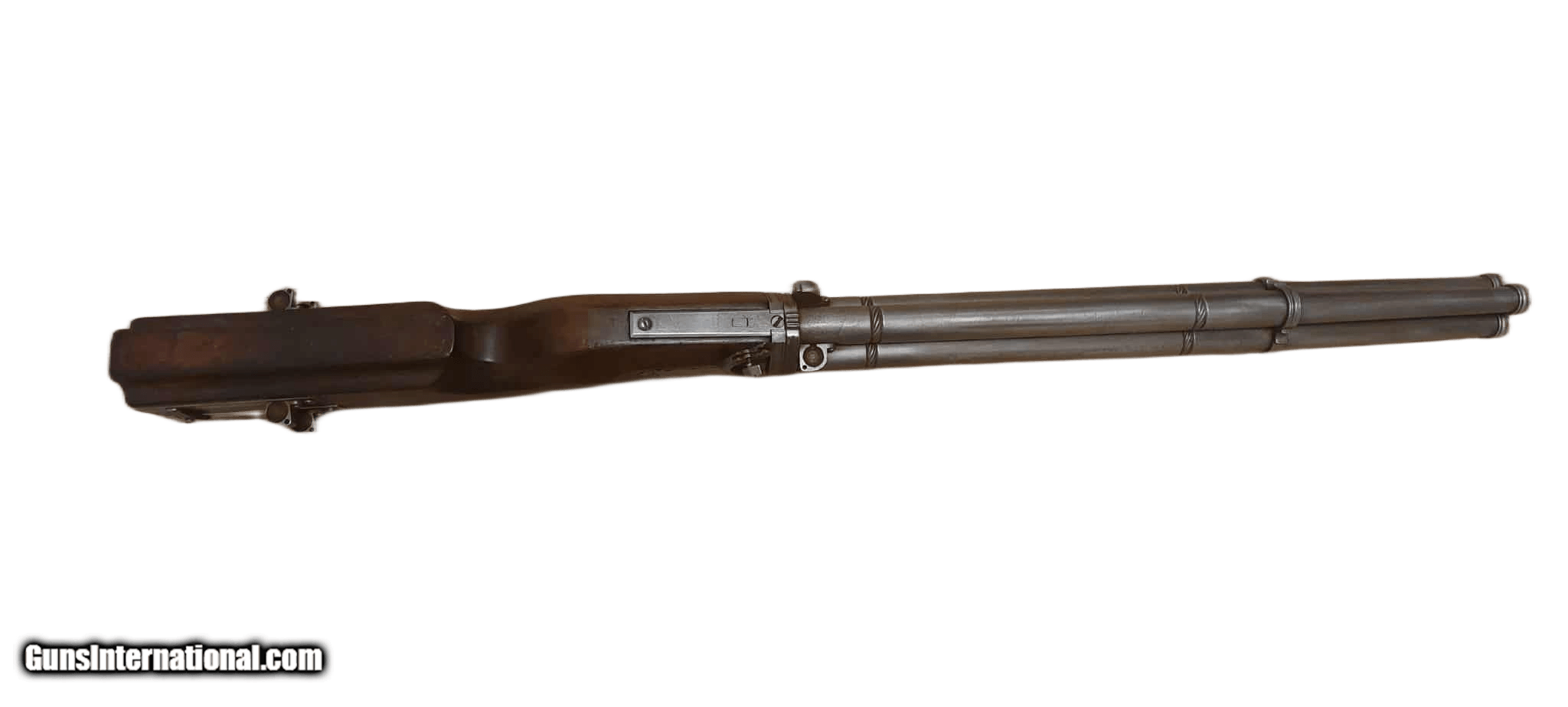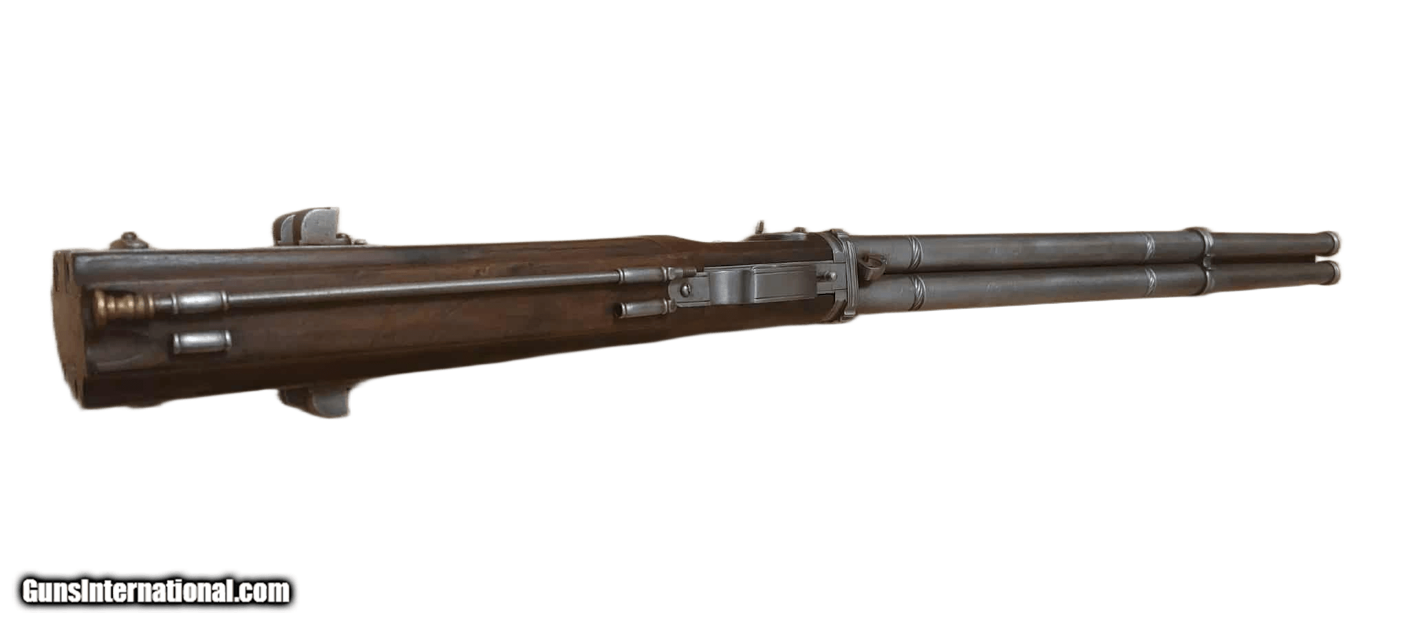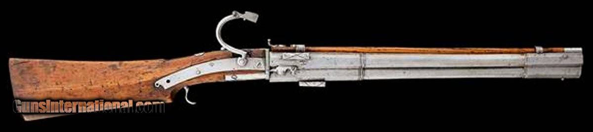 A very rare 7 barrel matchlock arquebuse musket with swiveling barrel and additional barrel in the butstock
