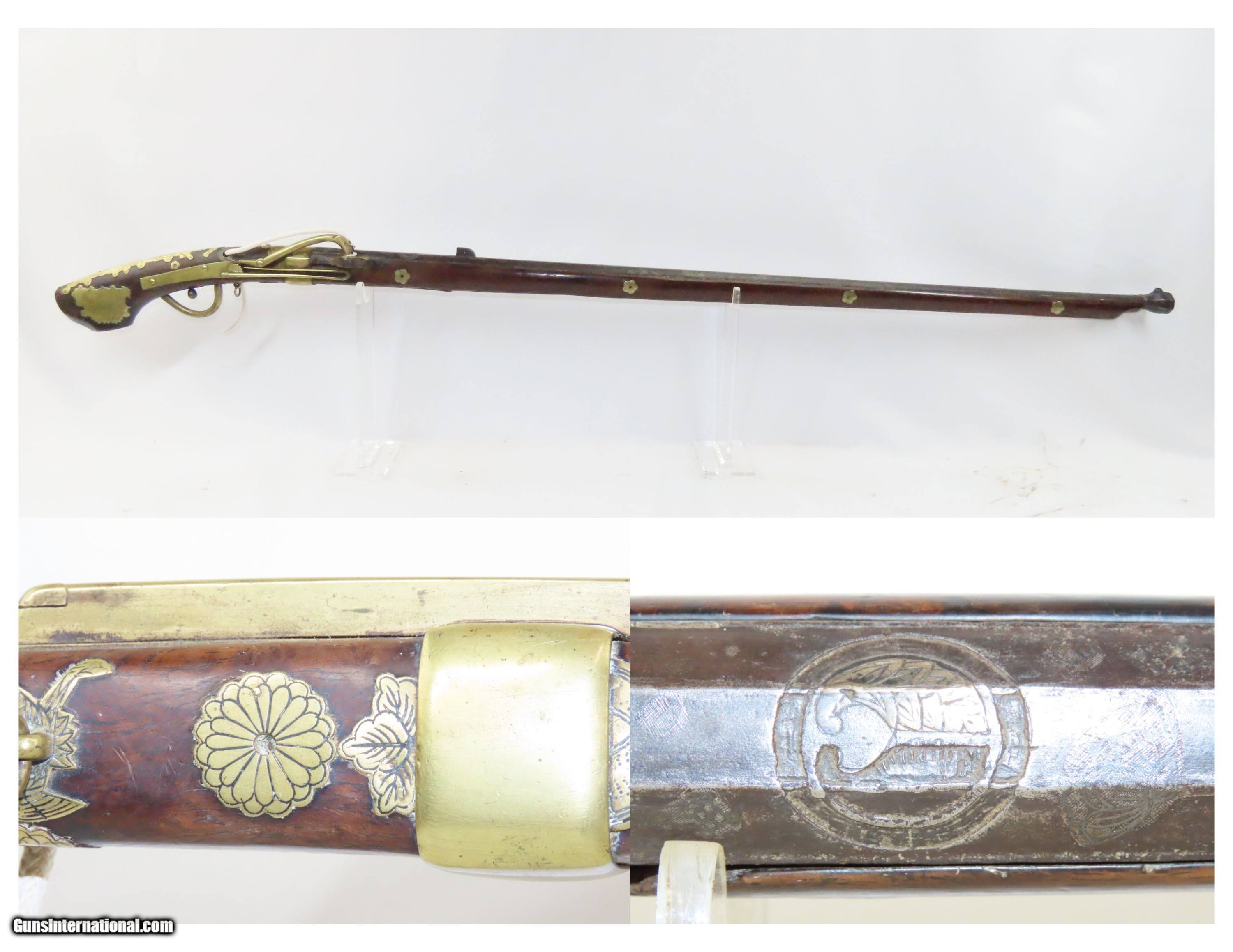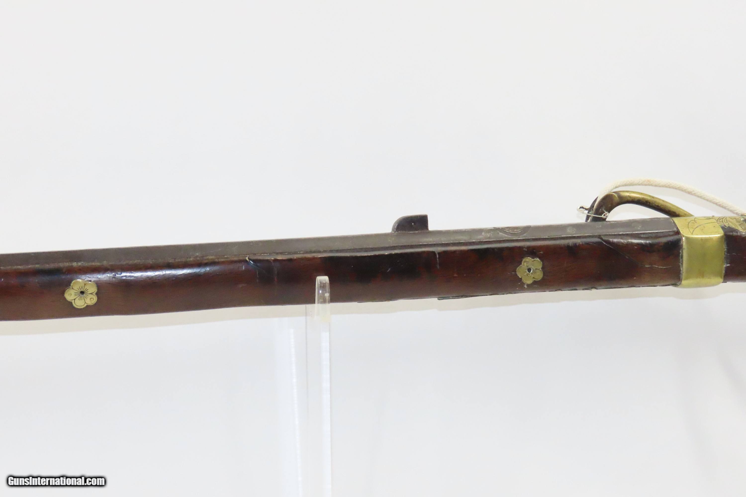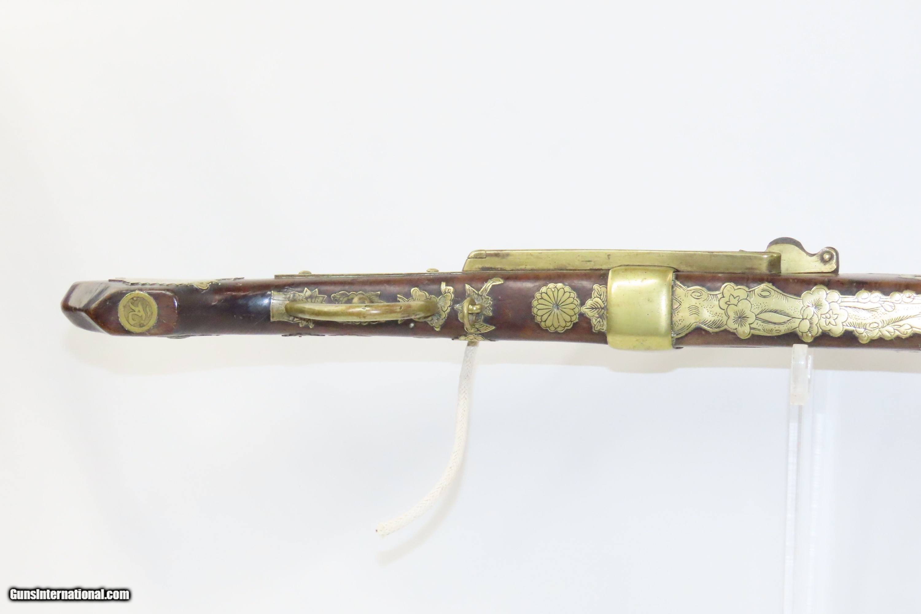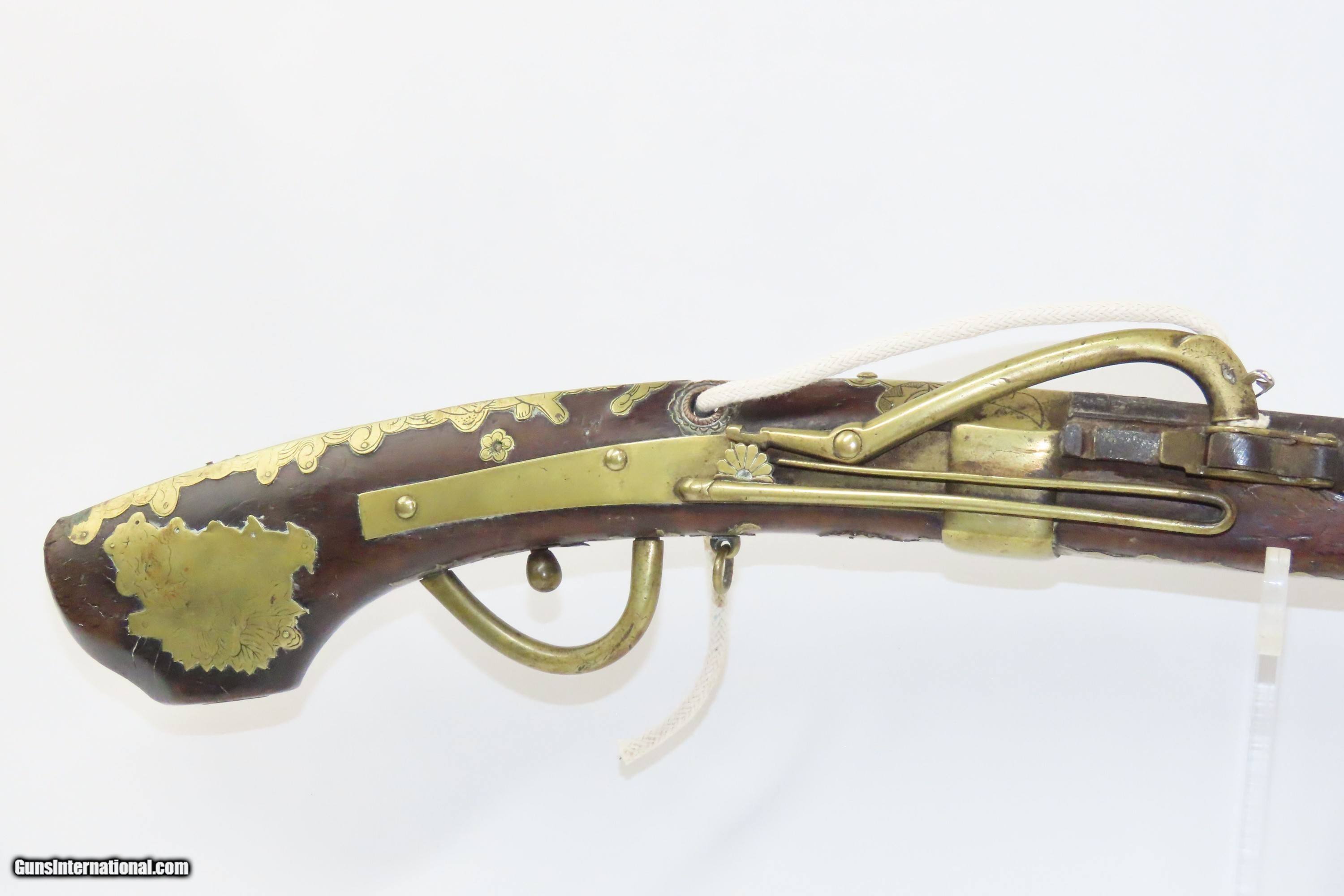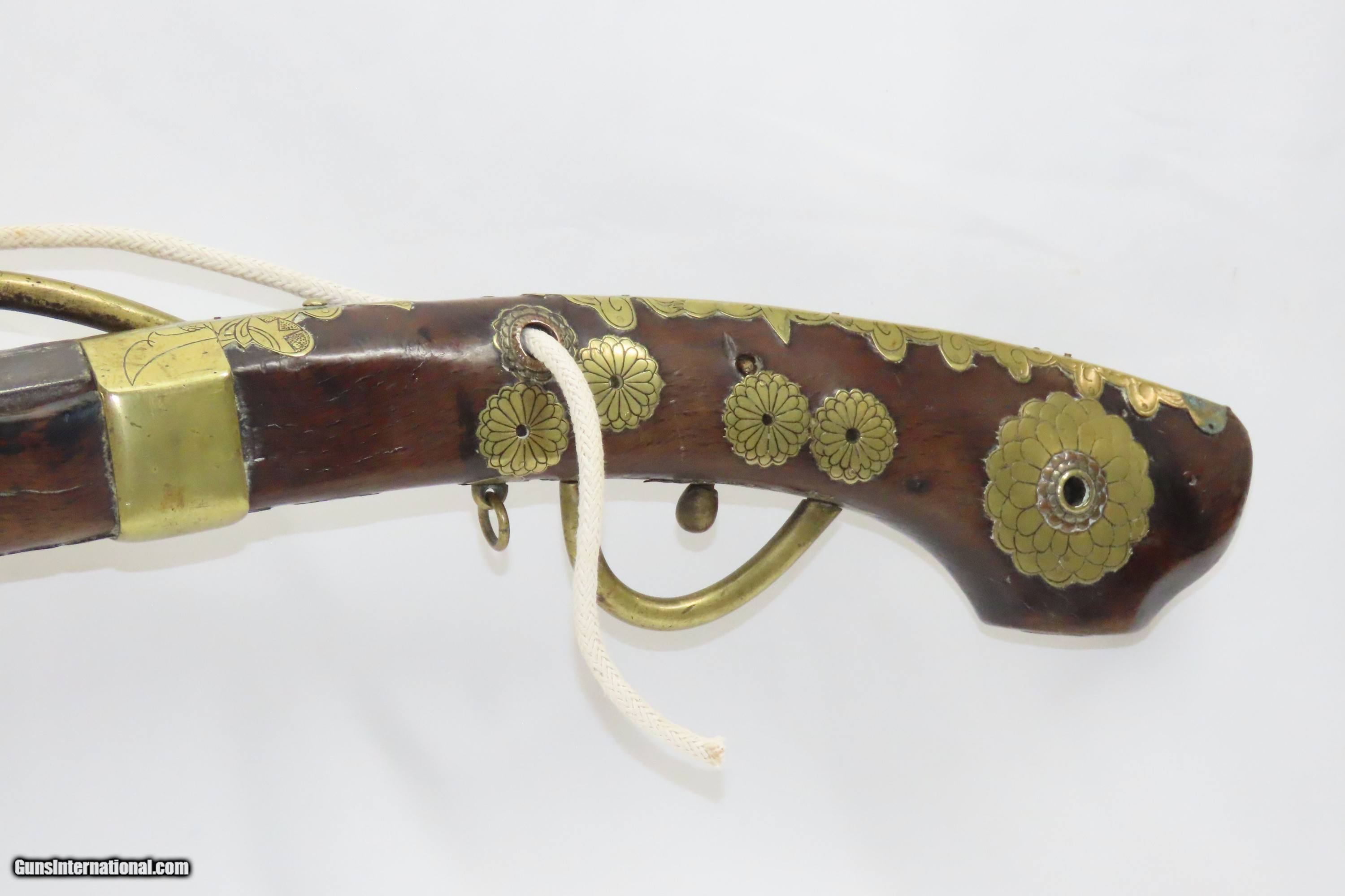 Description: Engraved SCARCE Antique JAPANESE “Tanegashima” Matchlock ARQUEBUS Musket ORNATE Fascinating Ancient Weaponry w/INLAID STOCK Here we present an antique Japanese Tanegashima Matchlock Arquebus Musket. This was a more refined matchlock musket that utilized a lock and trigger mechanism instead of the more primitive hand-held match. Use of this type of firearm in Japan dates to the mid-16th Century, when the Portuguese brought this 15th Century European concept to the shores of the Japanese Island of Tanegashima, for which the musket is named. With just a few examples Japanese swordsmiths were able to duplicate and produce their own on a large scale, forever changing how wars would be fought in Japan by the end of the 16th Century. They proved decisive in settling the internal wars, so that Japan lived in relative peace and isolation for the next 250 years. The Tanegashima continued to be produced and used until about the end of the Edo Period, when Commodore Perry established contact in the mid-19th Century. Conflict again rose to the surface but was decided by modern weapons of the period. This is a very interesting weapon when comparing to those most of us are familiar with today. These were not shoulder-fired weapons, so they do not have a provision to brace the stock against one’s body. A braided cord, known as the “slow match”, would have a burning ember at the end. The slow match is held by the spring-loaded arm known as the “serpentine”. The serpentine is put into the cocked position when ready to fire, and the hinged cover moved from over the flash pan. A simple pull of the trigger plunged the serpentine and the slow match into the flash pan, detonating the charge within the gun. The top of the barrel bears beautiful floral décor inlayed into the barrel. The overall condition is very good. Original patina. The action is functional. The bore is smooth and patinated. The stock has an old chip on the left side and is otherwise solid. Own the original! This is a legitimate antique and not a reproduction. Barrel is 41-3/4 inches. Caliber: .58 Matchlock Overall condition as seen in photos. Very Fast. Very Safe. FREE SHIPPING WORLDWIDE. Delivered directly to your door by express mail! Guaranteed AUTHENTIC & Includes CERTIFICATE OF AUTHENTICITY. ancestryguns $2400 #230395 SOLD Antique: Yes |