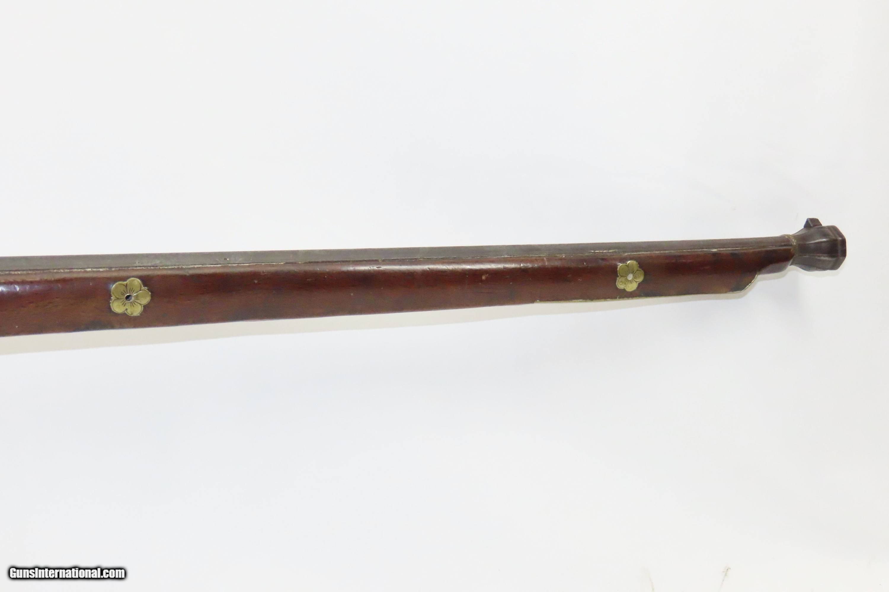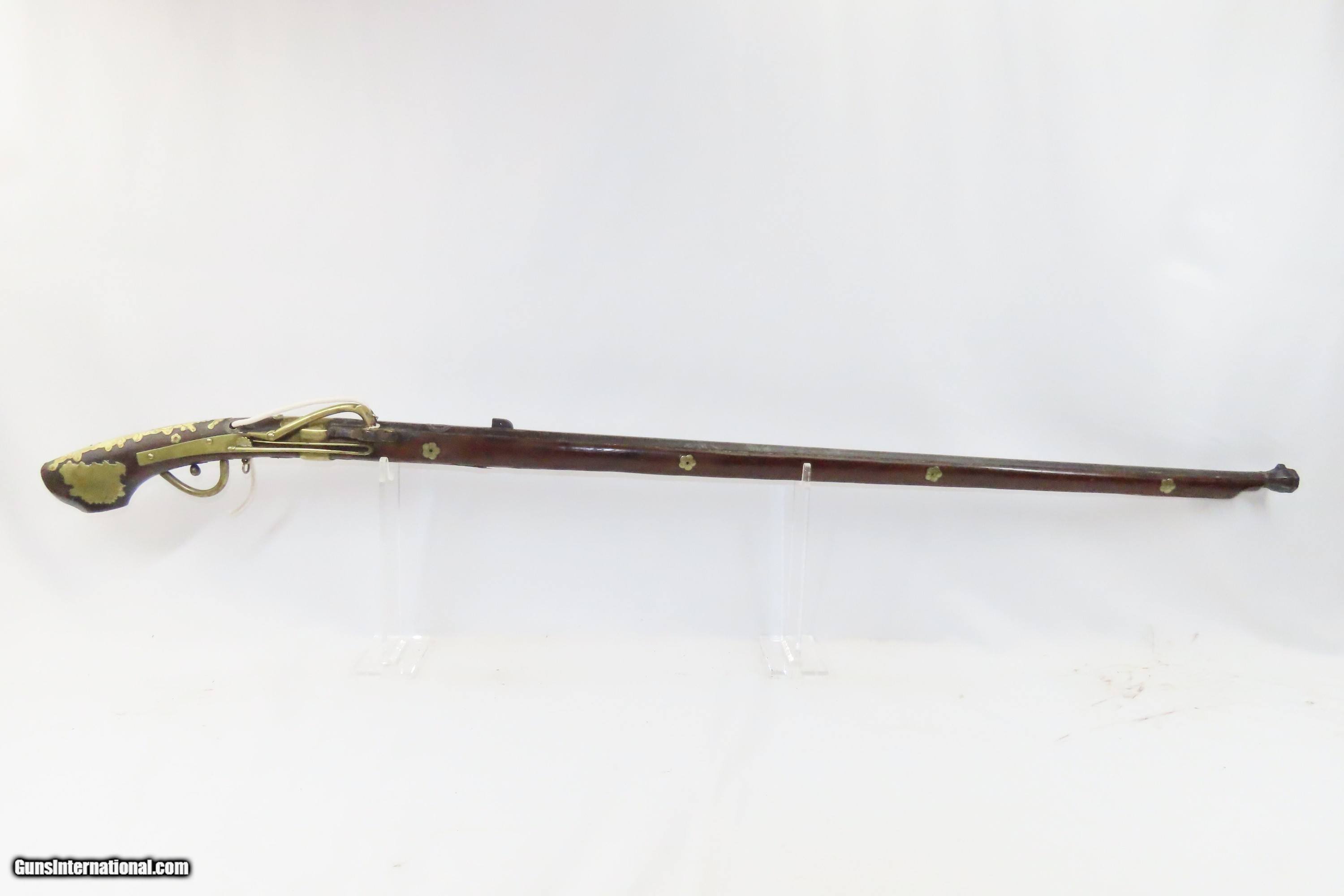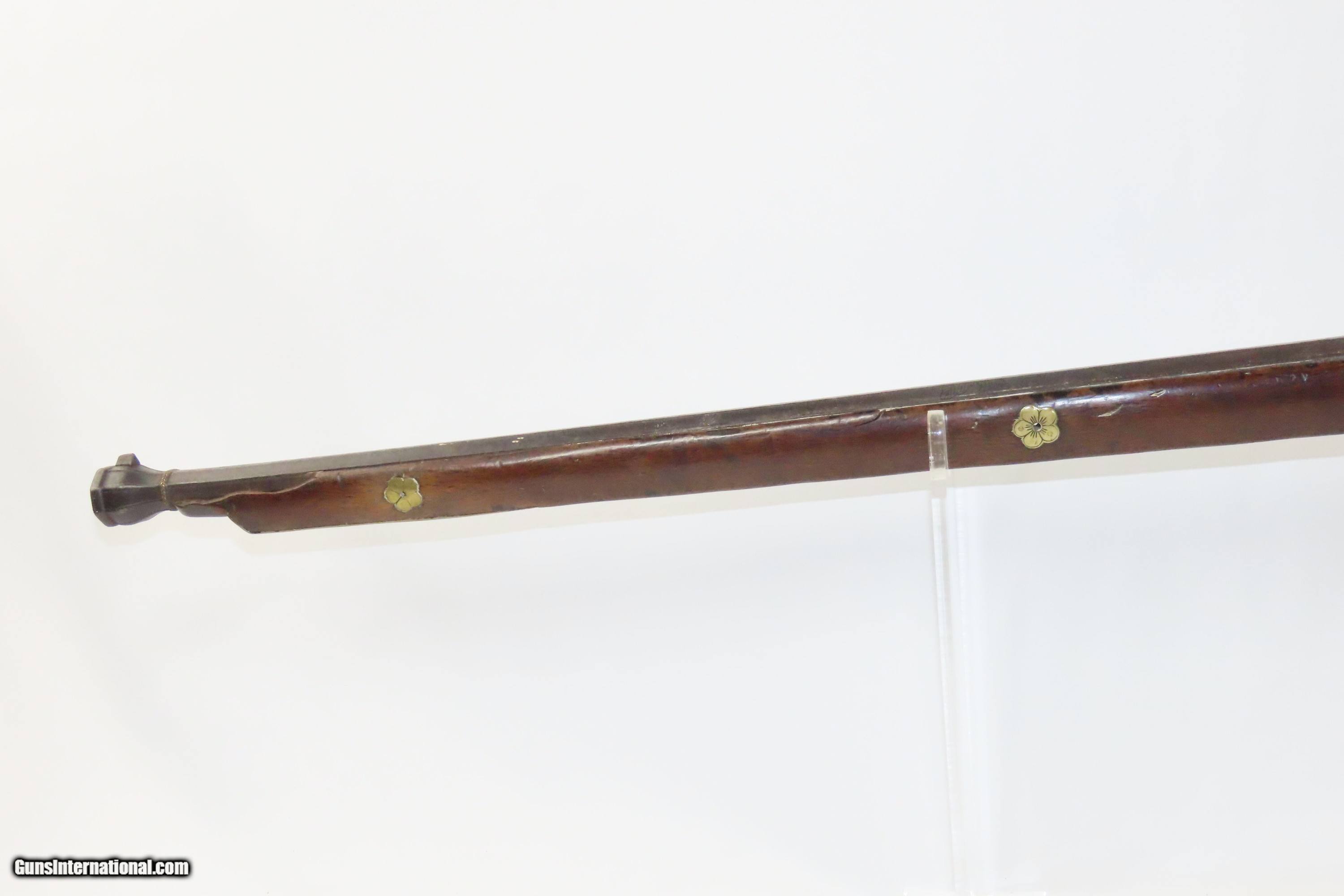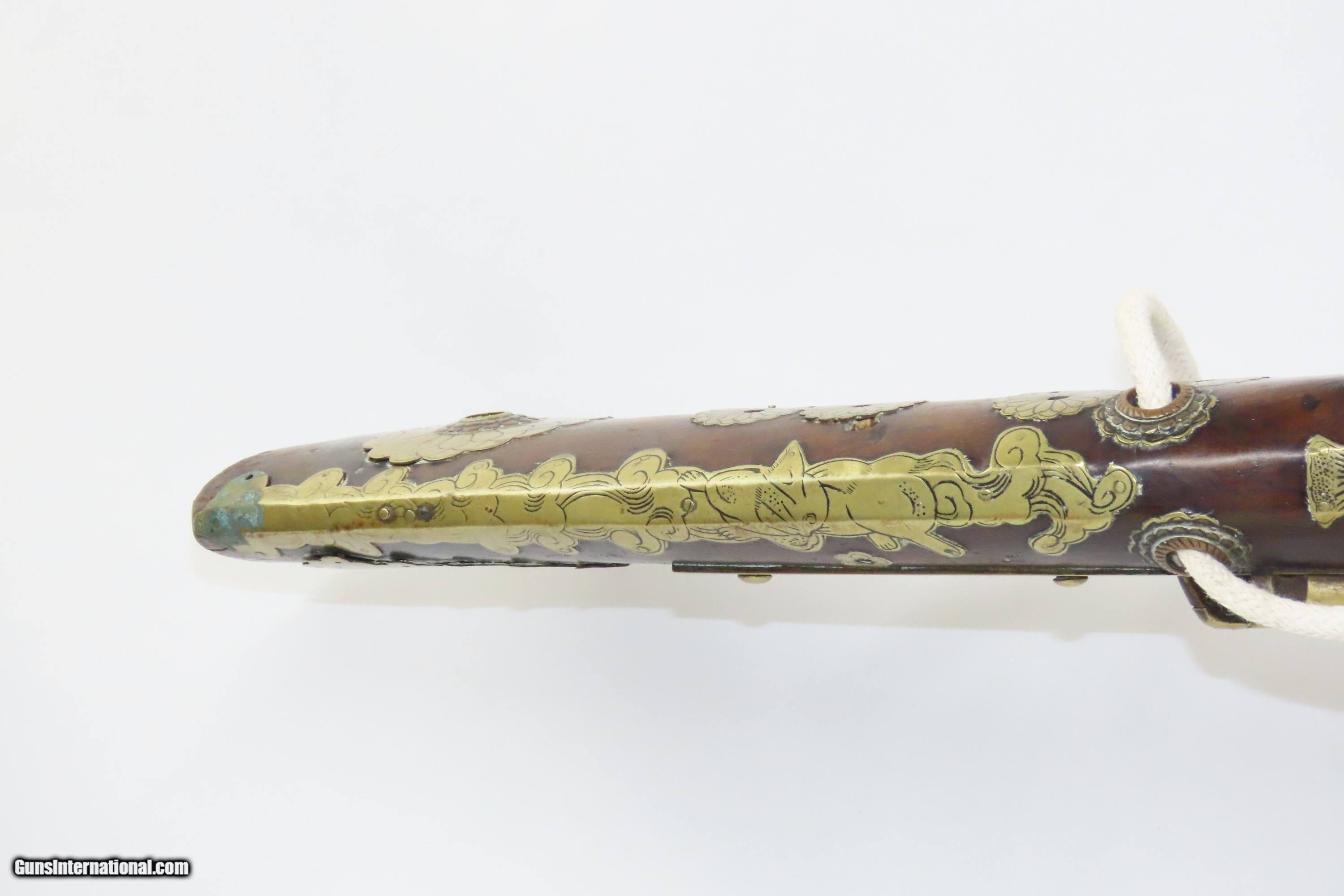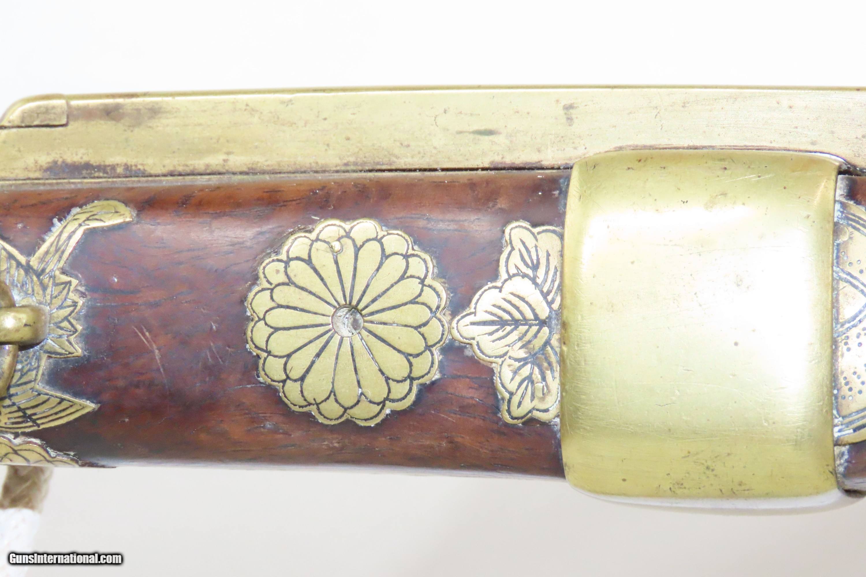 Description: Engraved SCARCE Antique JAPANESE “Tanegashima” Matchlock ARQUEBUS Musket ORNATE Fascinating Ancient Weaponry w/INLAID STOCK Here we present an antique Japanese Tanegashima Matchlock Arquebus Musket. This was a more refined matchlock musket that utilized a lock and trigger mechanism instead of the more primitive hand-held match. Use of this type of firearm in Japan dates to the mid-16th Century, when the Portuguese brought this 15th Century European concept to the shores of the Japanese Island of Tanegashima, for which the musket is named. With just a few examples Japanese swordsmiths were able to duplicate and produce their own on a large scale, forever changing how wars would be fought in Japan by the end of the 16th Century. They proved decisive in settling the internal wars, so that Japan lived in relative peace and isolation for the next 250 years. The Tanegashima continued to be produced and used until about the end of the Edo Period, when Commodore Perry established contact in the mid-19th Century. Conflict again rose to the surface but was decided by modern weapons of the period. This is a very interesting weapon when comparing to those most of us are familiar with today. These were not shoulder-fired weapons, so they do not have a provision to brace the stock against one’s body. A braided cord, known as the “slow match”, would have a burning ember at the end. The slow match is held by the spring-loaded arm known as the “serpentine”. The serpentine is put into the cocked position when ready to fire, and the hinged cover moved from over the flash pan. A simple pull of the trigger plunged the serpentine and the slow match into the flash pan, detonating the charge within the gun. The top of the barrel bears beautiful floral décor inlayed into the barrel. The overall condition is very good. Original patina. The action is functional. The bore is smooth and patinated. The stock has an old chip on the left side and is otherwise solid. Own the original! This is a legitimate antique and not a reproduction. Barrel is 41-3/4 inches. Caliber: .58 Matchlock Overall condition as seen in photos. Very Fast. Very Safe. FREE SHIPPING WORLDWIDE. Delivered directly to your door by express mail! Guaranteed AUTHENTIC & Includes CERTIFICATE OF AUTHENTICITY. ancestryguns $2400 #230395 SOLD Antique: Yes |