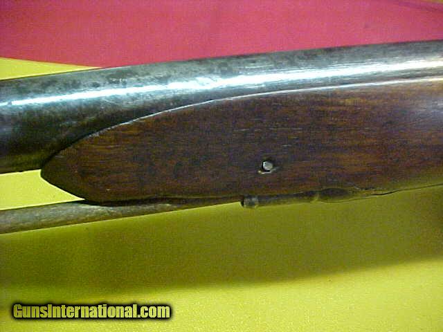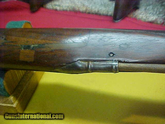 Description: #1498 Germanic 1850-1860s era rifled percussion musket conversion to trade fowler or “buck-n-ball” gun. Looks like a Postdam style military longarm that was later converted for a cheap frontier weapon, as it has a 36” rifled barrel with the wide lands common in that period, although with a barrel about the thickness of a modern-day shotgun, it would seemingly be rather dangerous to be used with a solid projectile …plus the recoil on such a light barrel would be horrendous! The bore, while having scattered light pitting the full length, does still have pretty decent rifling and the action seems solid and tight. The exterior has an even brownish-grey patina on good metal; the wood has several well-done repairs but looks to be very solid and serviceable. After the blessings of a competent black-powder gunsmith, this should be a good fowling piece for those into the “Rendesvous Reinacting” as well as a GREAT wall-hanger in someones Man-Cave or cabin fireplace mantle, especially when teamed with an antique leather shot pouch and steer horn flask. About “VG” as described. $295 SOLD Antique: Yes |