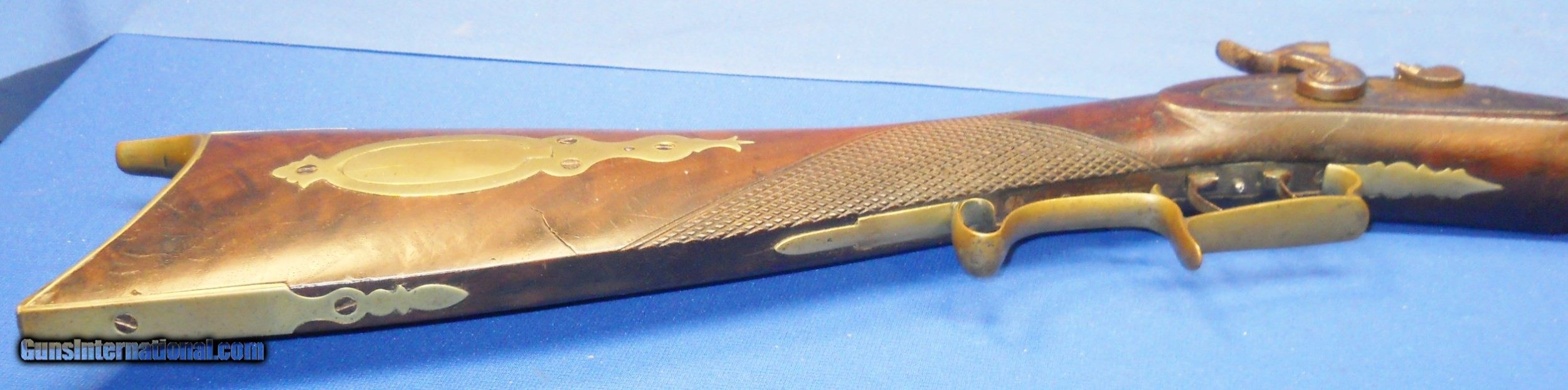 Description: ANTIQUE PERCUSSION HALF STOCK .44 CALIBER SPORTING RIFLE MARKED "DIESINGER, PHILADA" ON 30" OCTAGON BAREL, BORE SHOWS DISTINCT RIFLING WITH OXIDATION. OVERALL DEEP PLUM SOFT BROWN PATINA HAVING LIGHT OXIDATION AND TYPICAL PITTING AROUND THE NIPPLE AREA. LOCKPLATE IS MARKED "WARRANTED" AND NAME "RY_E_LWELL" ? WALNUT STOCK IN VERY GOOD CONDITION FEATURING BRASS PENDULUM PATCHBOX, TRIGGERGUARD, BUTT & TOE PLATE. GERMAN SILVER NOSE CAP & ESCUTCHEONS. EXPECTED HANDLING, DINGS AND USE FROM THE AGES. DOUBLE SET TRIGGER LOCK IN GOOD WORKING ORDER. APPEARS THIS COULD BE RETURNED TO SERVICE IF WANTED. ABOUT 47" LONG. A RATHER HANDSOME AND REASONABLY PRICED RIFLE OVERALL, AS PICTURED. SHIPS DIRECT TO BUYER ALL 50 WHERE OK ! S&H $50.00 PRIORITY INSURED. SOLD Antique: Yes Manufacturer: DIESINGER |
