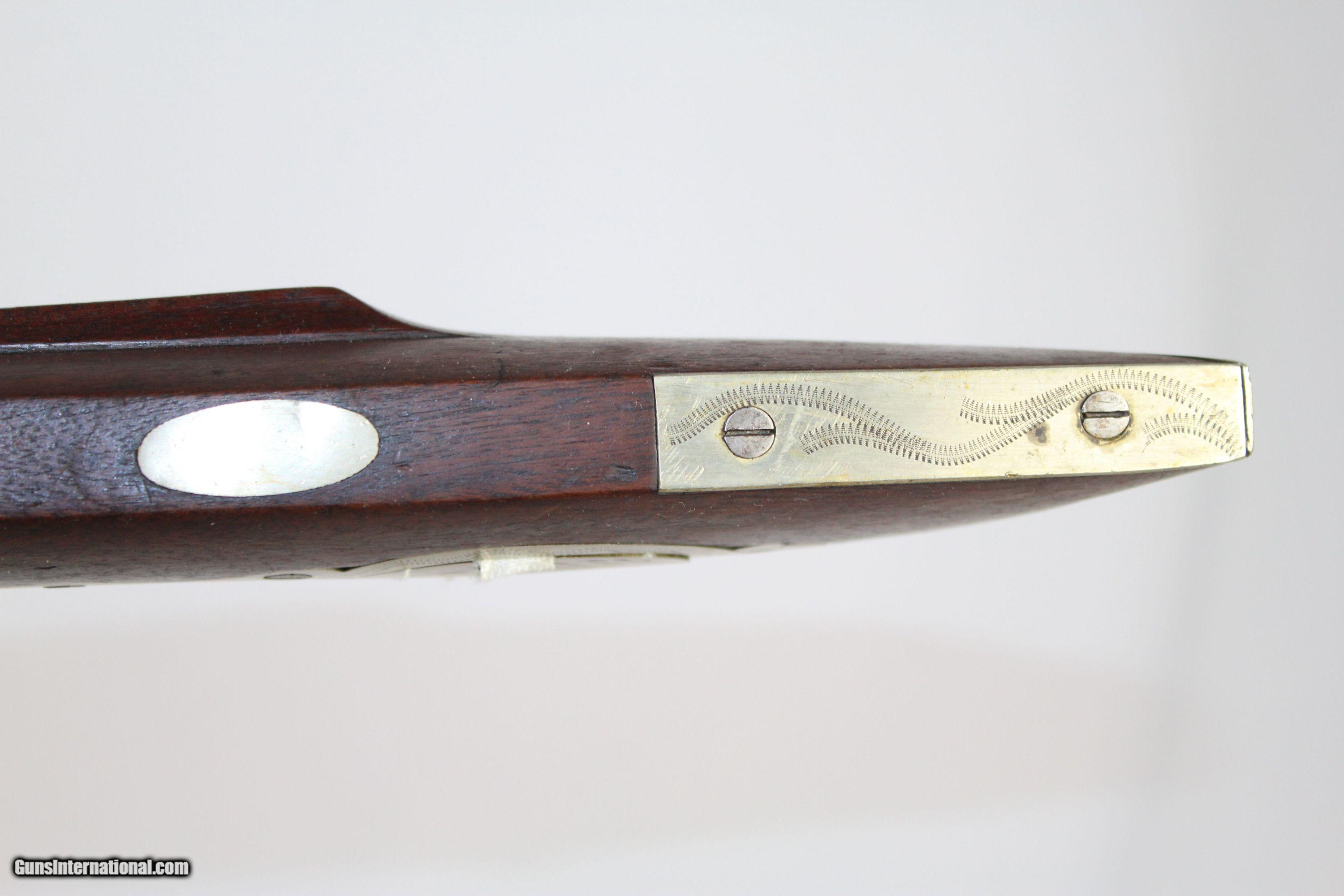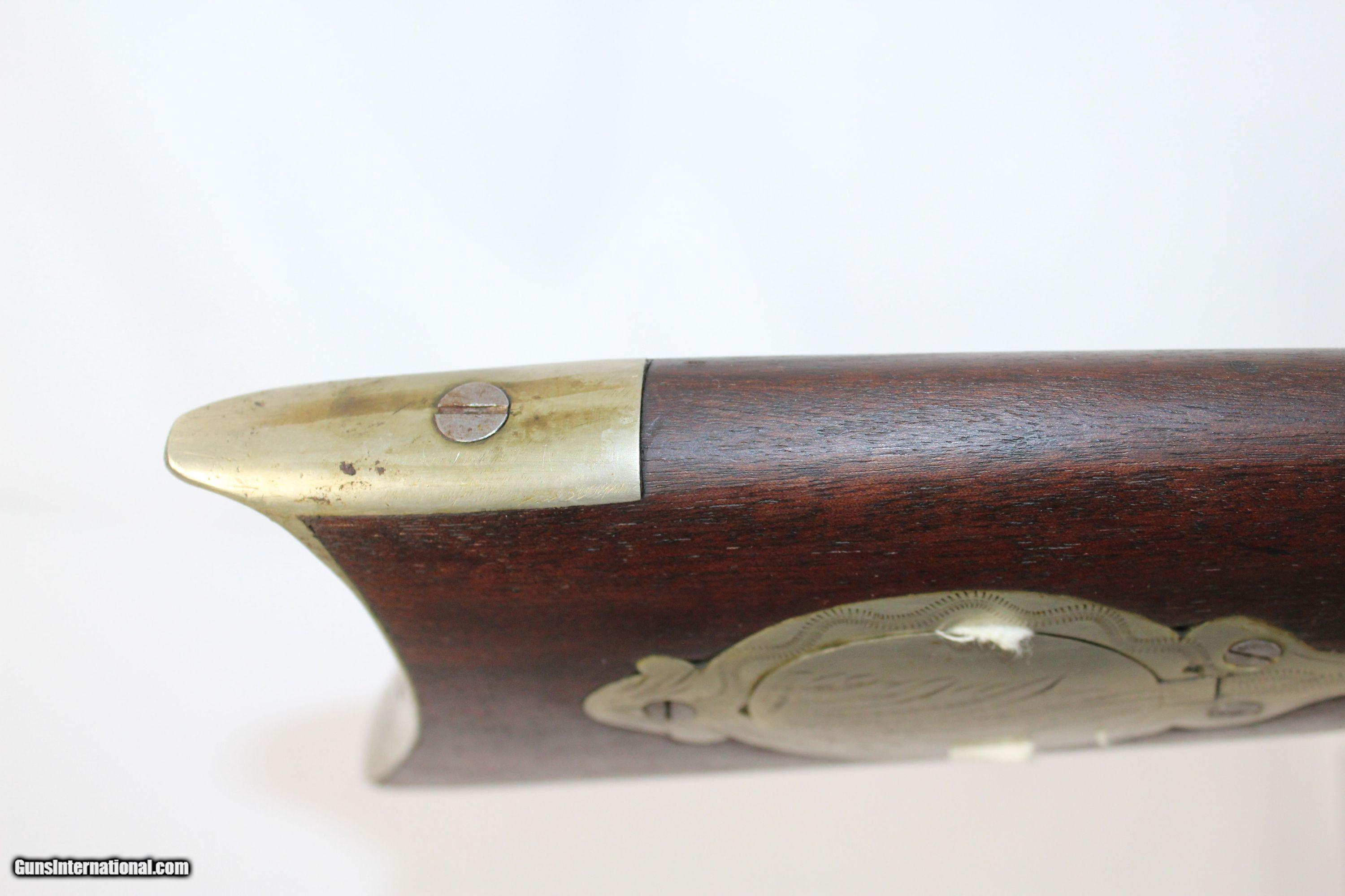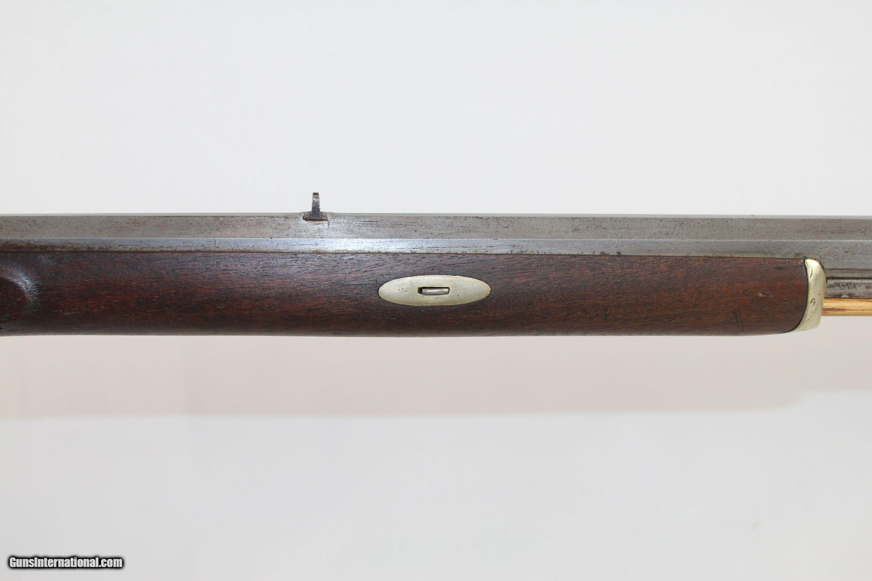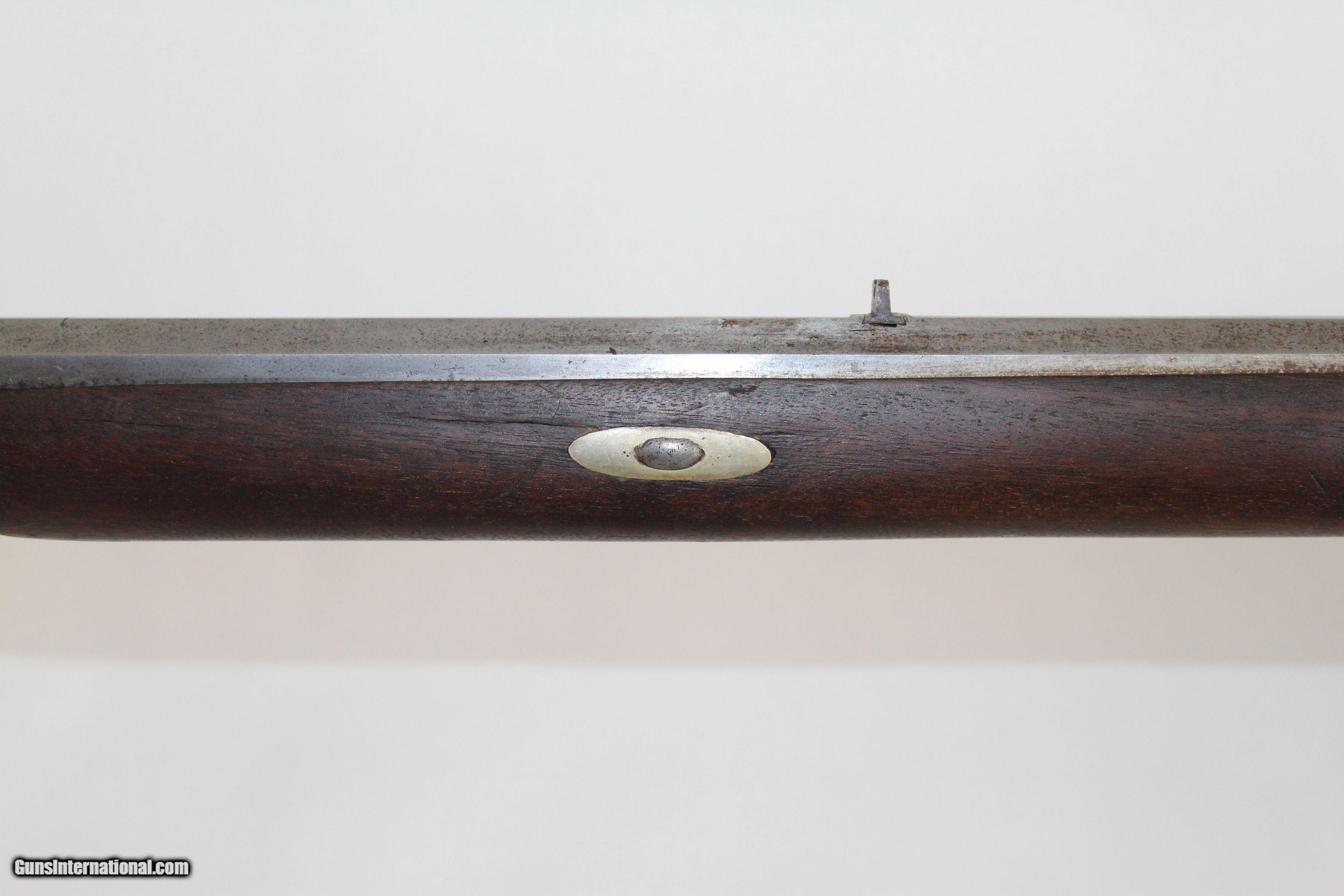 Description: “H. ELWELL” of OH “TYRON” of PA Marked Long Rifle Very Nice .32 Percussion Used Recently on Squirrels! Here we present an antique Half Stock .32 Caliber Percussion Rifle. The lock is marked “H. ELWELL/WARRANTED”. This was the work of Henry Elwell of Seneca County, Ohio. The other hardware of the rifle was made by Edward K. Tryon of Philadelphia, Pennsylvania. The previous owner attributes the build to the mid-19th Century and his letter describing the gun is included. He used this rifle to hunt squirrels and provides his favorite load on the letter. This .32 caliber rifle is simple and elegant, with a pewter cap on the fore end, and lightly engraved patch box, butt plate, trigger guard, etc. “TRYON” is marked on the inside of the patch box door. The lock is marked by its maker, Henry Elwell, as stated above, and decorated with scroll and game scene. For precision shooting this rifle is equipped with a longer, heavier octagonal barrel and a double set trigger. Overall condition is very good. Corners on the octagonal barrel are sharp. Markings are clear and legible. The walnut stock is smooth. The bore has sharp rifling and is clean. The action is excellent. Own the original! This is a legitimate antique and not a reproduction. Barrel is 30-3/4 inches in length. Caliber: .32 Percussion Overall condition as seen in photos. Very Fast. Very Safe. FREE SHIPPING WORLDWIDE. Delivered directly to your door by express mail! Guaranteed AUTHENTIC & Includes CERTIFICATE OF AUTHENTICITY. ancestryguns $1500 #5470 SOLD Antique: Yes |