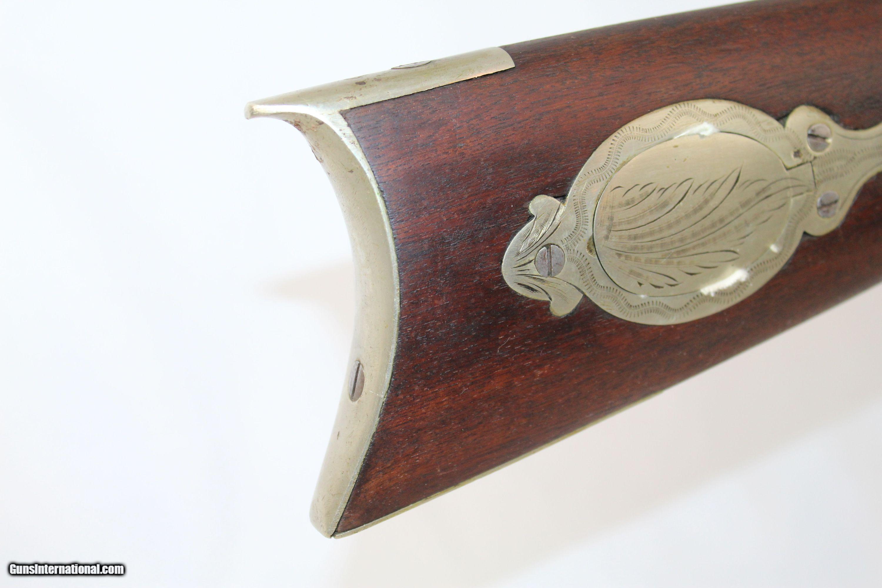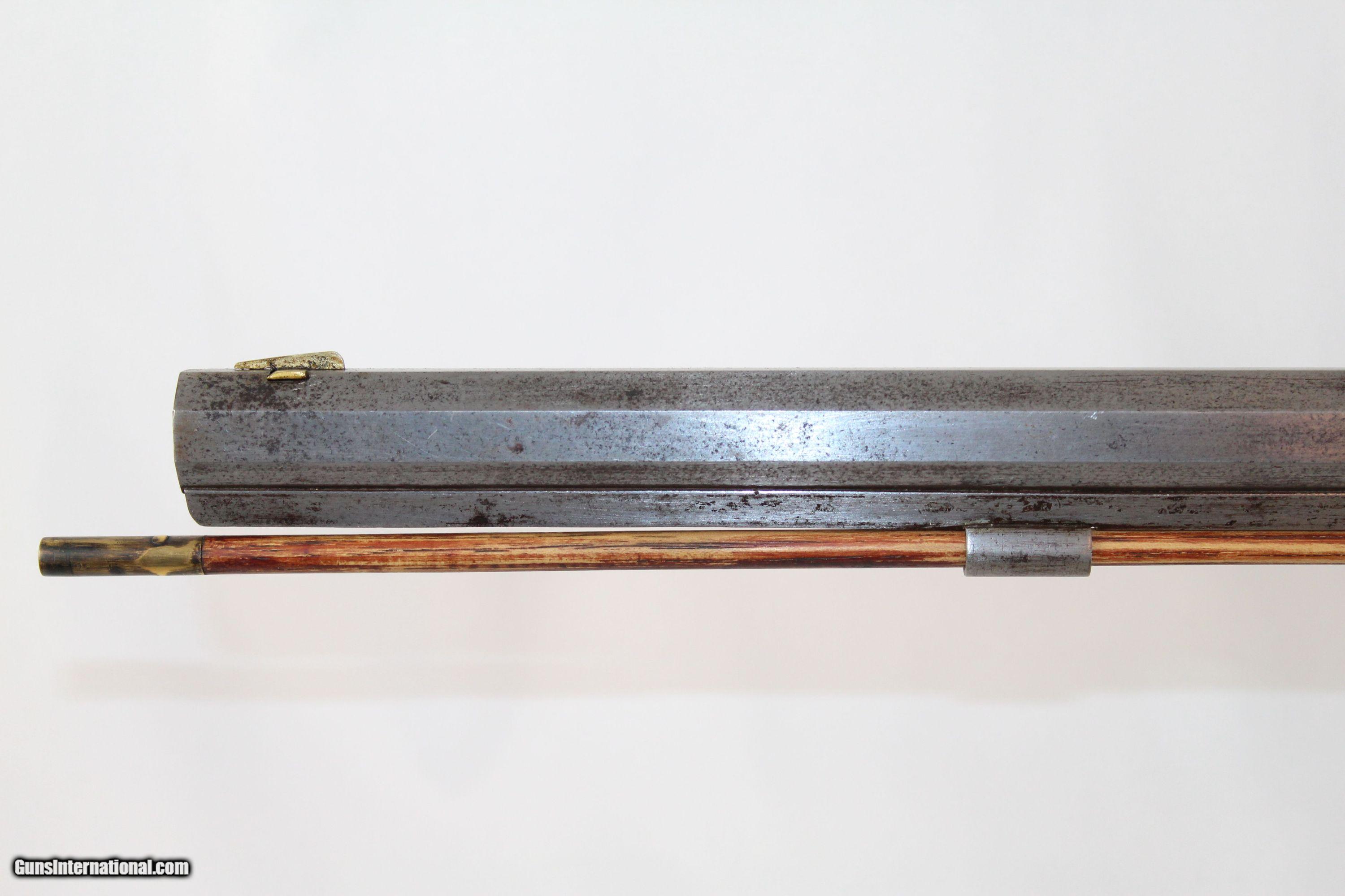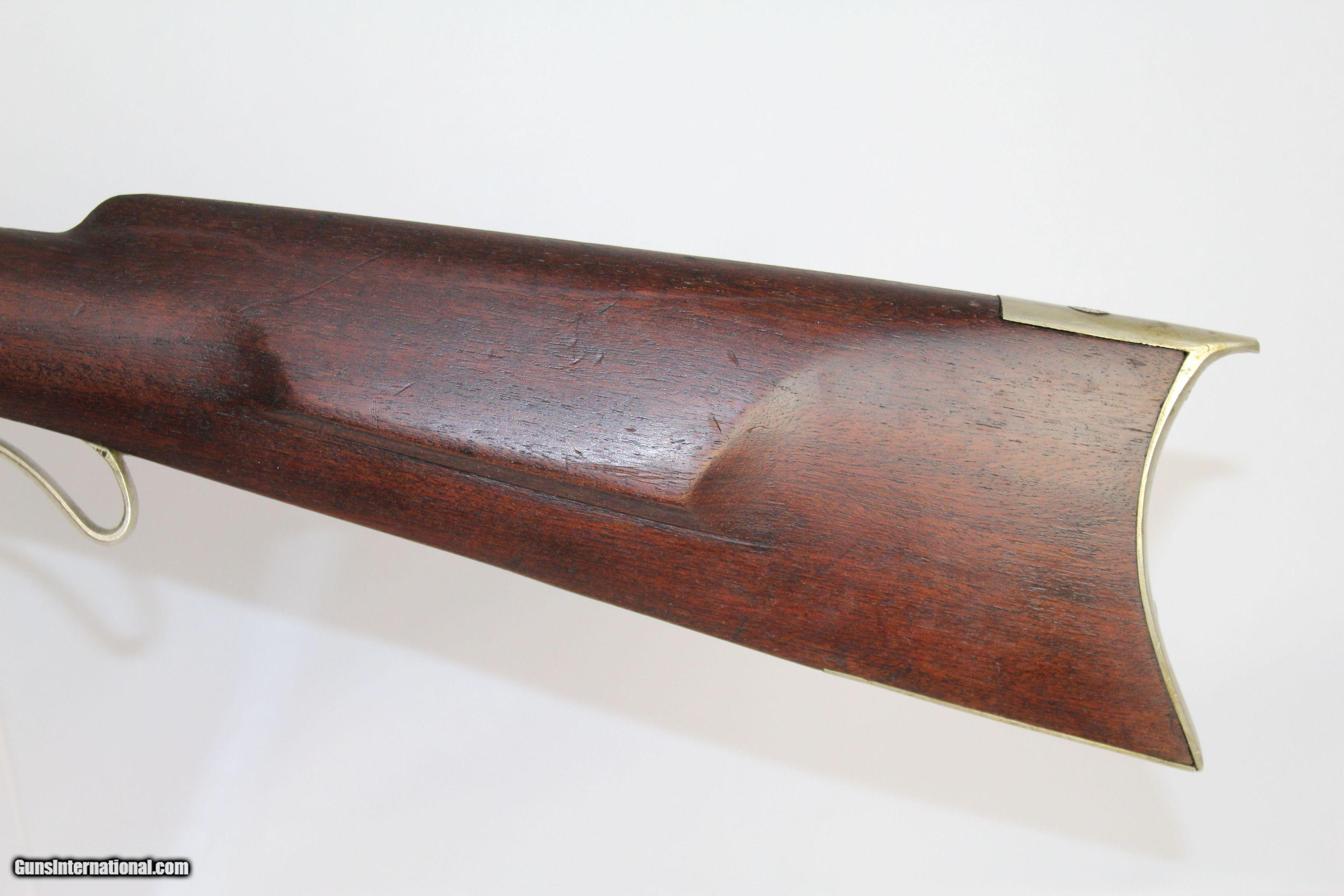 Description: “H. ELWELL” of OH “TYRON” of PA Marked Long Rifle Very Nice .32 Percussion Used Recently on Squirrels! Here we present an antique Half Stock .32 Caliber Percussion Rifle. The lock is marked “H. ELWELL/WARRANTED”. This was the work of Henry Elwell of Seneca County, Ohio. The other hardware of the rifle was made by Edward K. Tryon of Philadelphia, Pennsylvania. The previous owner attributes the build to the mid-19th Century and his letter describing the gun is included. He used this rifle to hunt squirrels and provides his favorite load on the letter. This .32 caliber rifle is simple and elegant, with a pewter cap on the fore end, and lightly engraved patch box, butt plate, trigger guard, etc. “TRYON” is marked on the inside of the patch box door. The lock is marked by its maker, Henry Elwell, as stated above, and decorated with scroll and game scene. For precision shooting this rifle is equipped with a longer, heavier octagonal barrel and a double set trigger. Overall condition is very good. Corners on the octagonal barrel are sharp. Markings are clear and legible. The walnut stock is smooth. The bore has sharp rifling and is clean. The action is excellent. Own the original! This is a legitimate antique and not a reproduction. Barrel is 30-3/4 inches in length. Caliber: .32 Percussion Overall condition as seen in photos. Very Fast. Very Safe. FREE SHIPPING WORLDWIDE. Delivered directly to your door by express mail! Guaranteed AUTHENTIC & Includes CERTIFICATE OF AUTHENTICITY. ancestryguns $1500 #5470 SOLD Antique: Yes |