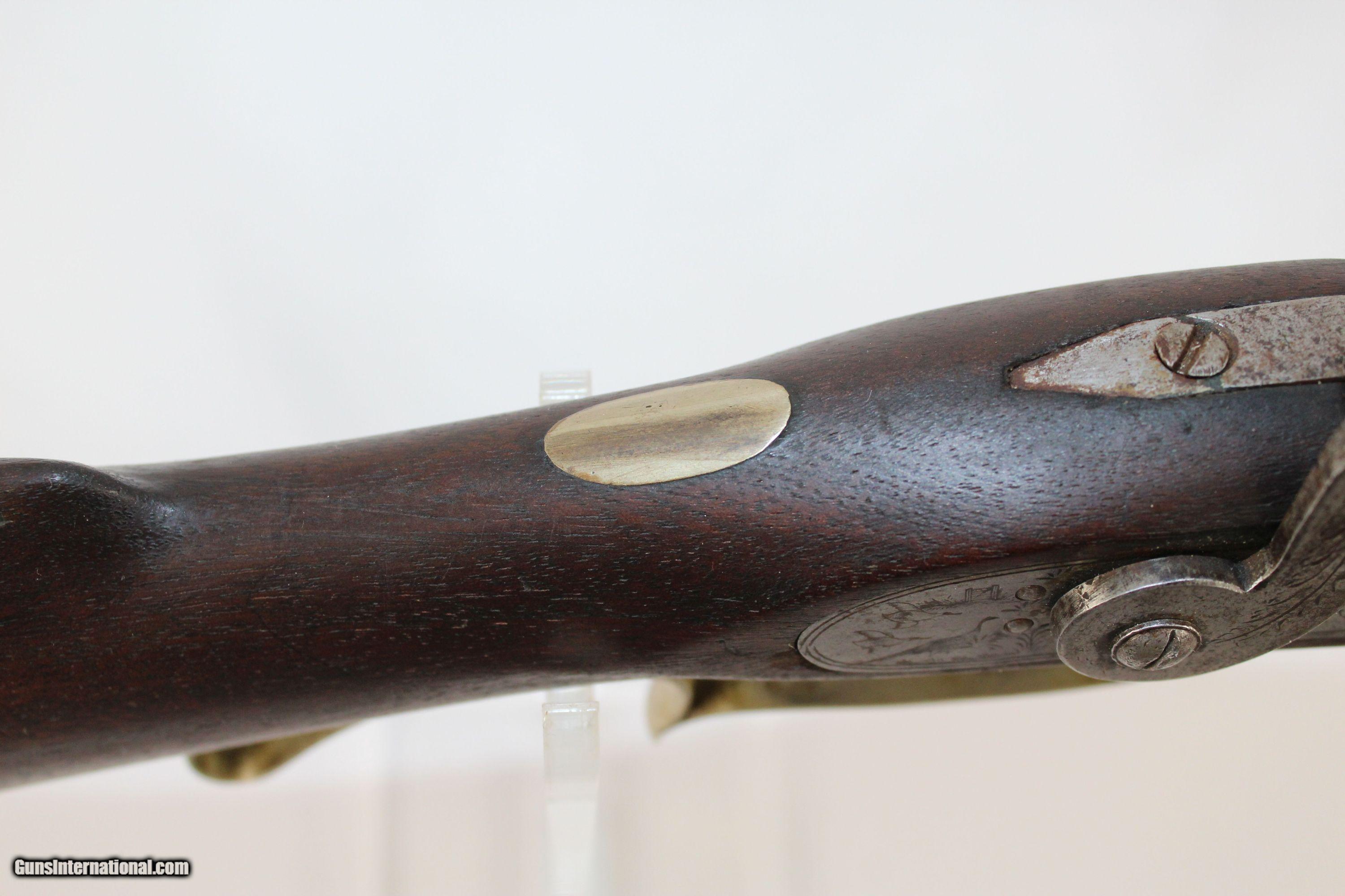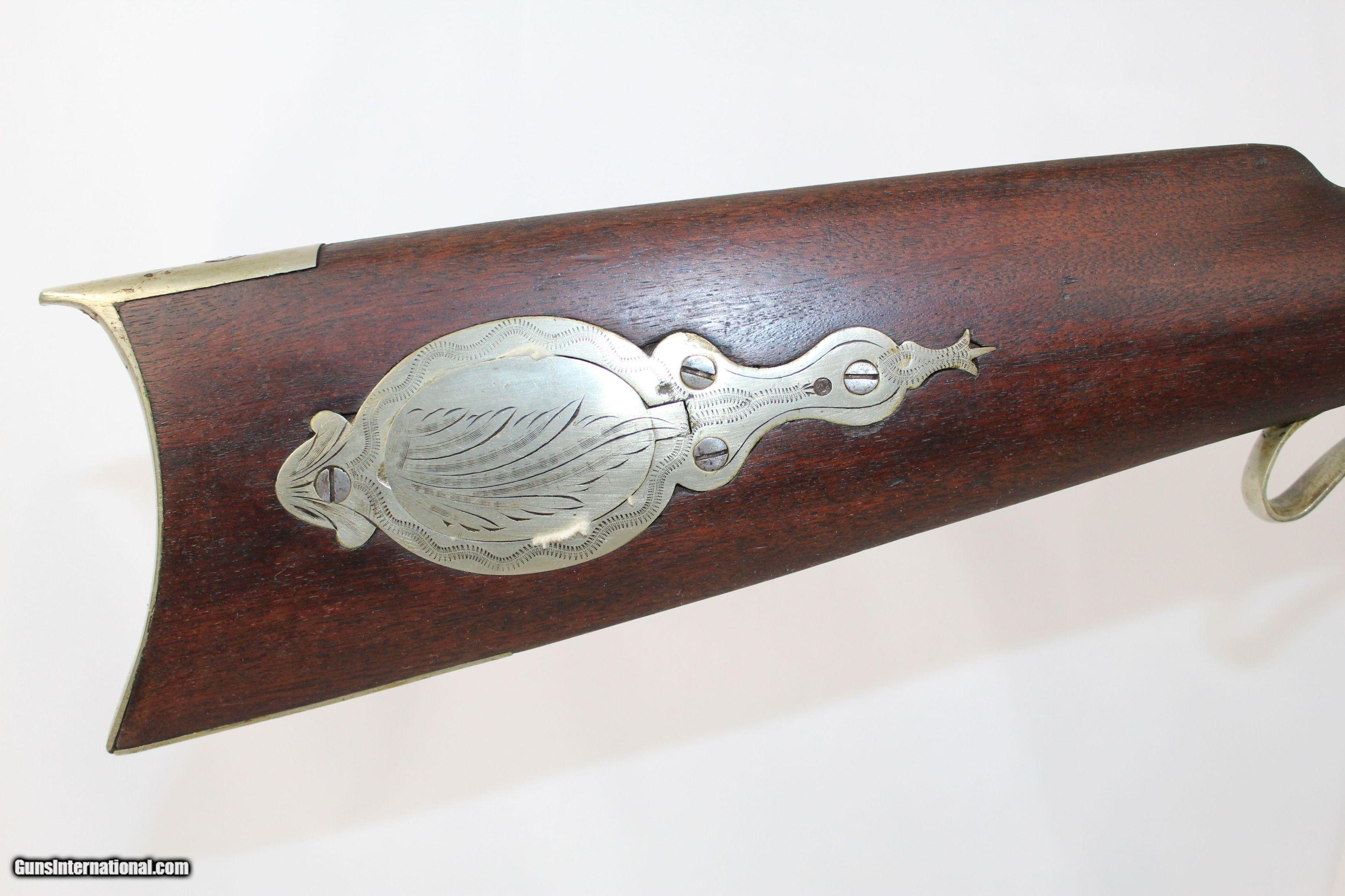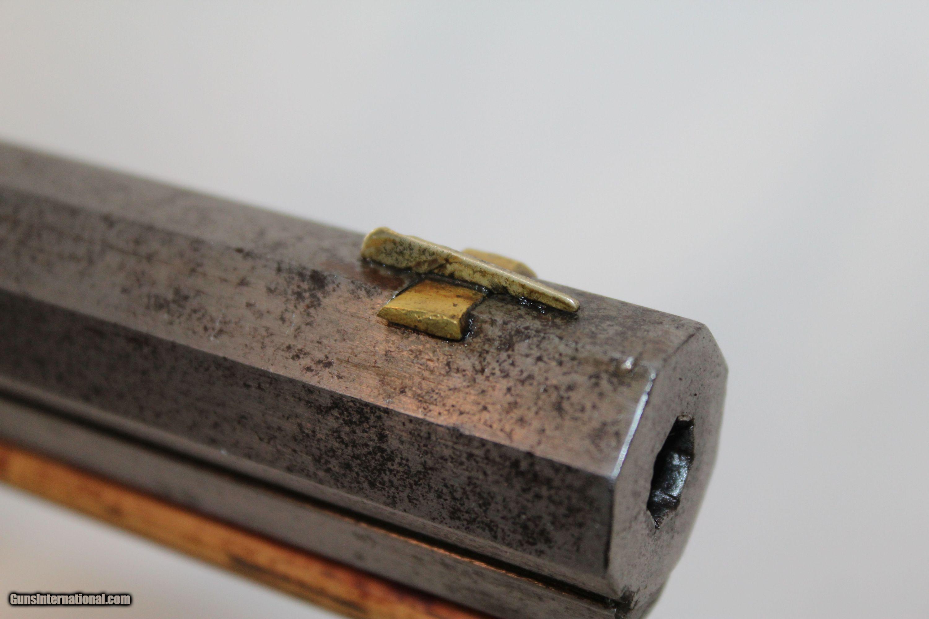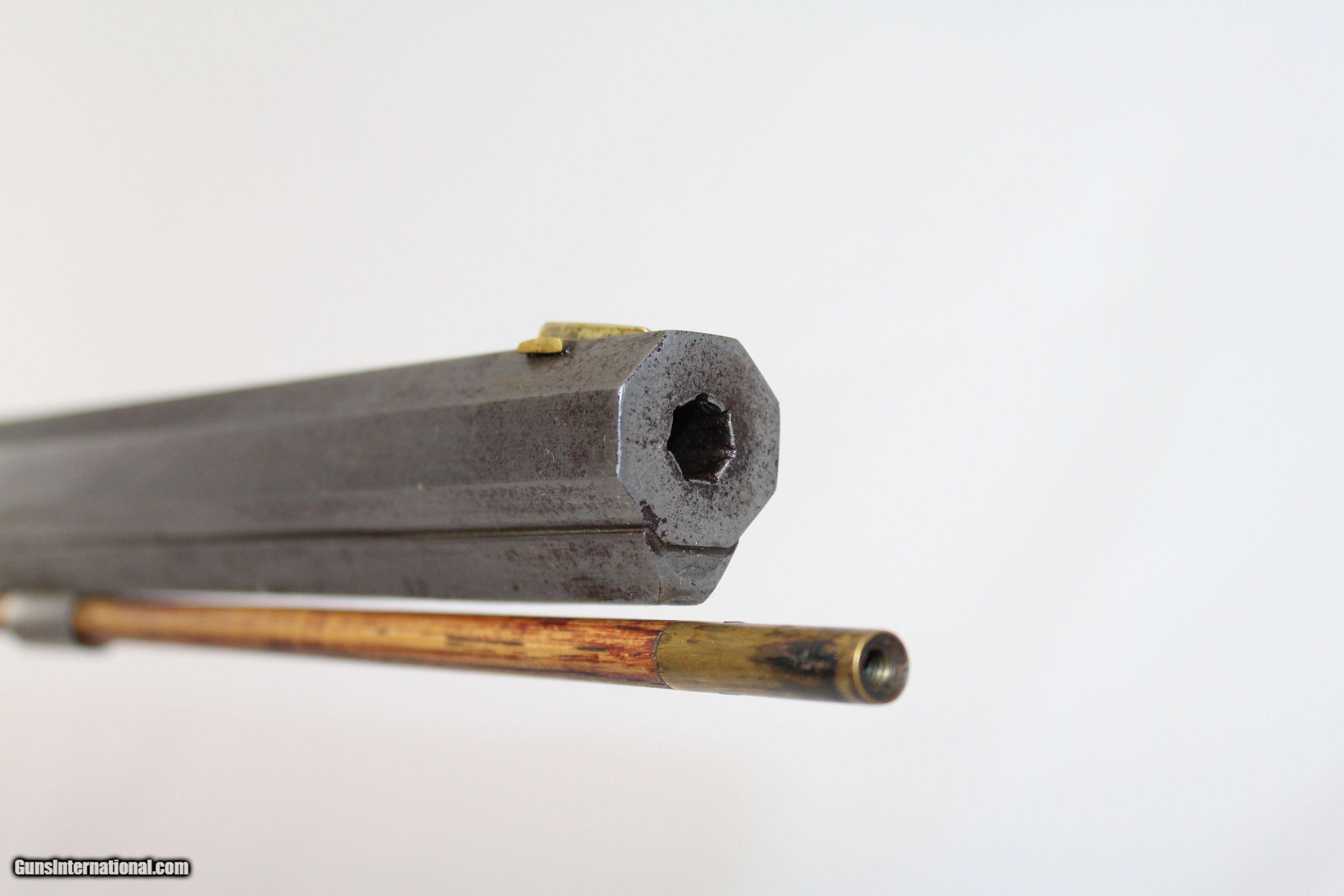 Description: “H. ELWELL” of OH “TYRON” of PA Marked Long Rifle Very Nice .32 Percussion Used Recently on Squirrels! Here we present an antique Half Stock .32 Caliber Percussion Rifle. The lock is marked “H. ELWELL/WARRANTED”. This was the work of Henry Elwell of Seneca County, Ohio. The other hardware of the rifle was made by Edward K. Tryon of Philadelphia, Pennsylvania. The previous owner attributes the build to the mid-19th Century and his letter describing the gun is included. He used this rifle to hunt squirrels and provides his favorite load on the letter. This .32 caliber rifle is simple and elegant, with a pewter cap on the fore end, and lightly engraved patch box, butt plate, trigger guard, etc. “TRYON” is marked on the inside of the patch box door. The lock is marked by its maker, Henry Elwell, as stated above, and decorated with scroll and game scene. For precision shooting this rifle is equipped with a longer, heavier octagonal barrel and a double set trigger. Overall condition is very good. Corners on the octagonal barrel are sharp. Markings are clear and legible. The walnut stock is smooth. The bore has sharp rifling and is clean. The action is excellent. Own the original! This is a legitimate antique and not a reproduction. Barrel is 30-3/4 inches in length. Caliber: .32 Percussion Overall condition as seen in photos. Very Fast. Very Safe. FREE SHIPPING WORLDWIDE. Delivered directly to your door by express mail! Guaranteed AUTHENTIC & Includes CERTIFICATE OF AUTHENTICITY. ancestryguns $1500 #5470 SOLD Antique: Yes |