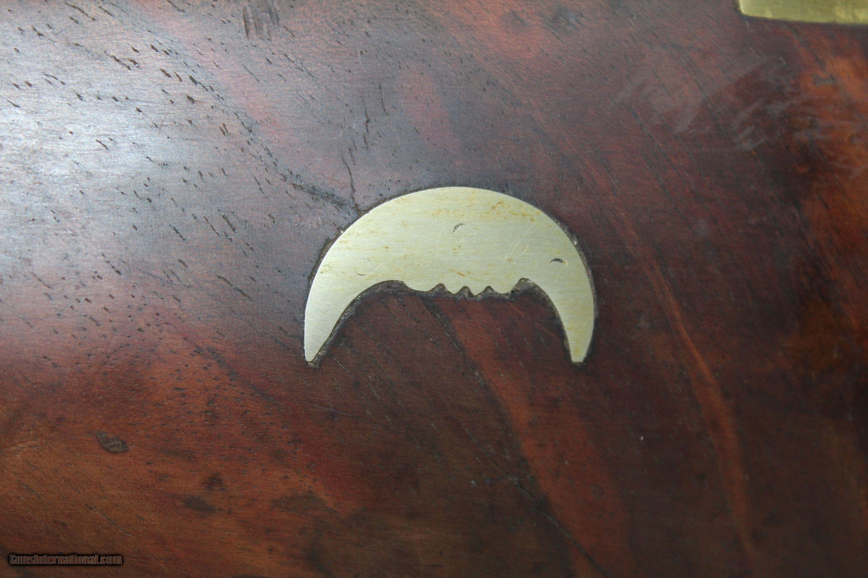 Description: “J. CULVER” Marked Half Stock AMERICAN Long Rifle New York Style Rifle with George Goulcher Lock Here we present an antique “J. CULVER” Half Stock American Long Rifle, made circa 1840, most likely in New York. This rifle would have made a very nice target or small game rifle. Its bore is .30 caliber. The overall length is fairly short, making a relatively light and handy rifle. The barrel is octagonal with a turned down section at the muzzle for a ball starter. The stock features a nice grain and has gracious curves in the New York style. The right side of the butt stock features a small brass patch box. The trigger guard and butt plate are also of brass. There is a crescent moon inlay on the left side of the butt stock. The fore end cap is pewter. The front sight is fine and windage adjustable in its dovetail. The rear sight is a tang-mounted, very fine aperture that is elevation adjustable. The lock is marked “G. GOULCHER”. This was by George Goulcher, a maker of fine rifle components out of New York City in the early half of the 19th Century. The left side of the barrel is marked “J. CULVER”. The barrel tang and the lock are both nicely engraved. The overall condition is good. The metal surfaces have a smooth, dark patina. The markings are clear and legible. The stock is in good shape with an old repair at the toe and a small crack at the barrel wedge. The bore is dark and dusty with visible rifling. The action is strong and crisp. The set trigger must be engaged in order for the hammer to stay cocked. Here is a very attractive antique long rifle! Own the original! This is a legitimate antique and not a reproduction. Barrel is 28-1/4 inches. Caliber: .30 Percussion Overall condition as seen in photos. Very Fast. Very Safe. FREE SHIPPING WORLDWIDE. Delivered directly to your door by express mail! Guaranteed AUTHENTIC & Includes CERTIFICATE OF AUTHENTICITY. ancestryguns $1450 #6477 SOLD Antique: Yes |