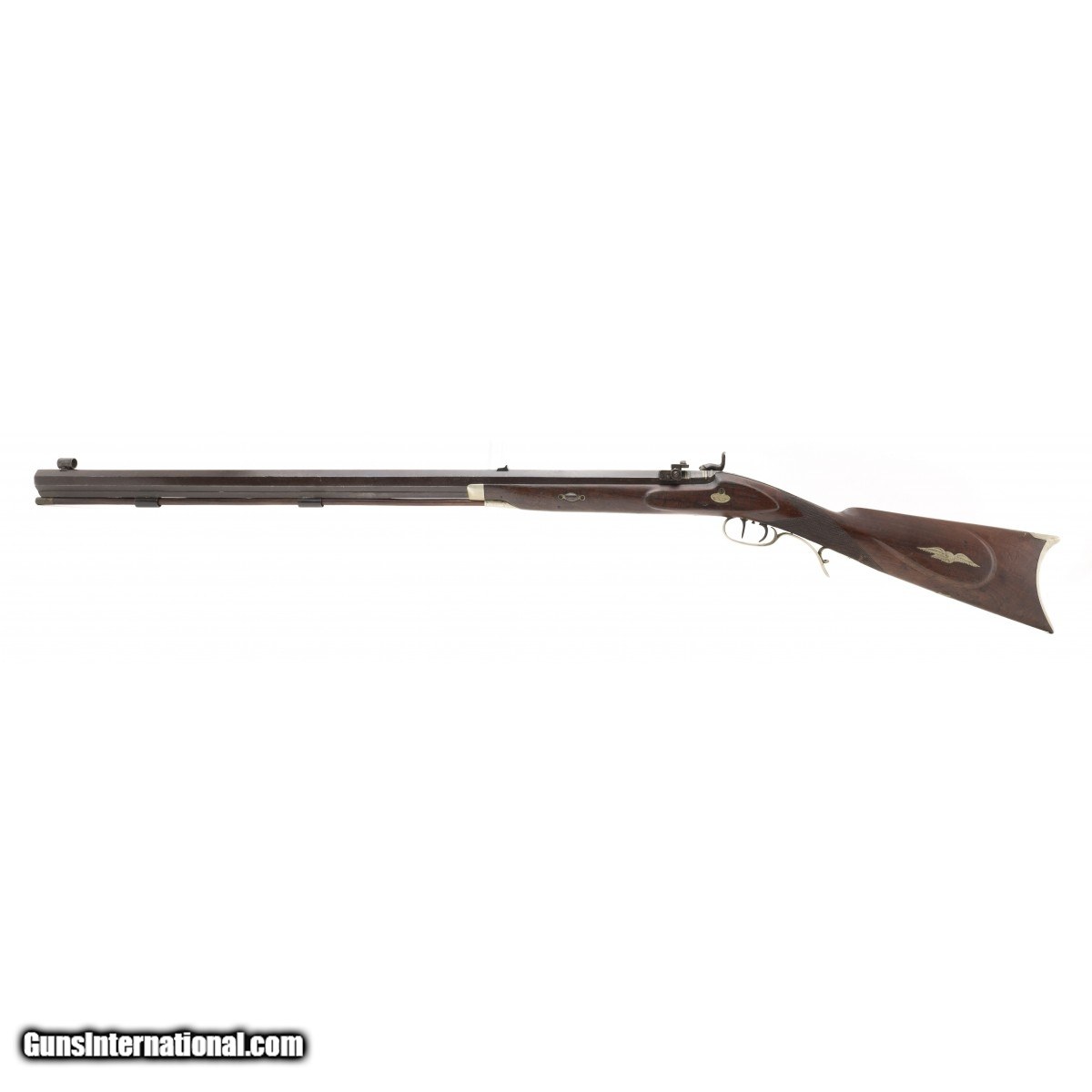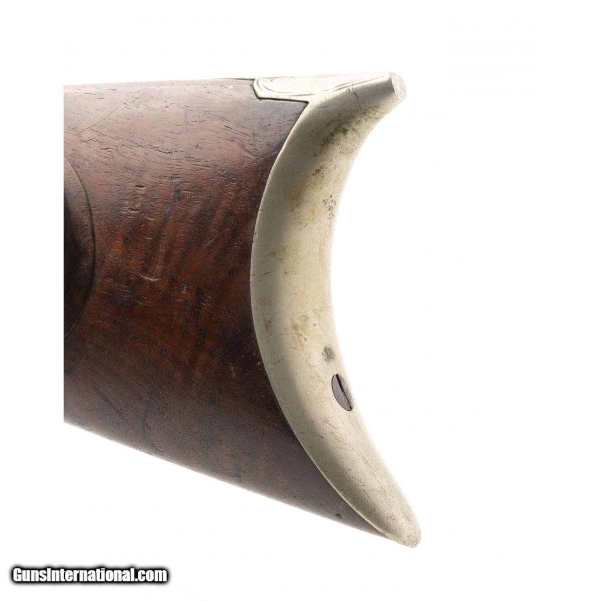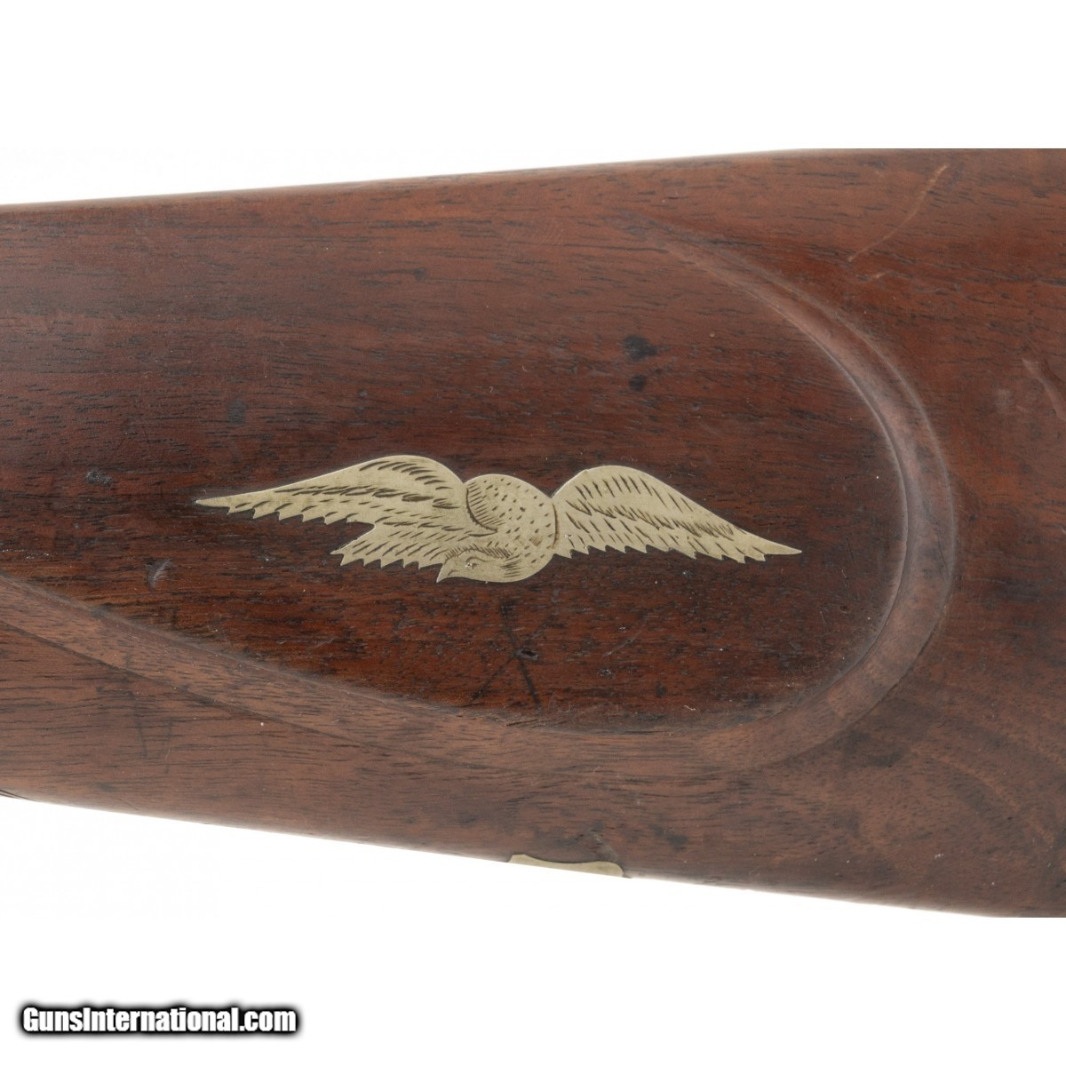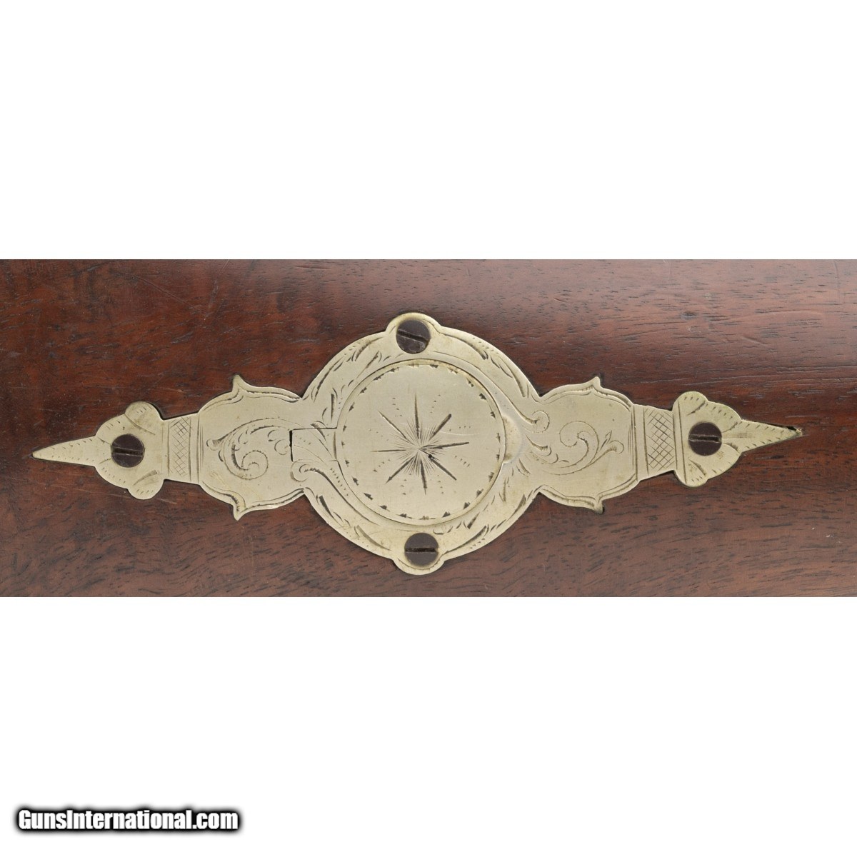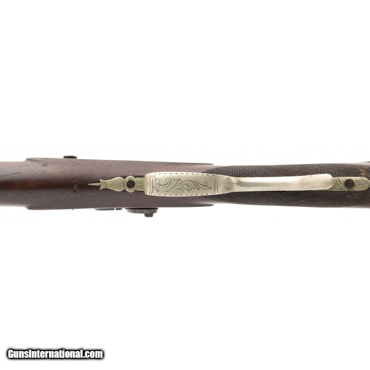 Description: " This unmarked 54 caliber percussion target rifle is equipped with a modern Lyman rear peep sight and a globe with peep front sight. The overall length is approx. 48"". The 31.5"" octagon barrel has an excellent bore with strong, bright gain twist rifling. The top flat is marked WARRENTED INCREASE TWIST. There is a fixed notch rear sight that appears to be more modern than the gun. All the metal parts have a smooth brown patina. The lock, hammer, barrel tang, trigger guard, butt plate tang, and patch box have decorative engraving. The nose of the hammer has a missing chip. The nose cap, lower ramrod pipe, trigger guard, butt plate, and patch box are German silver. The ramrod is present. The half tock is very good with crisp checkering at the wrist, no cracks or chips, and light overall wear with a couple of dents on the left flat. A German silver eagle is inlaid in the cheek piece and a blank shield shaped escutcheon is on the bottom behind the trigger guard. The double set trigger action functions correctly. If you collect percussion target rifles, this gain twist large bore rifle would be a good fit for your collection. SOLD Antique: Yes |