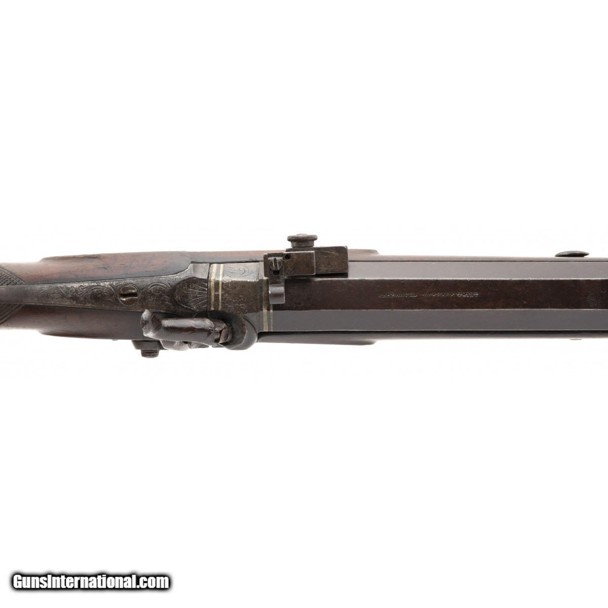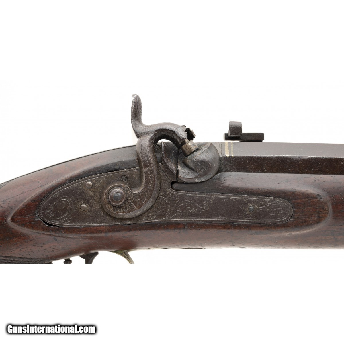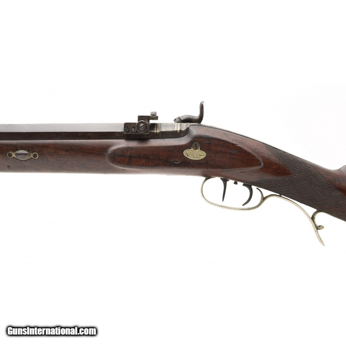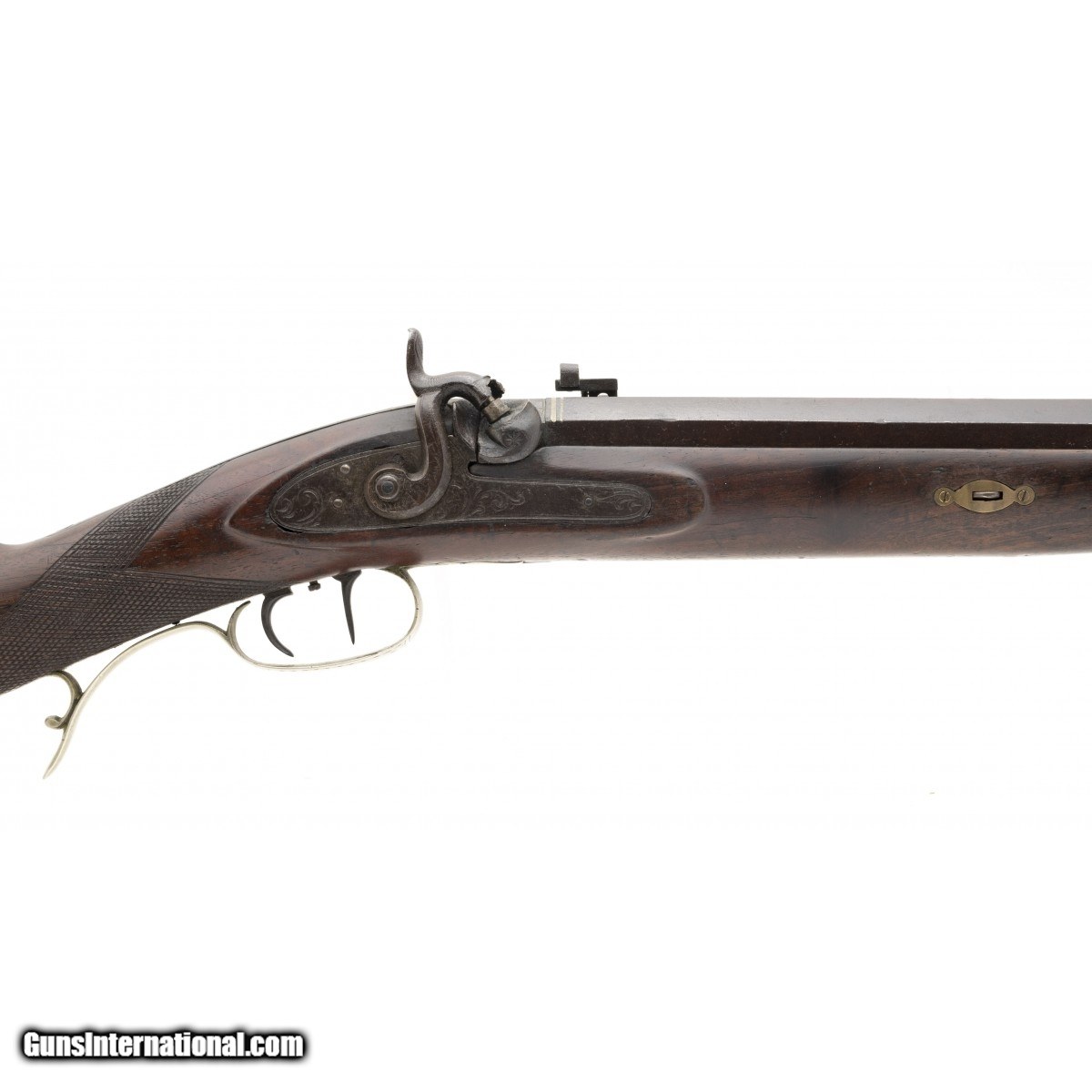 This unmarked 54 caliber percussion target rifle is equipped with a modern Lyman rear peep sight and a globe with peep front sight. The overall length is approx. 48"". The 31.5"" octagon barrel has an excellent bore with strong, bright gain twist rifling. The top flat is marked WARRENTED INCREASE TWIST. There is a fixed notch rear sight that appears to be more modern than the gun. All the metal parts have a smooth brown patina. The lock, hammer, barrel tang, trigger guard, butt plate tang, and patch box have decorative engraving. The nose of the hammer has a missing chip. The nose cap, lower ramrod pipe, trigger guard, butt plate, and patch box are German silver. The ramrod is present. The half tock is very good with crisp checkering at the wrist, no cracks or chips, and light overall wear with a couple of dents on the left flat. A German silver eagle is inlaid in the cheek piece and a blank shield shaped escutcheon is on the bottom behind the trigger guard. The double set trigger action functions correctly. If you collect percussion target rifles, this gain twist large bore rifle would be a good fit for your collection.