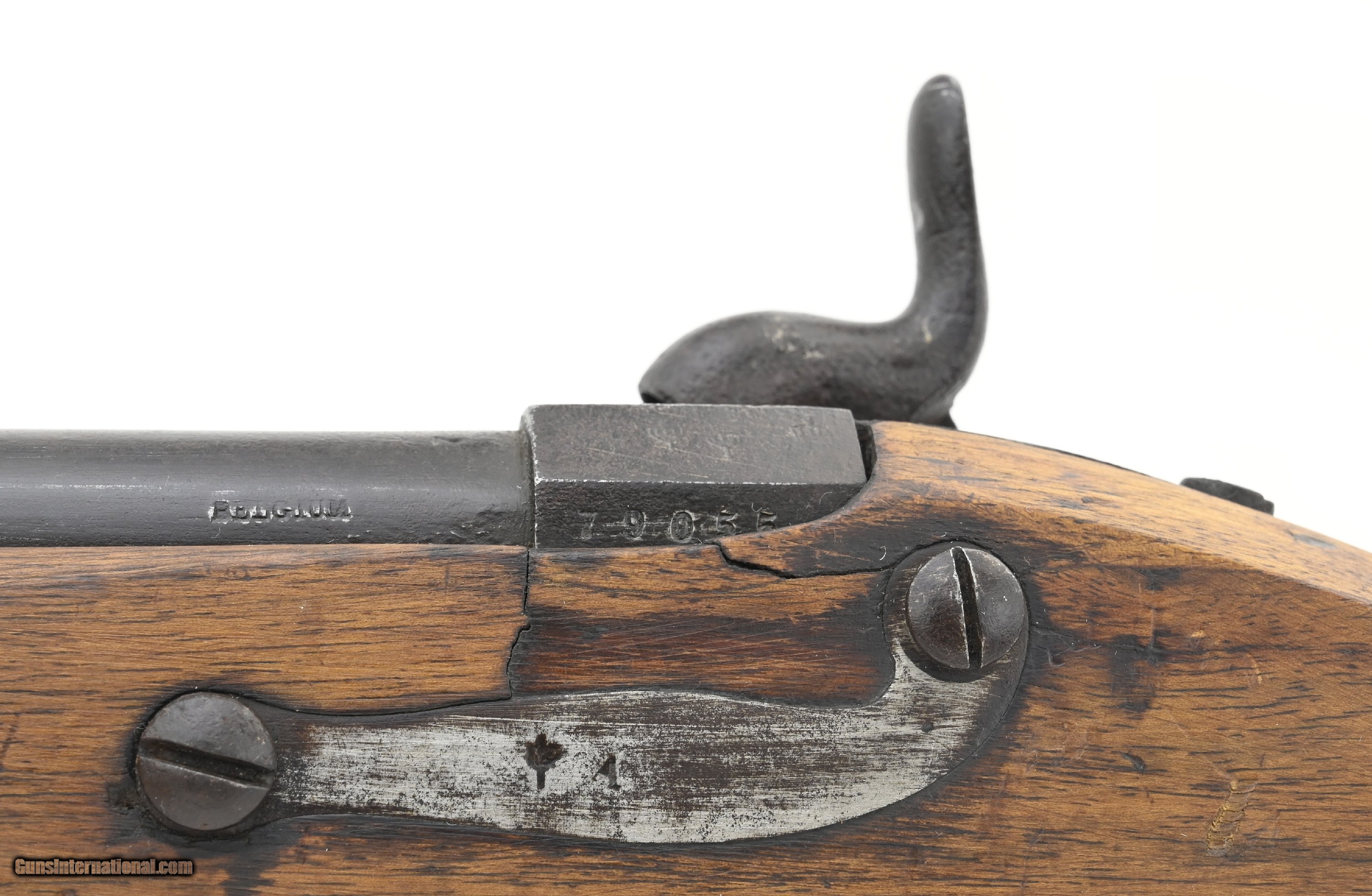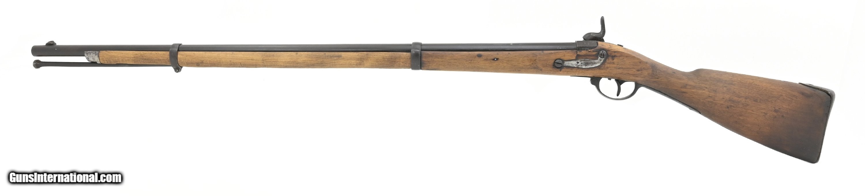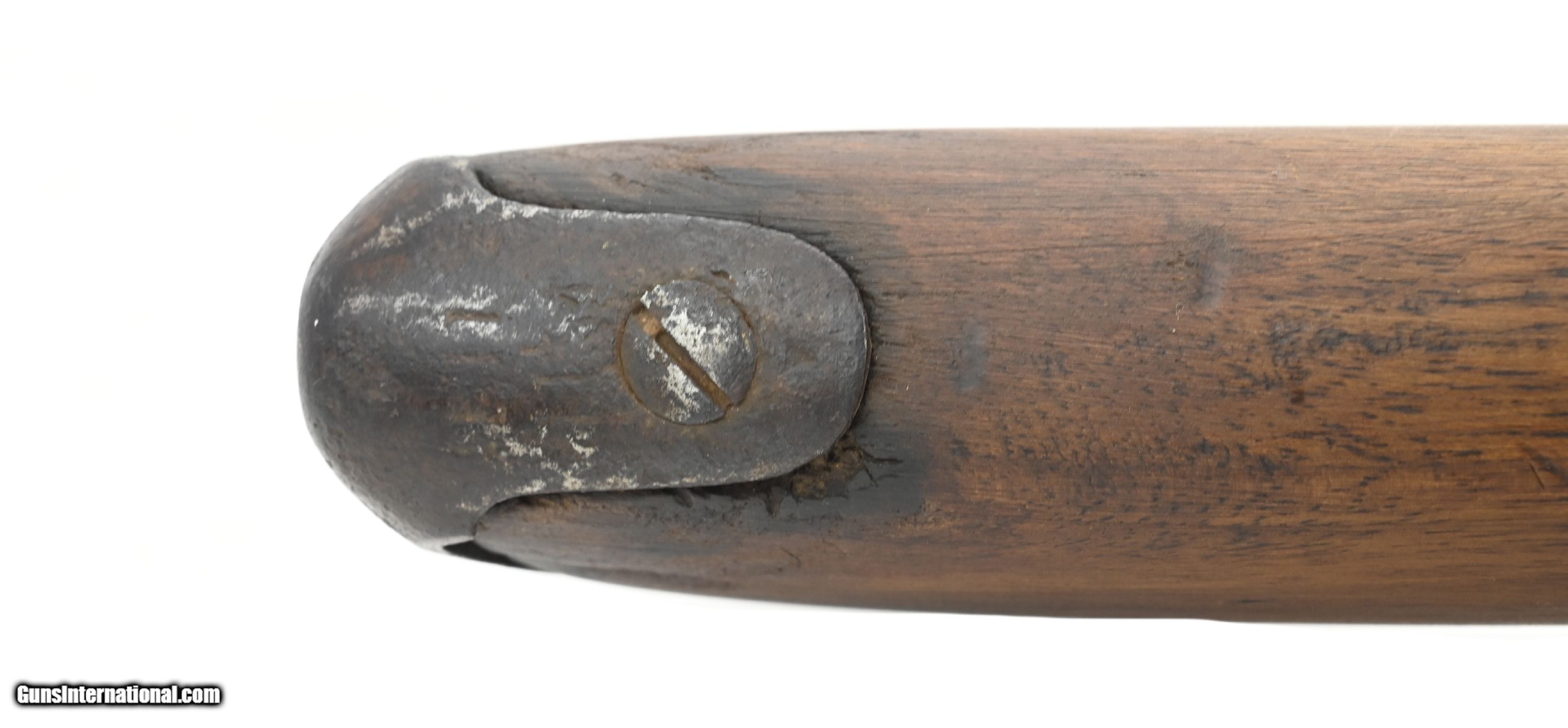 Description: "Belgian alteration to percussion of a German Potsdam musket. Overall length is approximately 51½". The 36¼" round barrel has an octagon breech section. It is approximately .61 caliber with a fair smooth bore All the metal has an even brown patina with a few areas of scattered roughness. Stock is good with some wood loss around the butt plate heel and barrel tang. There are repairs on both sides of the barrel tang. Lock is unmarked. The barrel and breech are numbered “79055". The breech has three proof marks. The barrel is marked “Belgium". Ramrod is present. Action functions correctly. This is most likely a Civil War import. Antique: Yes Price: $875.00 Contact Seller |