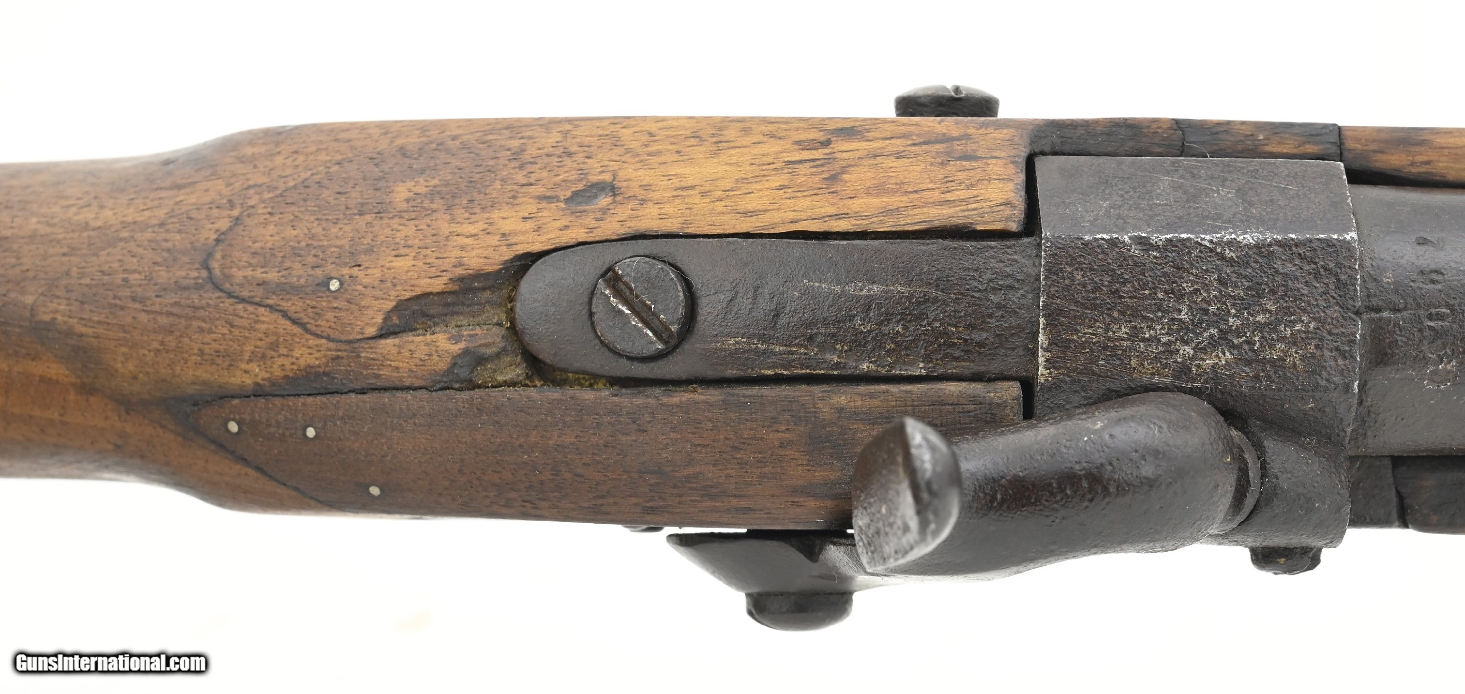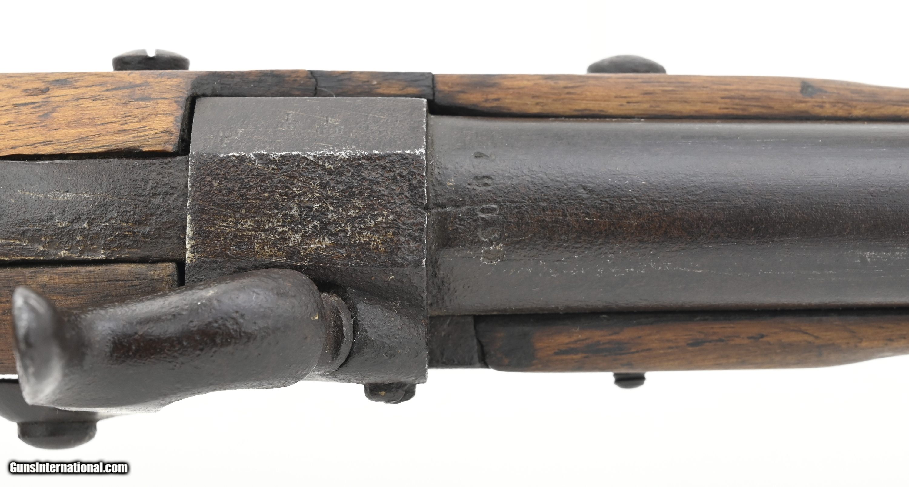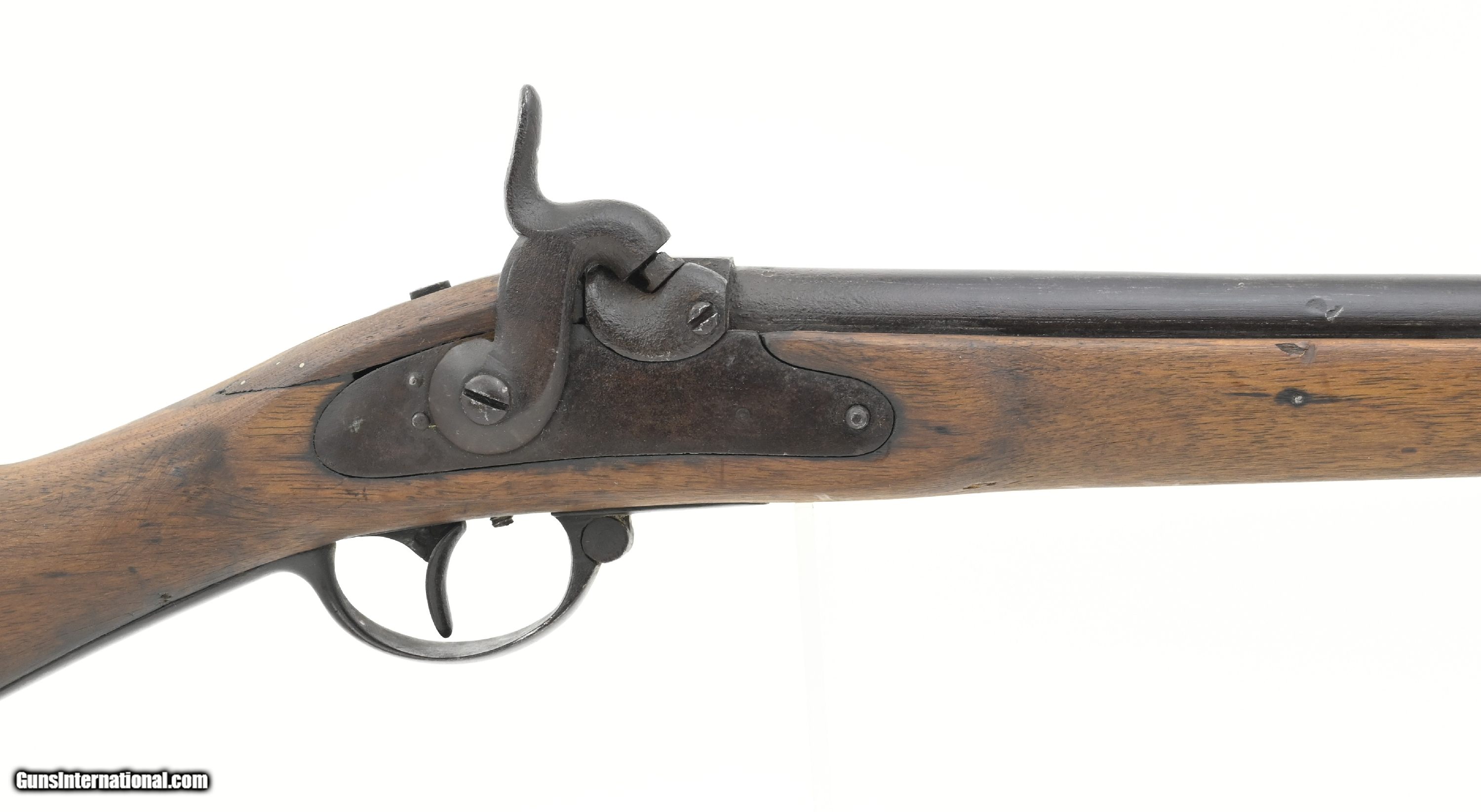 Description: "Belgian alteration to percussion of a German Potsdam musket. Overall length is approximately 51½". The 36¼" round barrel has an octagon breech section. It is approximately .61 caliber with a fair smooth bore All the metal has an even brown patina with a few areas of scattered roughness. Stock is good with some wood loss around the butt plate heel and barrel tang. There are repairs on both sides of the barrel tang. Lock is unmarked. The barrel and breech are numbered “79055". The breech has three proof marks. The barrel is marked “Belgium". Ramrod is present. Action functions correctly. This is most likely a Civil War import. Antique: Yes Price: $875.00 Contact Seller |