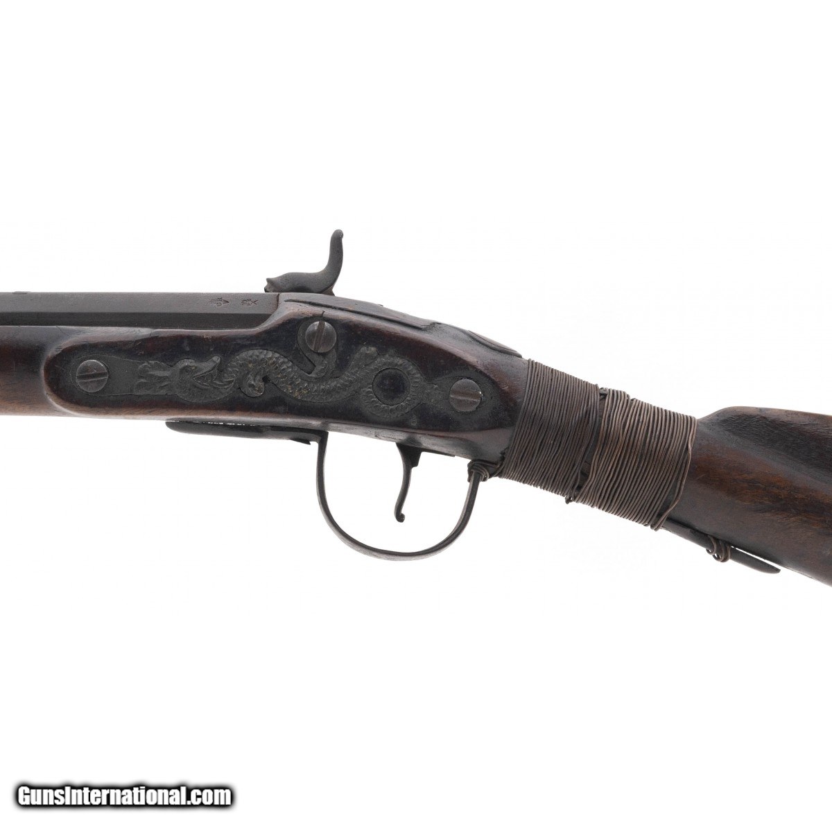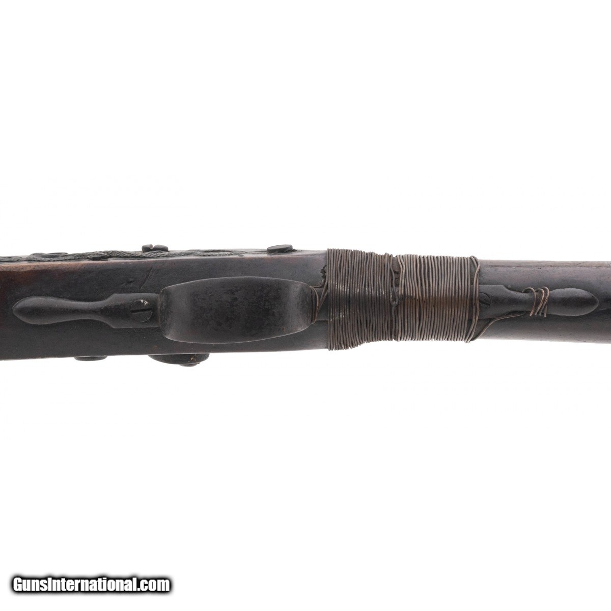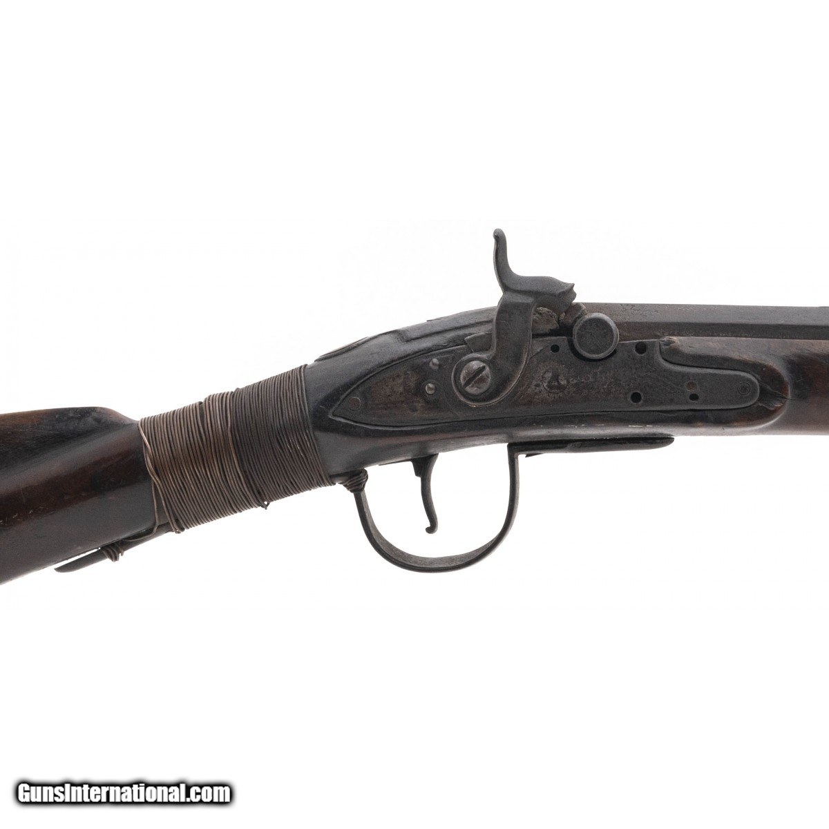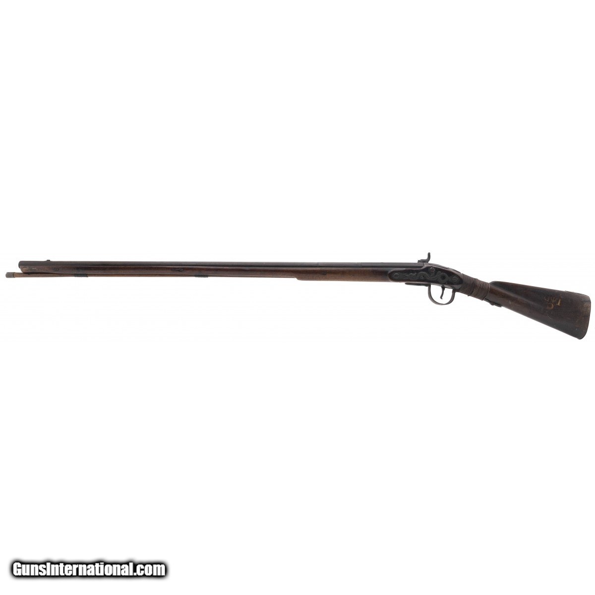 Description: " .60 caliber 36.75"" octagonal to round barrel Board of Ordnance altered Trade Gun by Galton. Metal is a dark brown patina with scattered surface oxidation noted, drum bolster shows minor pitting. Wood is good with handling and usage wear noted. Stock is marked with C/I Broad Arrow/D this most likely is attributed to the Canadian Indian Department. Wrist is wrapped in wire, Action functions correctly. Galton is one of the rare contract guns made for the War of 1812. A scarce Native trade gun! SOLD Antique: Yes |
