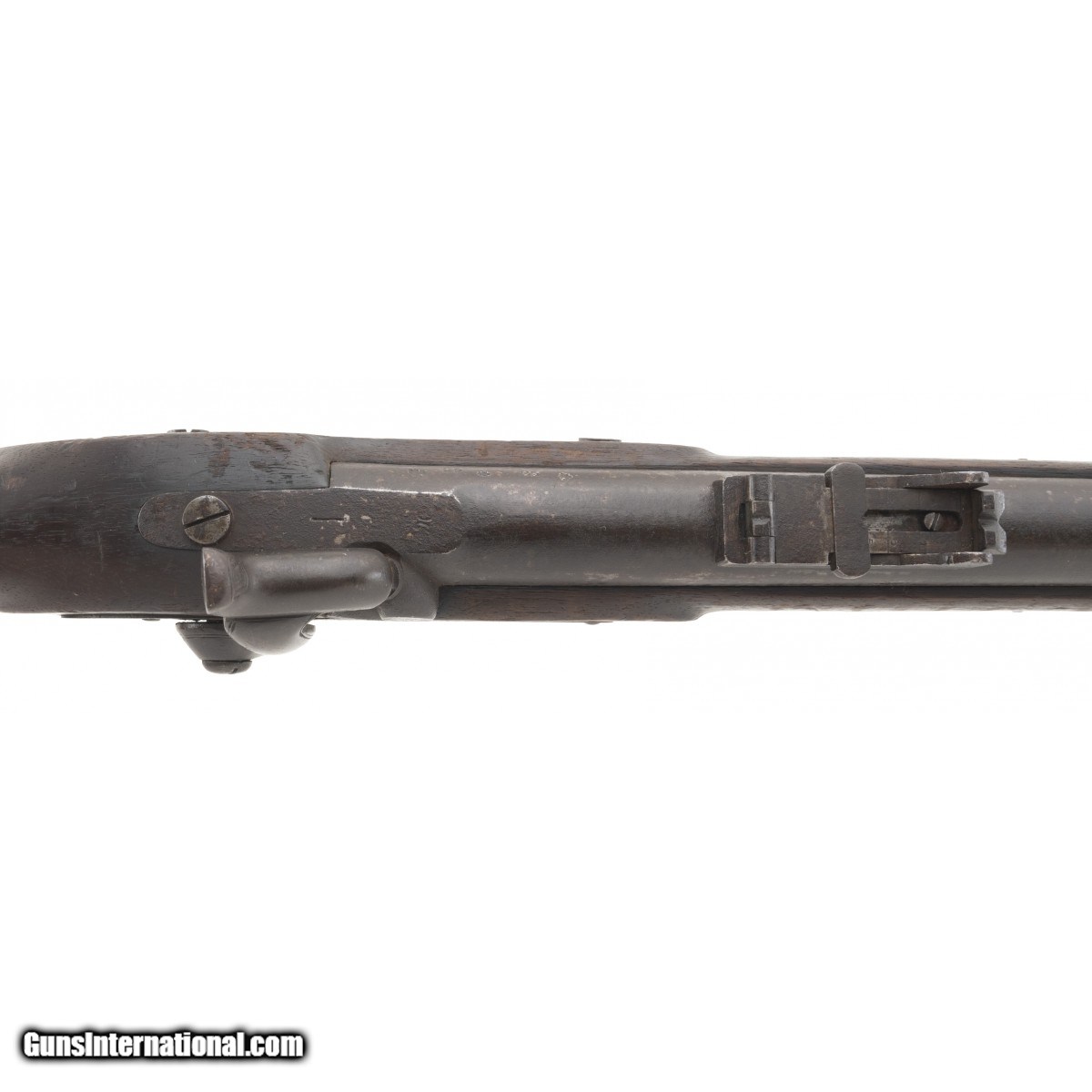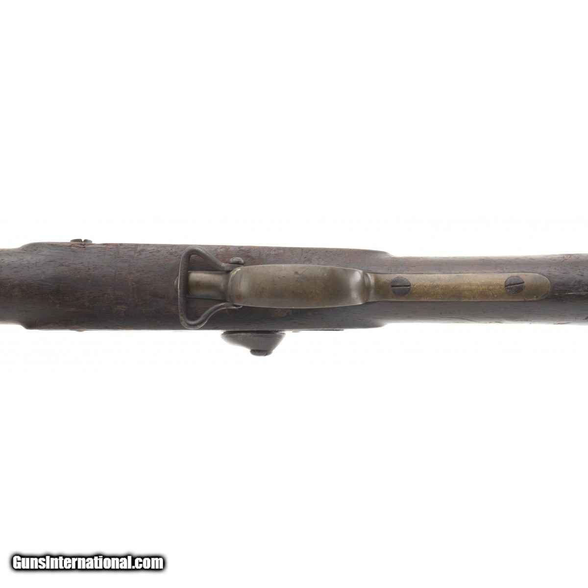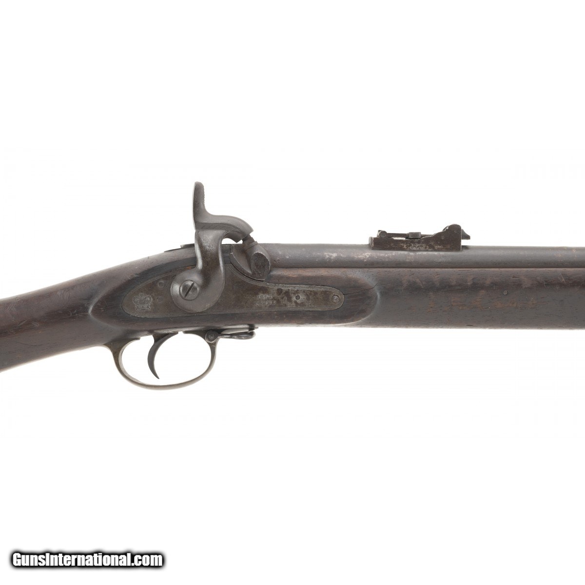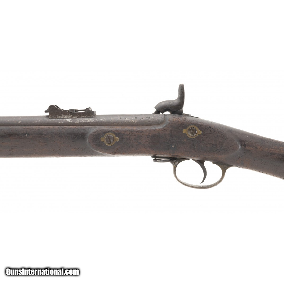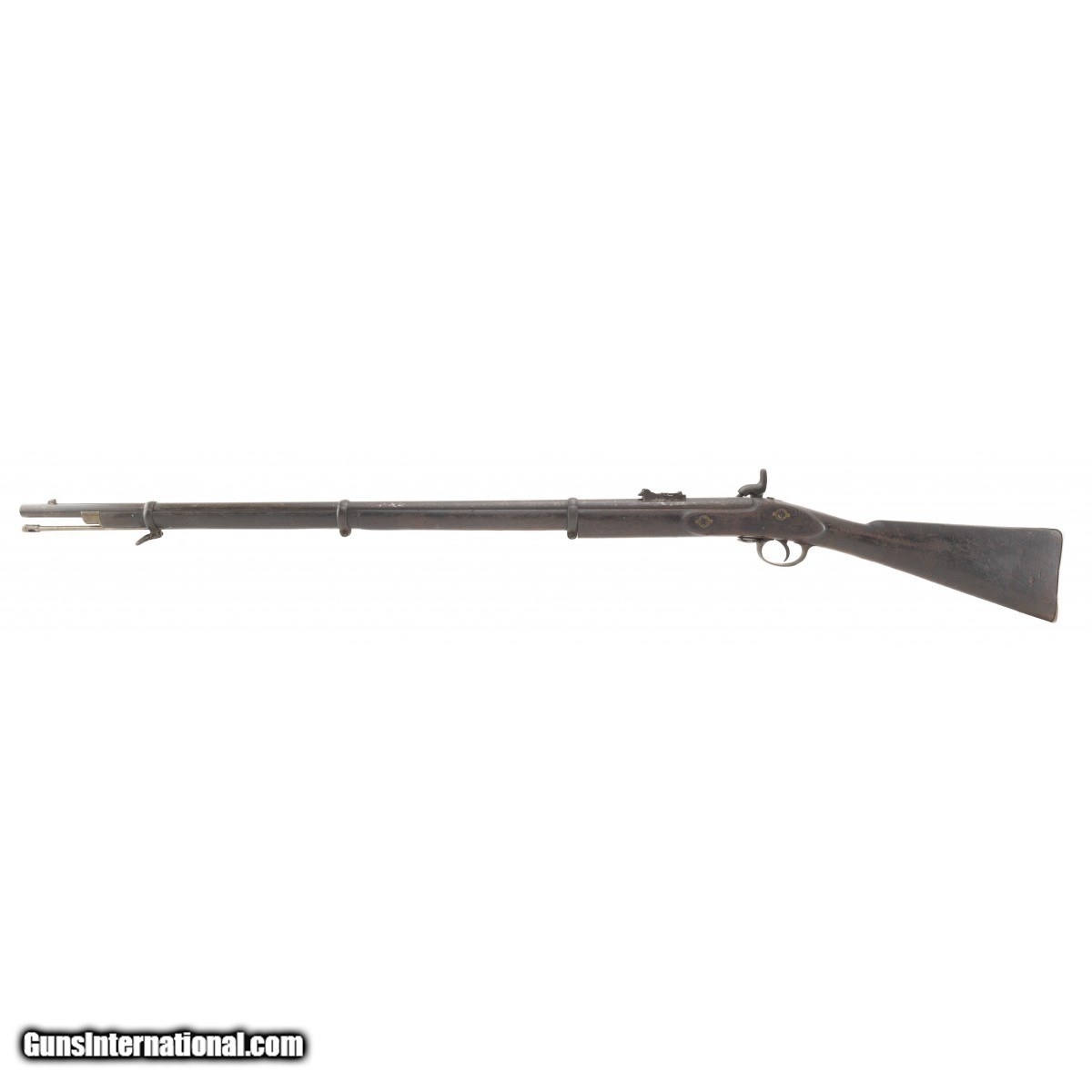 Description: " This British Pattern 1853 percussion rifle musket was most likely used during the Civil War. The overall length is approx. 55.25"". The 39"" round 577 caliber barrel has a good bore with strong rifling. The barrel has three Birmingham proof marks with two 25s (the bore which designates it as .577) in between. The barrel has a dark brown patina with some areas of light roughness. The lock is marked 1862 over TOWER with a crown at the tail. The lock and hammer have a smooth brown patina. The brass nose cap, trigger guard, and butt plate are very good with an untouched patina. The bands are good with a dark brown patina. The center band is about .75"" forward of its usual position but it appears to have been there since this gun was new. The ramrod and swivels are present. The stock is good with no cracks or chips but with lots of usage dents and dings. The action functions correctly. The Union used about 500,000 Pattern 1853 rifle muskets during the Civil War. One of these is a must for any Civil War collection. SOLD Antique: Yes |