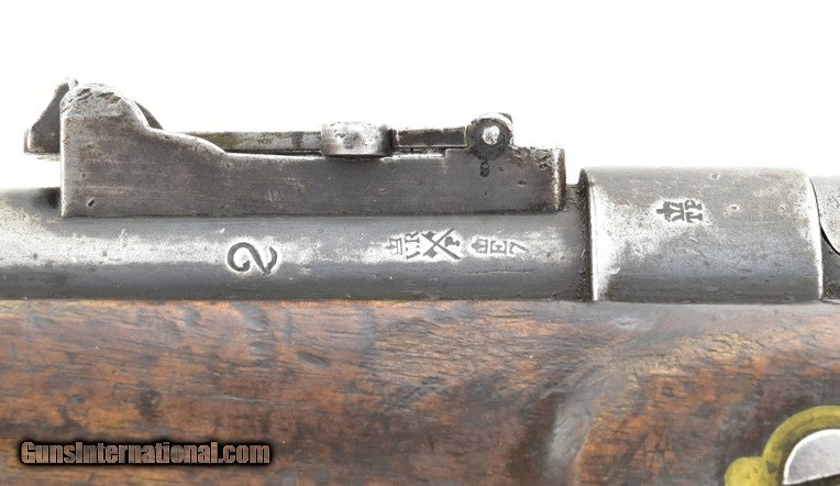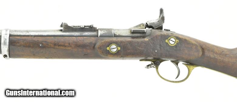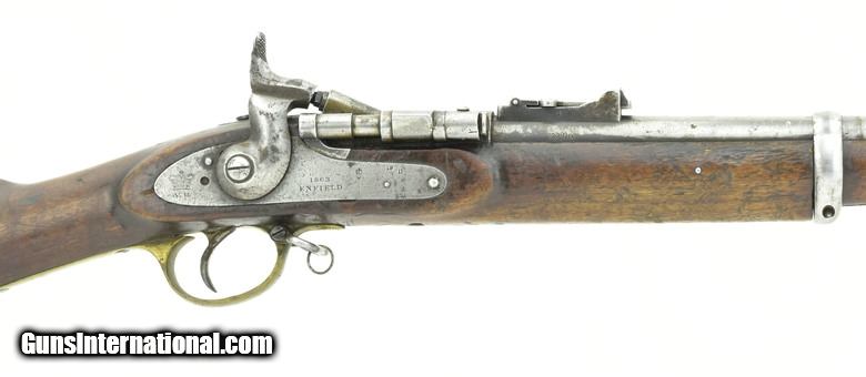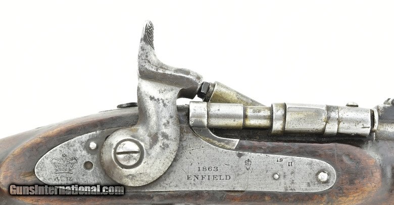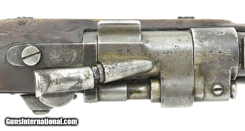 Description: " British Pattern 2** Snider .577 Centerfire infantry rifle. The Snider is a cartridge conversion of the muzzle-loading Enfield rifle-musket. The pattern 2** was introduced in May 1867. Rifle has the 36½" round barrel with excellent bore. The exposed finish has been warned to smooth bright during use. Wood is good with approximately 2½" loss at the ramrod channel between the top two bands. Round Enfield stamp over a “2" is visible on butt stock. Lock is marked “1863" over “Enfield". Breech block is marked is marked “B.S.A. Co." and various other inspection stamps / marks expected of a British arm of this age. Action works correctly. Early Snider’s like this one is hard to find. SOLD Antique: Yes |