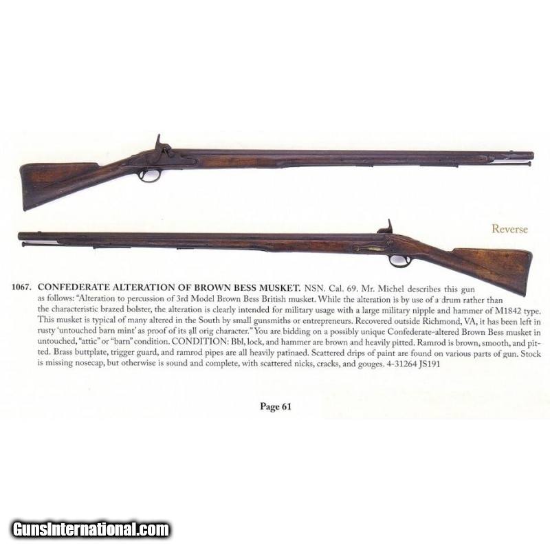 Description: "Confederate Alteration of a 3rd model Brown Bess musket. From the renown Ben Michel collection and pictured in the catalogue. Mr. Michel notes ""recovered outside Richmond, VA it has been left in rusty untouched barn mint condition"". See accompanying description in photo. SOLD Antique: Yes |