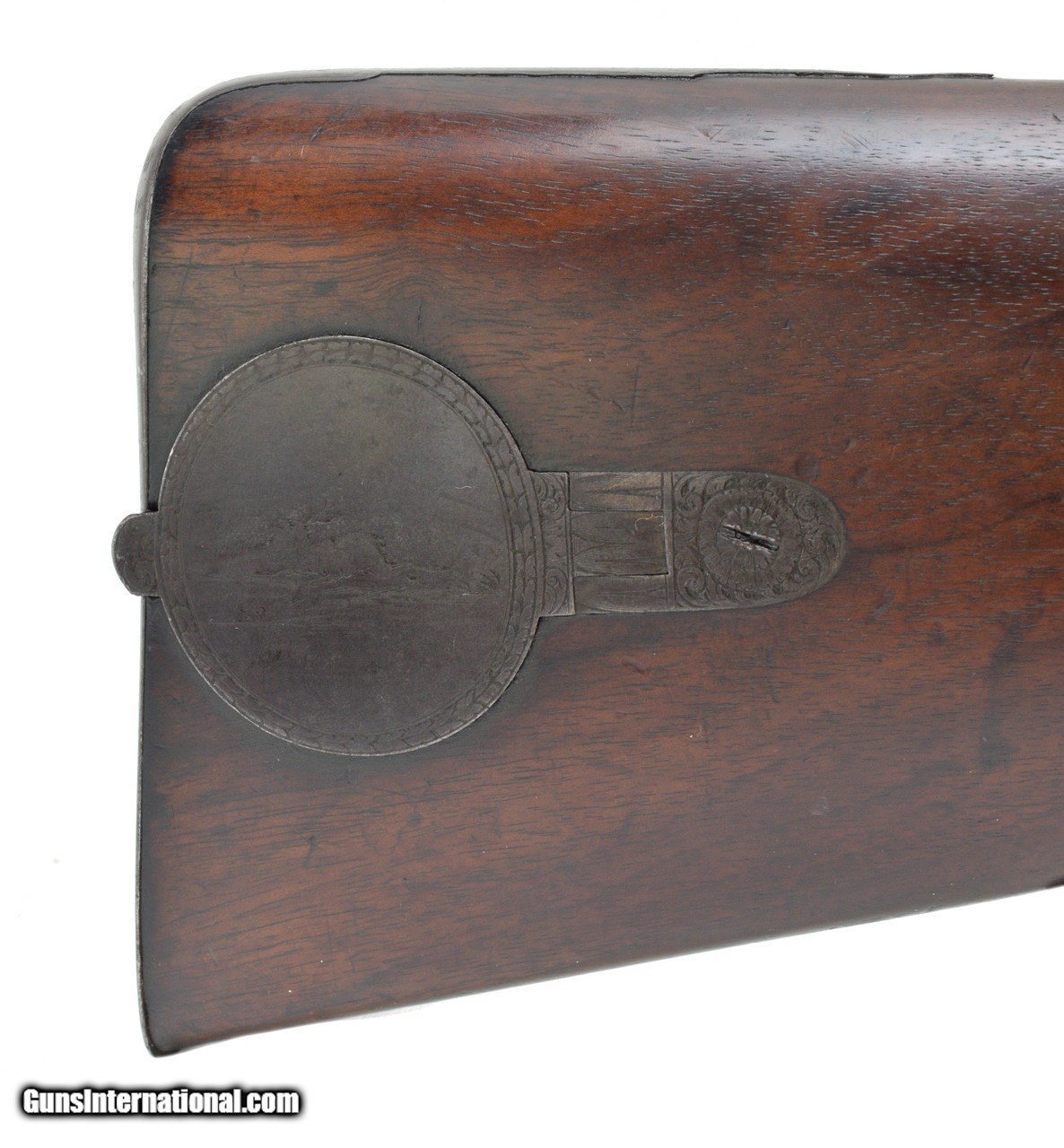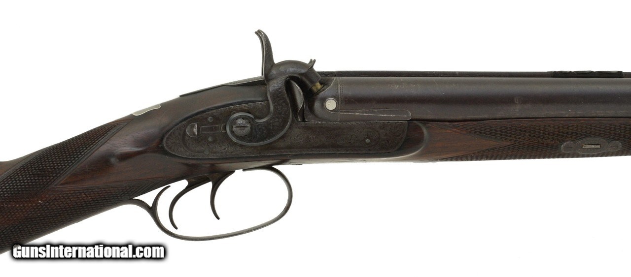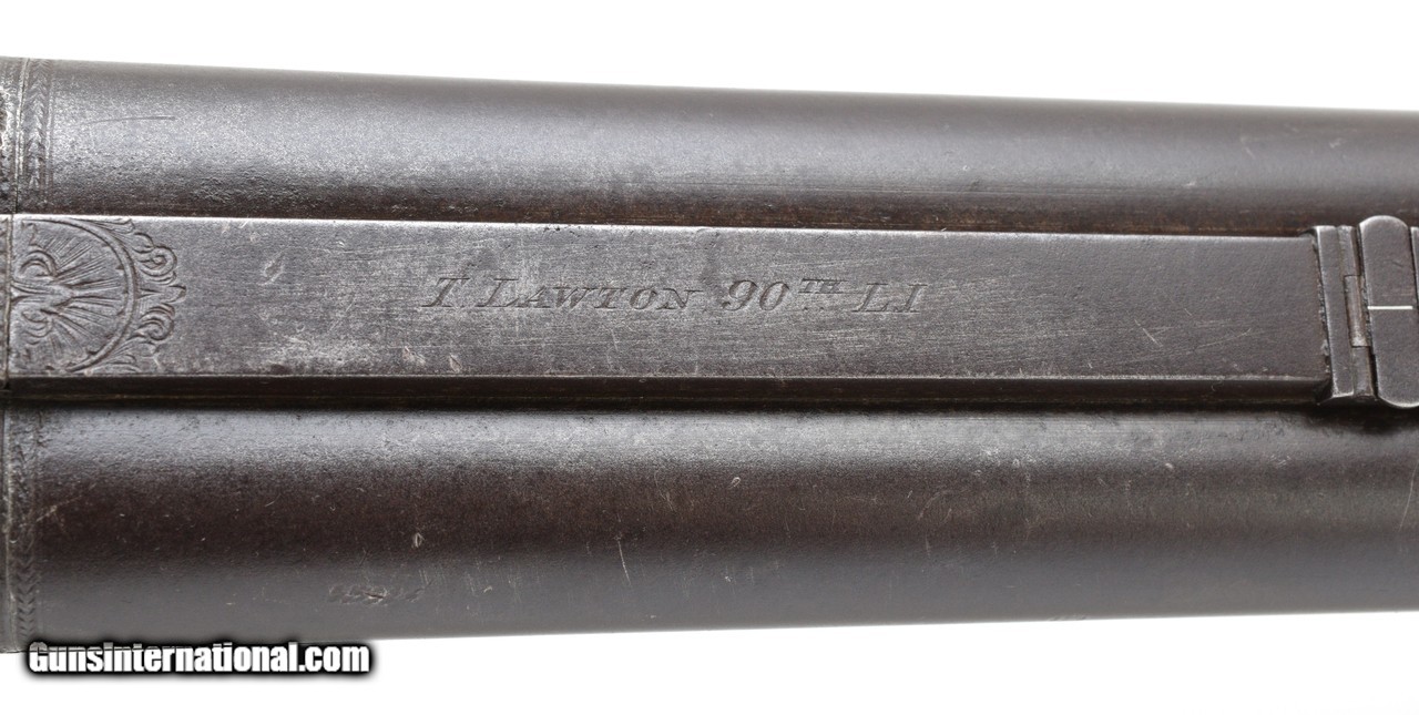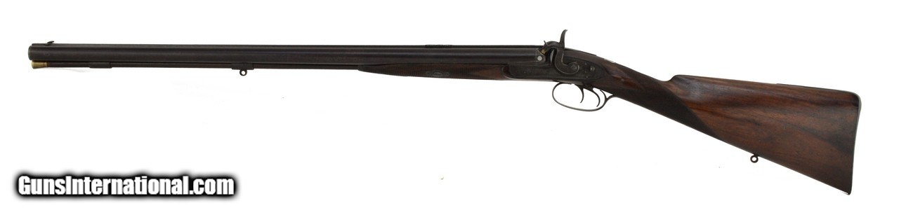 Description: "English Percussion Double Rifle. .577 Caliber. Locks are marked “T. Lawton 90th L.I." (light infantry). Barrels are 27" long and overall length is 44". Bore is very good with strong rifling. The locks are scroll engraved and have sliding safeties. Barrel has platinum breech plugs. Barrel has a 3 leaf folding rear sight, leaves marked 1, 2, 3. Patch box shows a running buck with a mountain range in the background. Trigger guard and tangs are engraved. Stock is solid with no chips, cracks, or repairs. Checkering is excellent. Action works perfectly. Fine percussion big bore rifle. Antique: Yes Price: $4,500.00 Contact Seller |