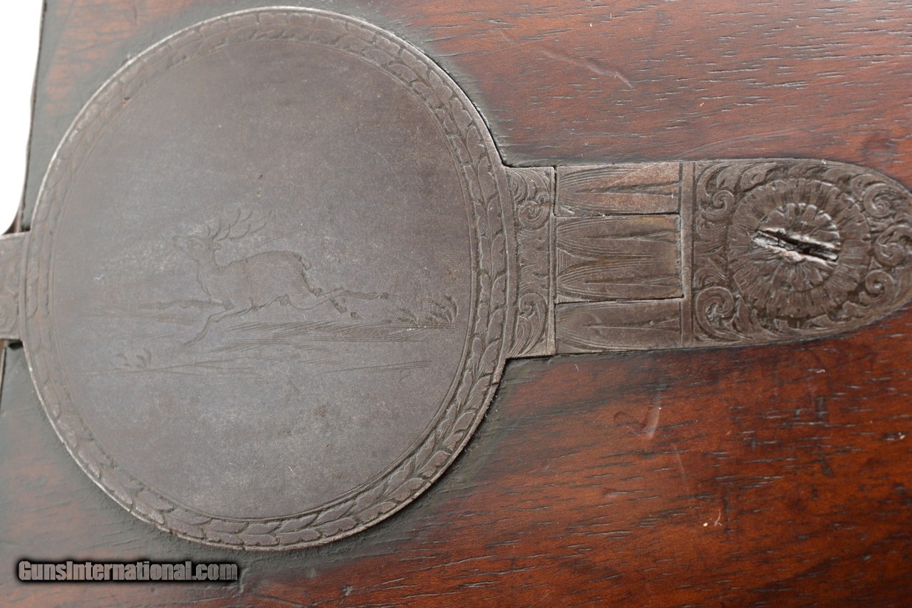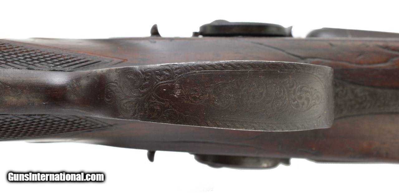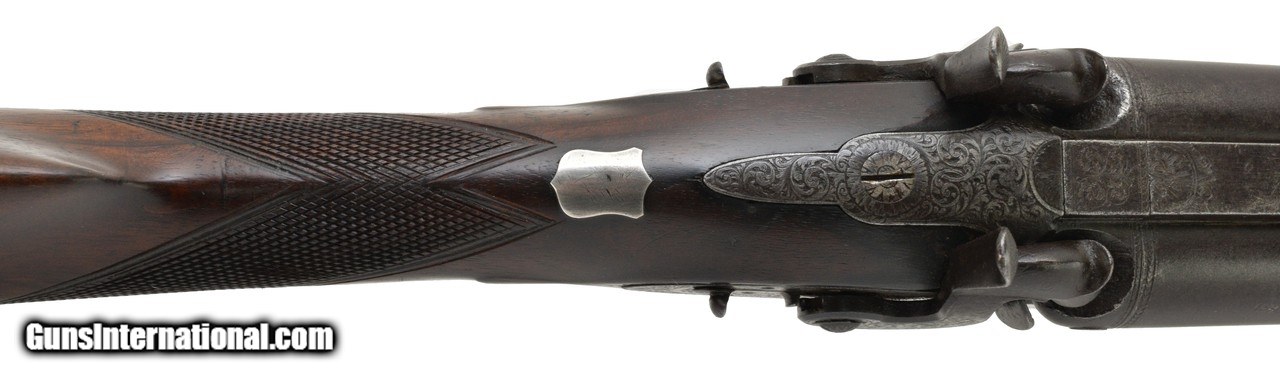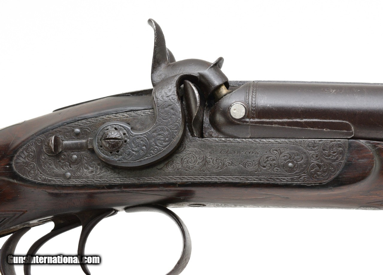 Description: "English Percussion Double Rifle. .577 Caliber. Locks are marked “T. Lawton 90th L.I." (light infantry). Barrels are 27" long and overall length is 44". Bore is very good with strong rifling. The locks are scroll engraved and have sliding safeties. Barrel has platinum breech plugs. Barrel has a 3 leaf folding rear sight, leaves marked 1, 2, 3. Patch box shows a running buck with a mountain range in the background. Trigger guard and tangs are engraved. Stock is solid with no chips, cracks, or repairs. Checkering is excellent. Action works perfectly. Fine percussion big bore rifle. Antique: Yes Price: $4,500.00 Contact Seller |
