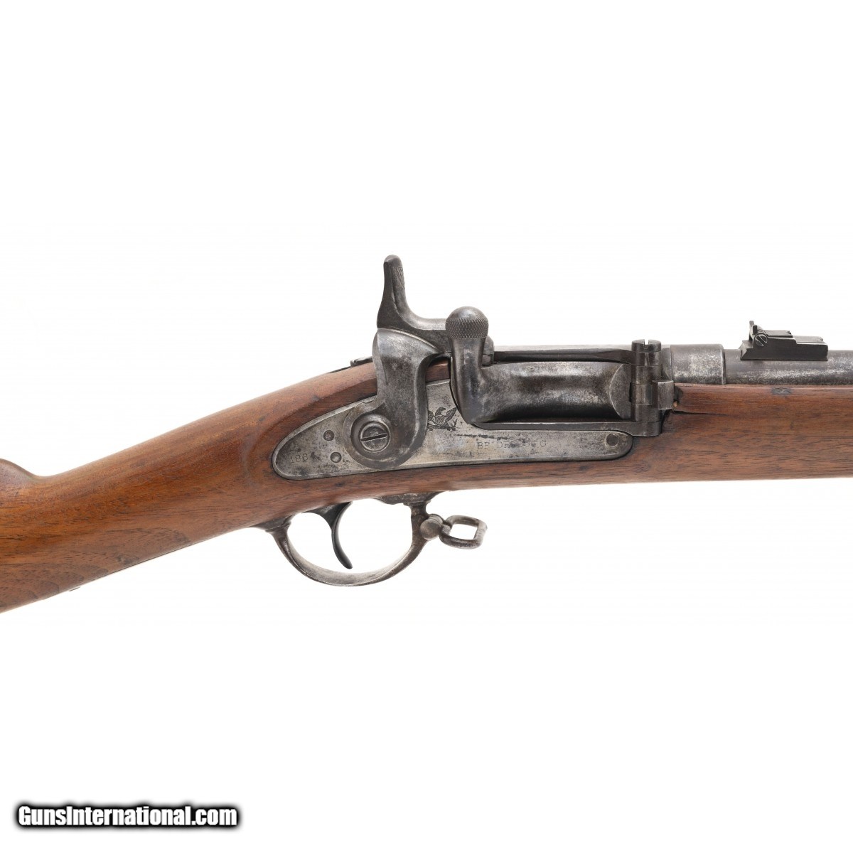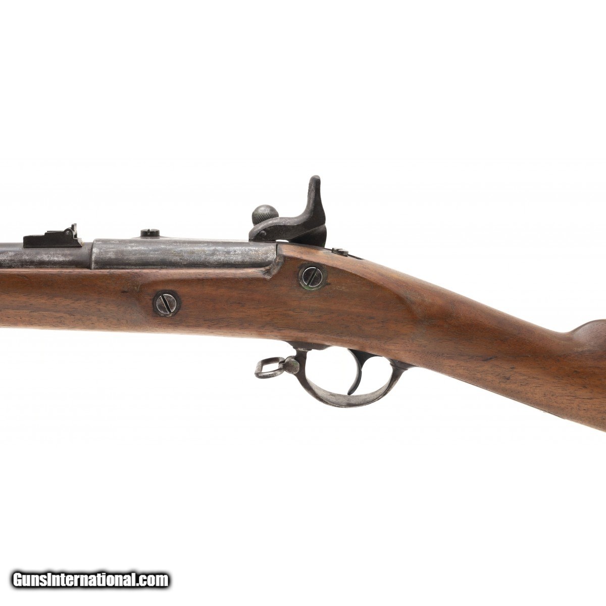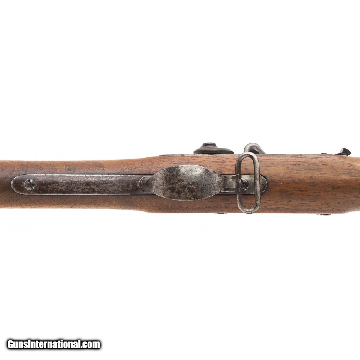 Description: " NSN, made in 1864, converted circa 1869, .58CF, 36 5/8"" round rifled barrel. Musket was converted in Trenton, NJ and used by the Fenian Brotherhood who was an Irish-American secret society who wanted to invade Canada in 1870. Metal and iron parts are a dark patina with scattered mottled surface oxidation visible. Stock has been lightly cleaned at some point with a small crack visible forward of breech. Bore is good with frosting noted in the grooves. A ""V"" cut splice under mid band. This is a clear indication of the Fenian Brotherhood. SOLD Antique: Yes |
