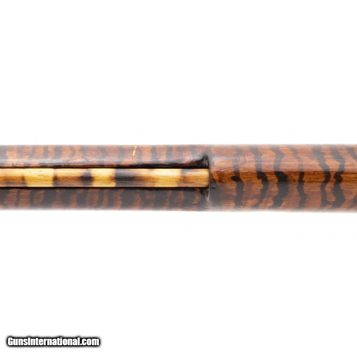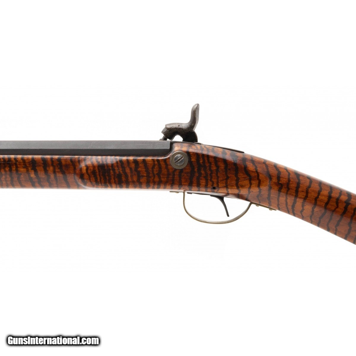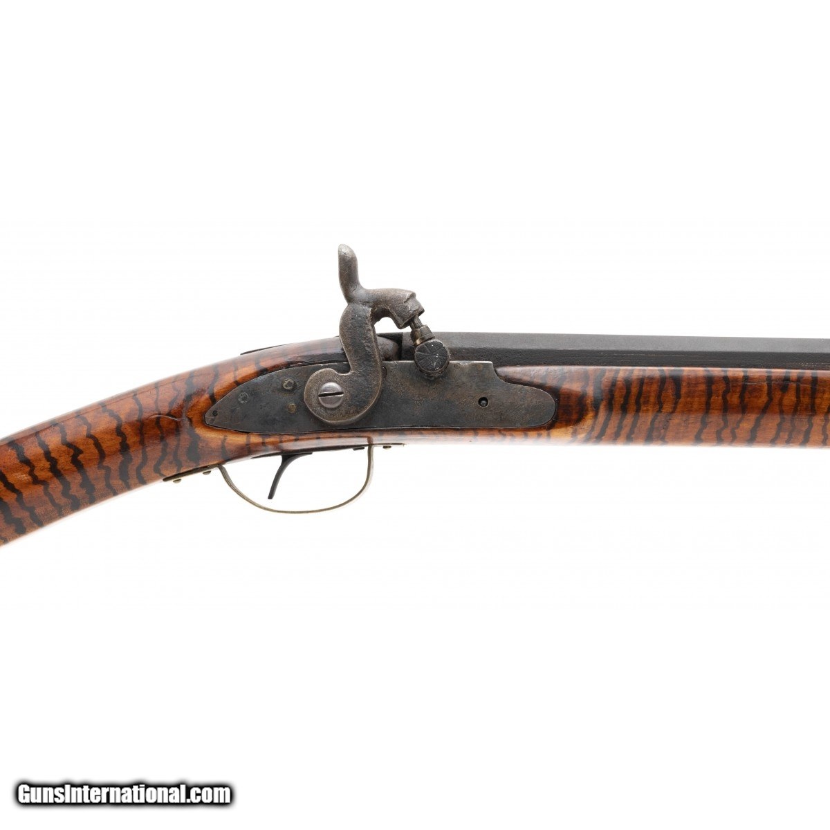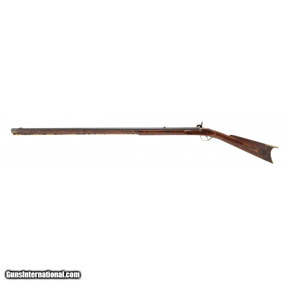 Made circa 1860. 38 caliber with a 38" barrel. Barrel has a dark brown, almost black patina. Stock has been finished with tiger striping. Action works sporadically