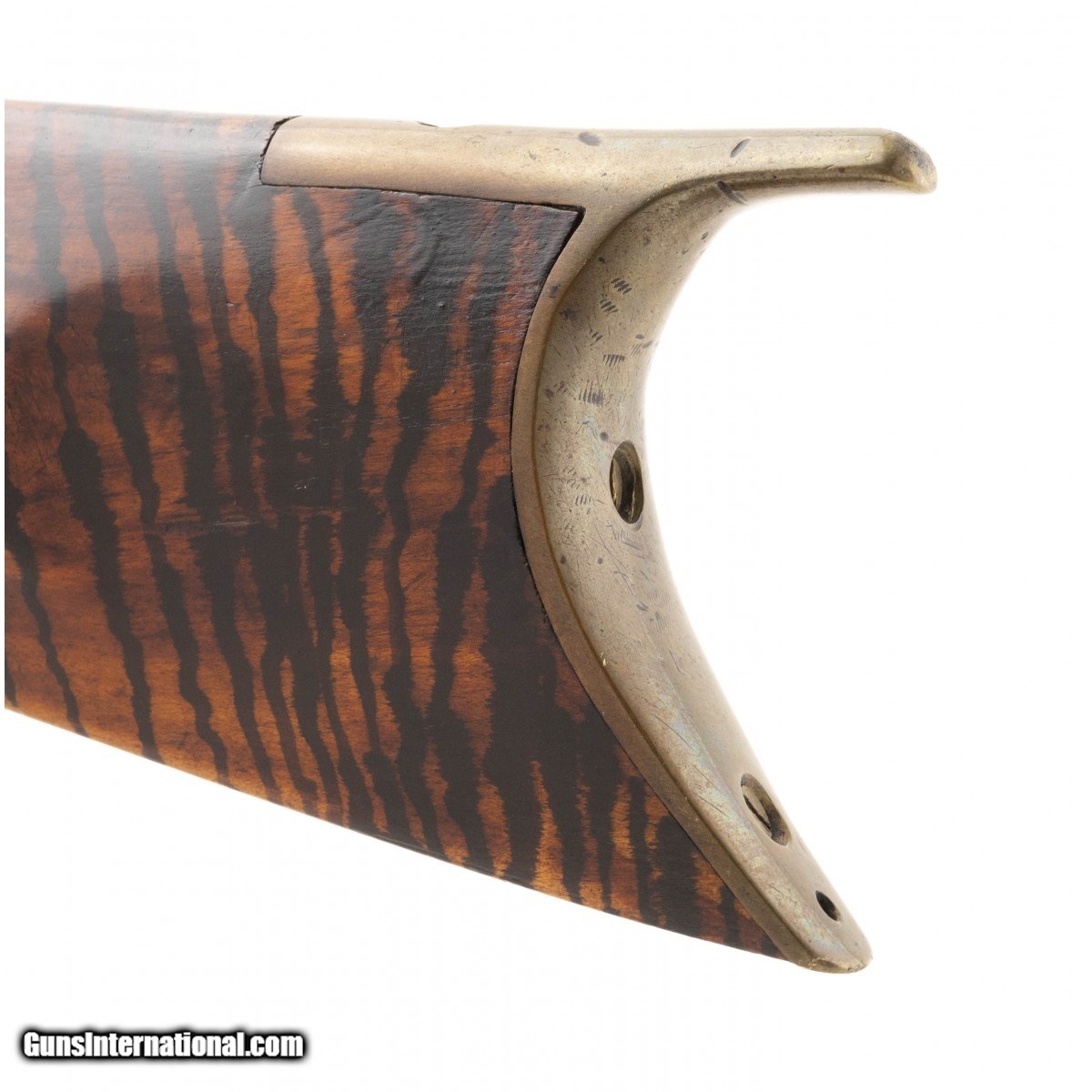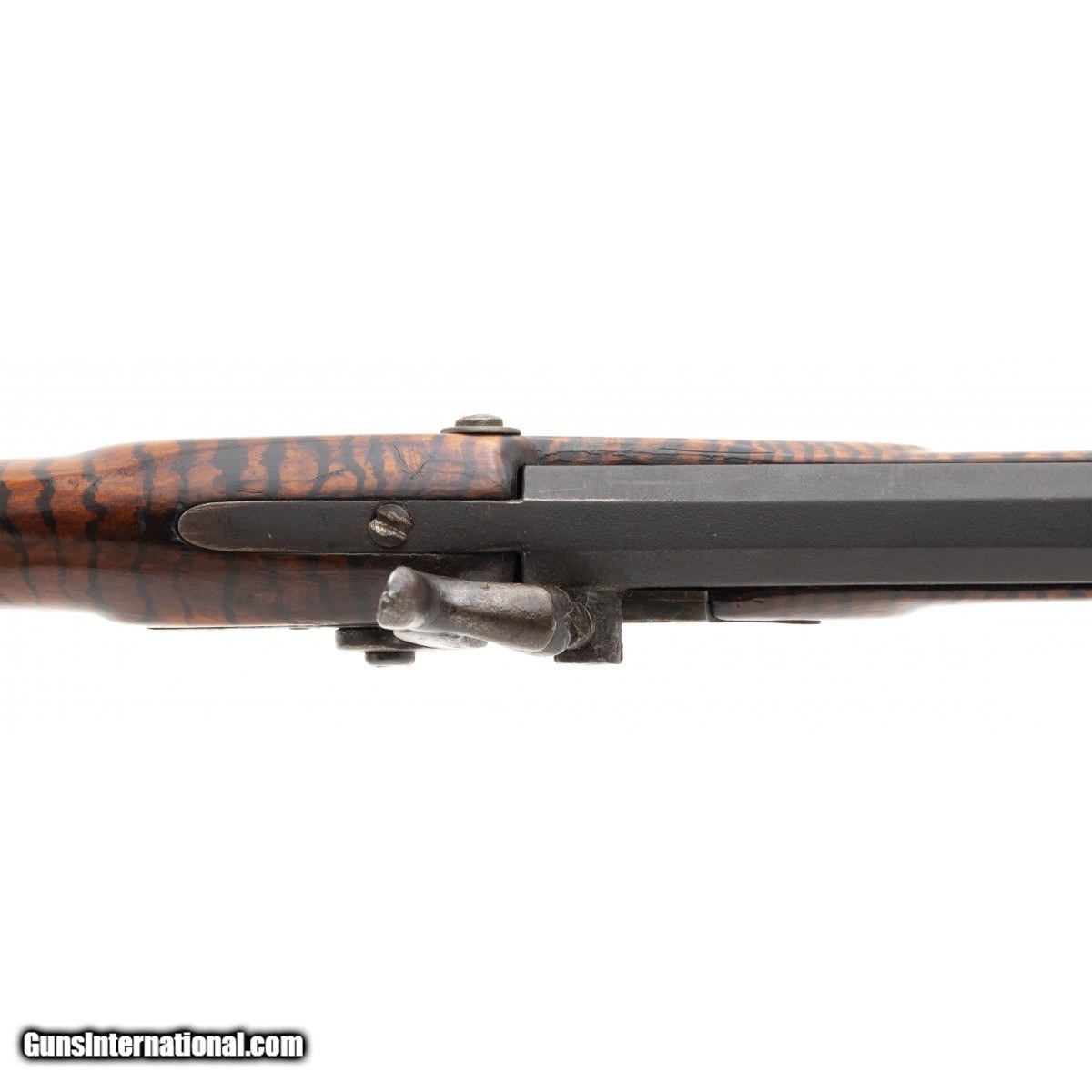 Description: " Made circa 1860. 38 caliber with a 38" barrel. Barrel has a dark brown, almost black patina. Stock has been finished with tiger striping. Action works sporadically SOLD Antique: Yes |