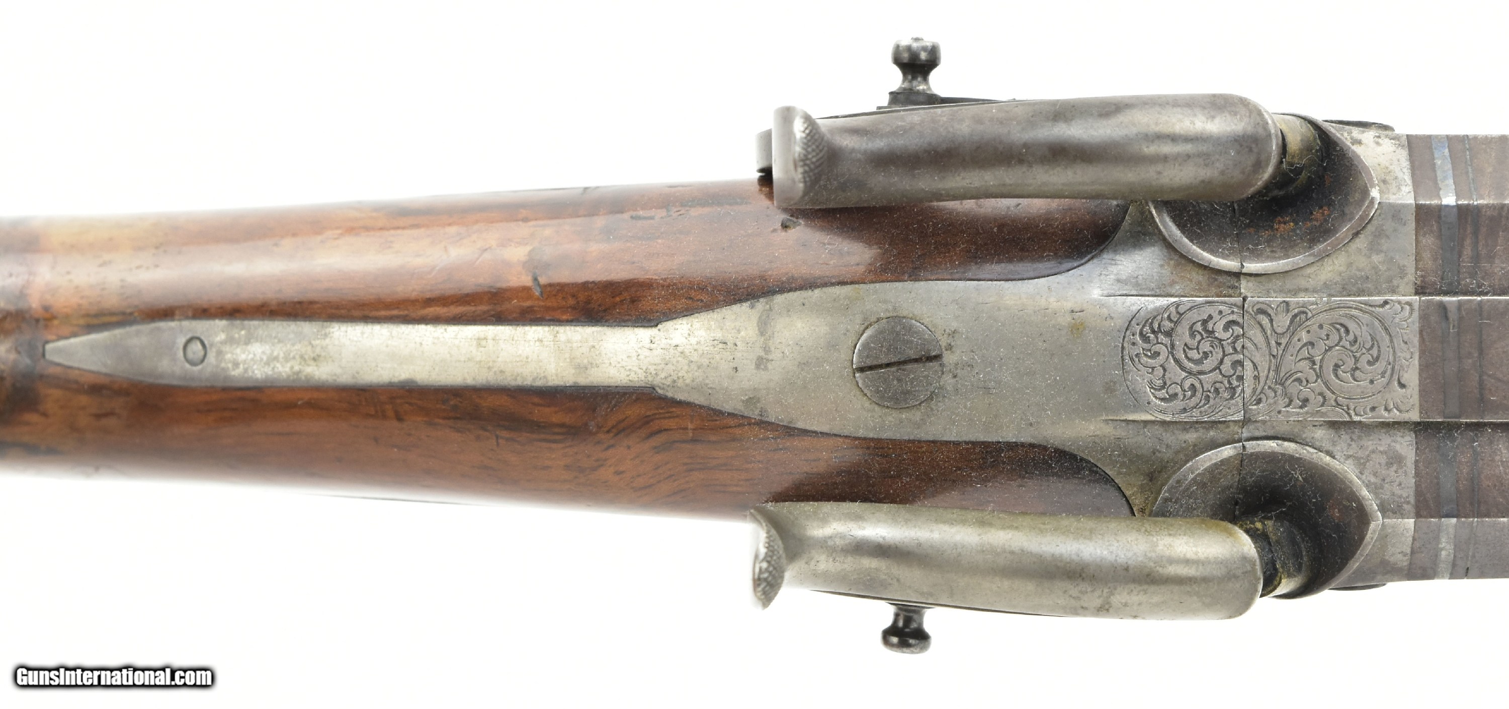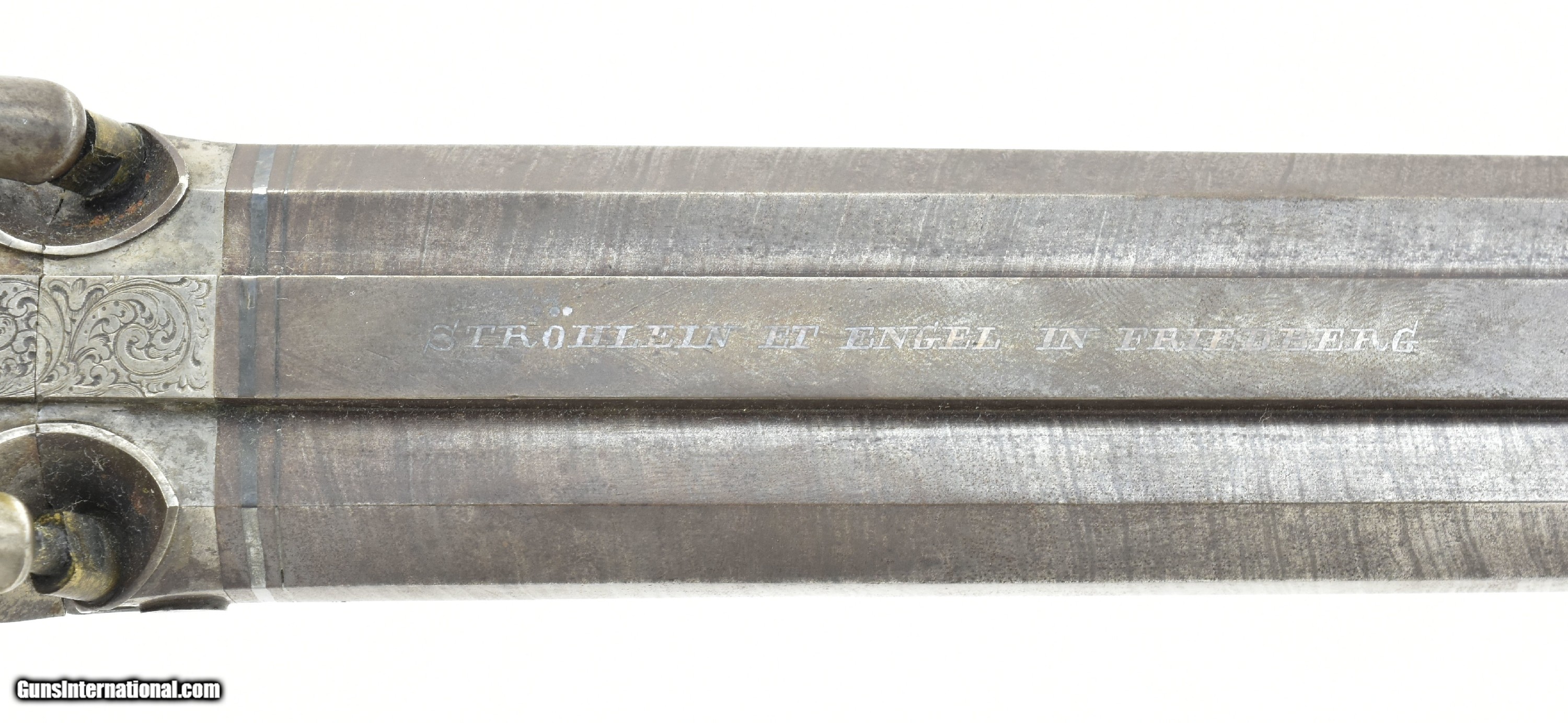 Description: "German muzzle loading Cape Gun with .60 caliber rifle barrel and 24 bore shotgun barrel. High end example of a mid-19th century hunting weapon in the German style. Right hammer has a slight crack, but is sound. The gun is very nice overall. Marked “STROHEIN ET ENGEL IN FRIEDBERG" on the Damascus barrel. Patch box is wood and is spring loader. Has fine wood finger guard behind the trigger guard, in the Jaeger style. Light wood with beautiful grain. Original ram rod and sights. Antique: Yes Price: $2,250.00 Contact Seller |