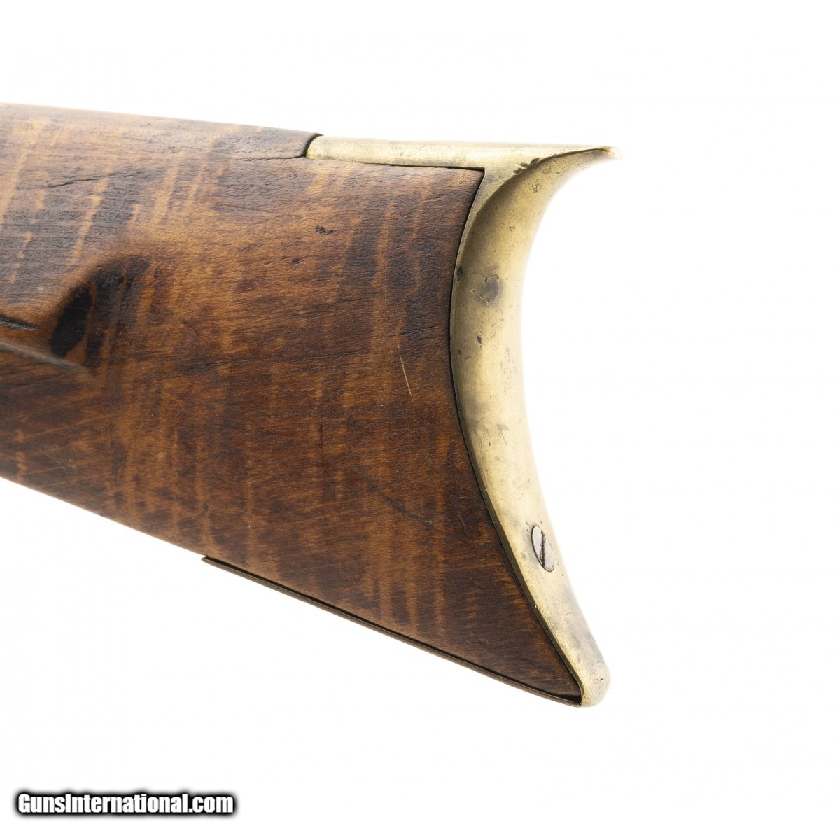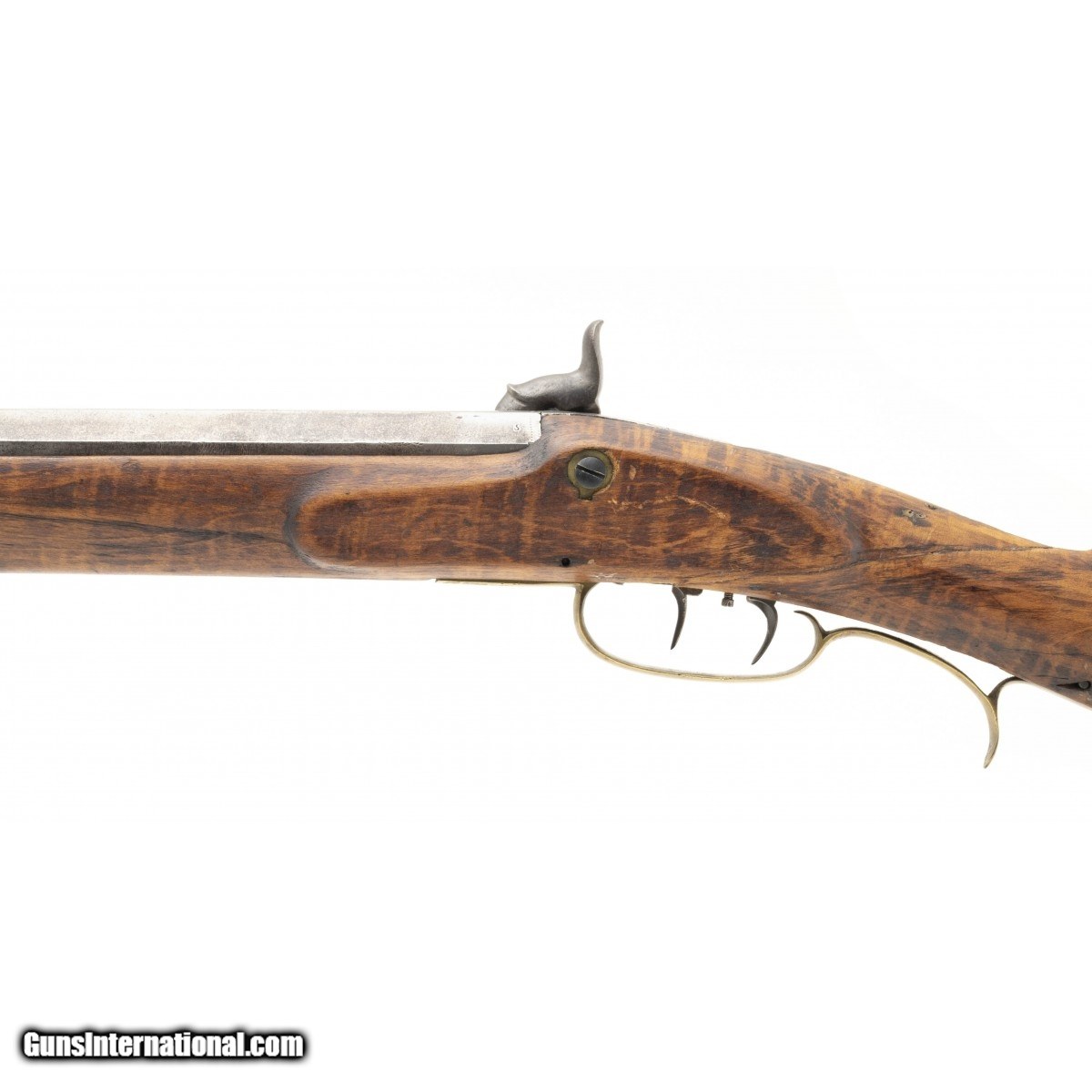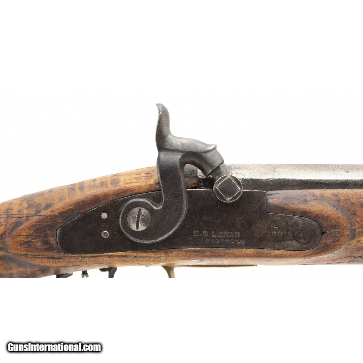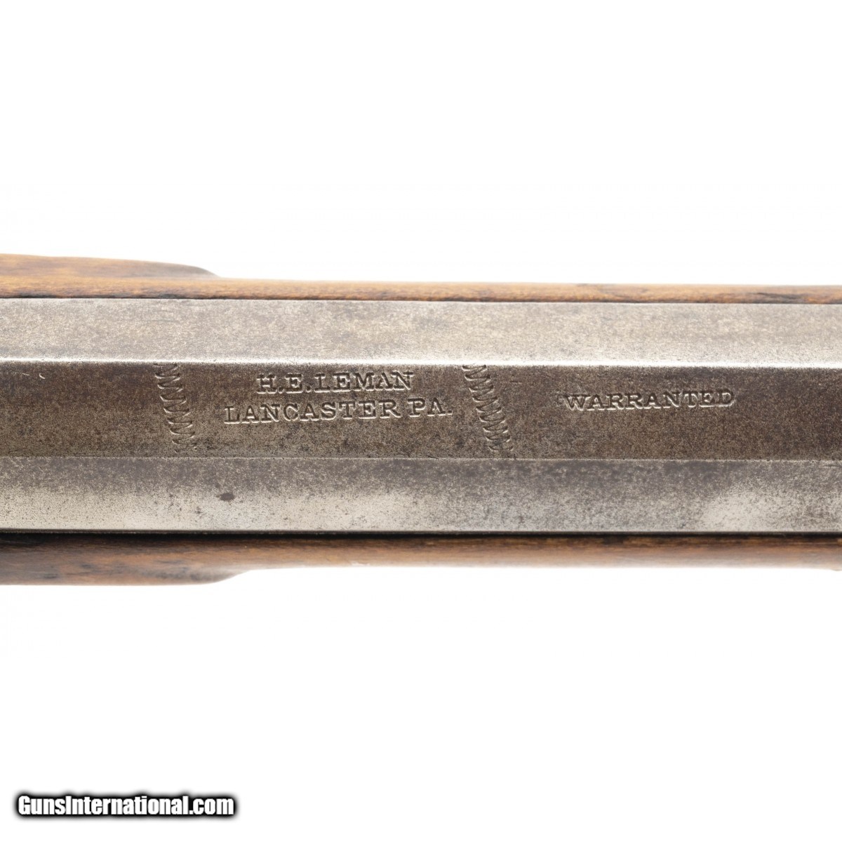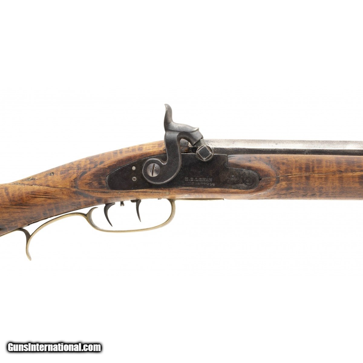 Description: "Made circa 1860. 52 caliber with a 34" a barrel. Bother the barrel and lock have the H. E. Leman markings. Wood has been cleaned. This gun has double set triggers. Action works well. SOLD |
