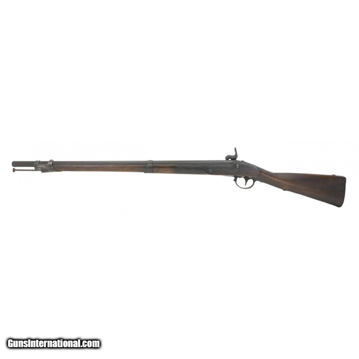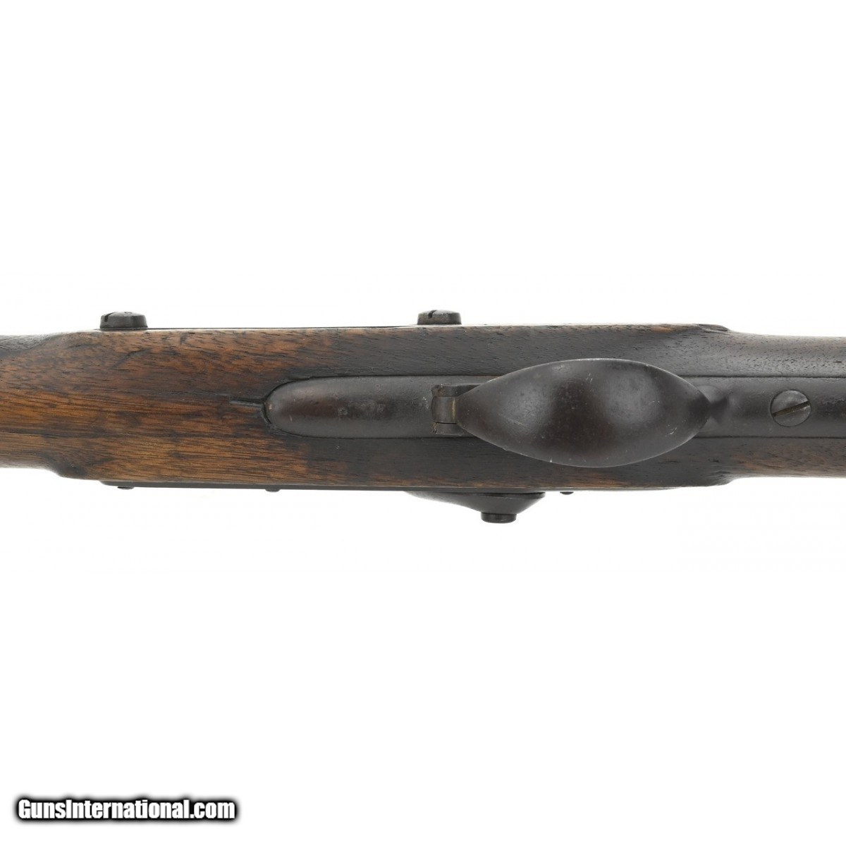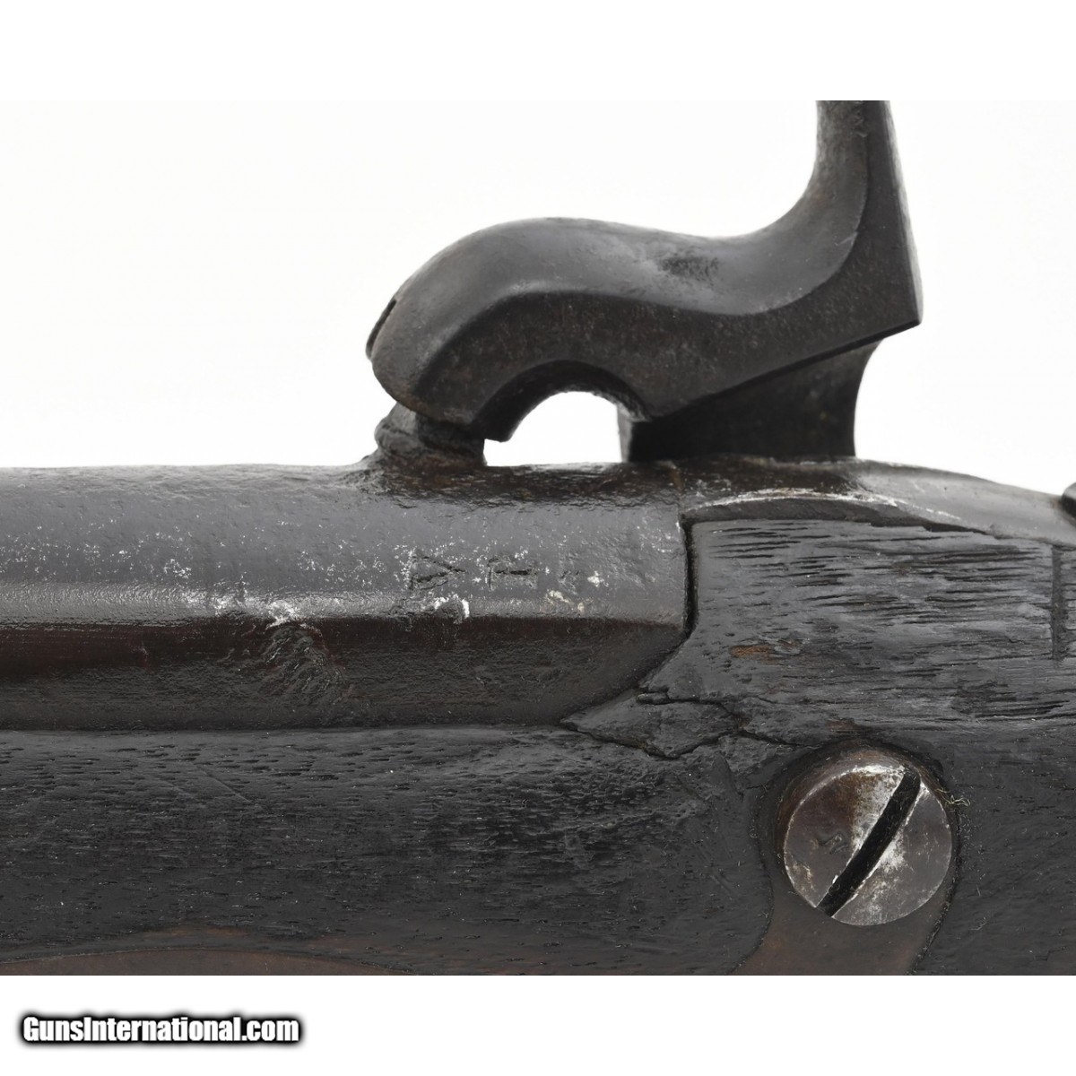 Description: " Harpers Ferry Model 1816 two-band percussion altered rifle. Overall length is approximately 46”. The 30½” round .69 caliber barrel has a fair bore. This musket was altered to percussion by the Belgian cone-in-barrel method. The hammer has a small “2” on it. The barrel has the “V/P/ (traces of eagle)” at the breech. All metal has a dark brown patina. The lock has the eagle/ “US” and “Harpers/ Ferry/1828”. The stock is good with the dents and dings of an issued gun. There are no sling swivels. The action functions correctly. Shortened muskets, like this one, may have been used military schools. This is a good representative example of a Civil War era two-band musket. SOLD Antique: Yes |