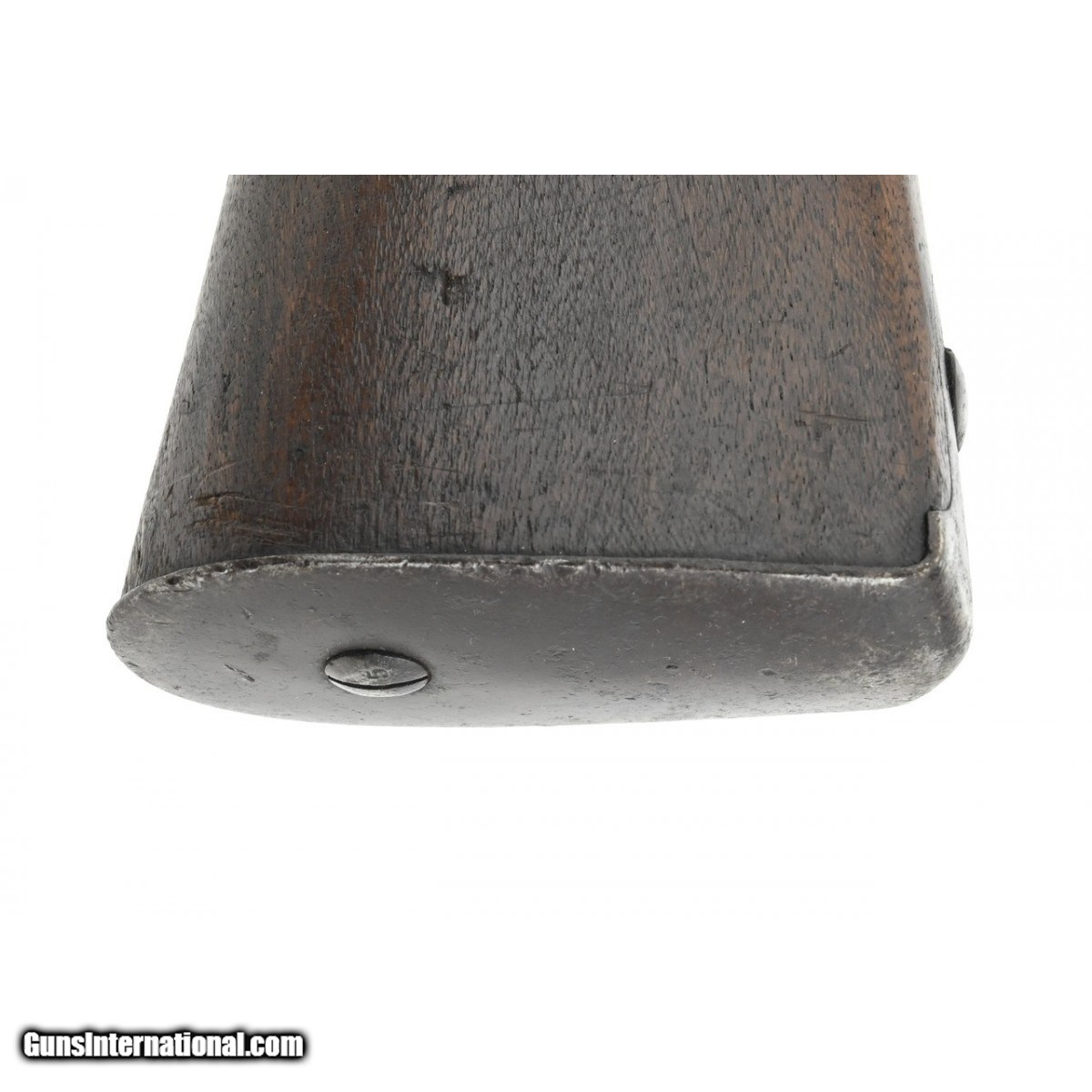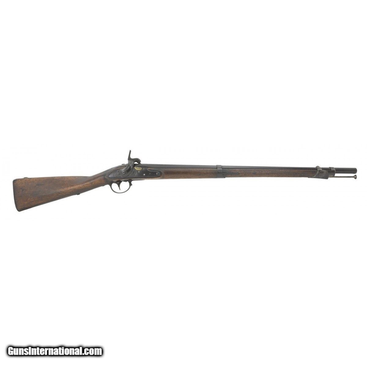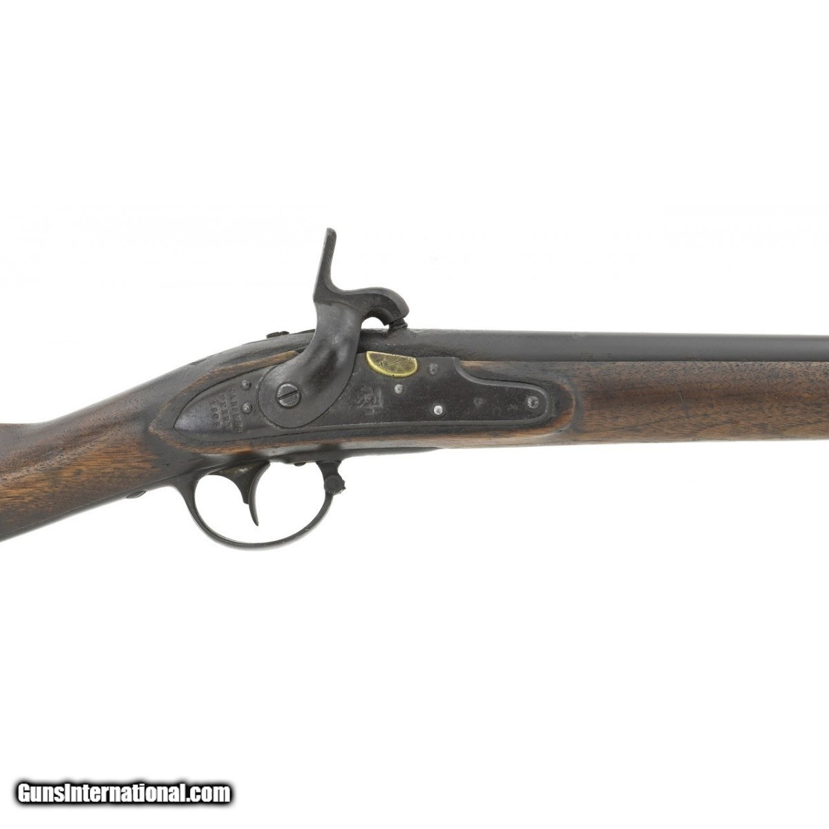 Description: " Harpers Ferry Model 1816 two-band percussion altered rifle. Overall length is approximately 46”. The 30½” round .69 caliber barrel has a fair bore. This musket was altered to percussion by the Belgian cone-in-barrel method. The hammer has a small “2” on it. The barrel has the “V/P/ (traces of eagle)” at the breech. All metal has a dark brown patina. The lock has the eagle/ “US” and “Harpers/ Ferry/1828”. The stock is good with the dents and dings of an issued gun. There are no sling swivels. The action functions correctly. Shortened muskets, like this one, may have been used military schools. This is a good representative example of a Civil War era two-band musket. SOLD Antique: Yes |