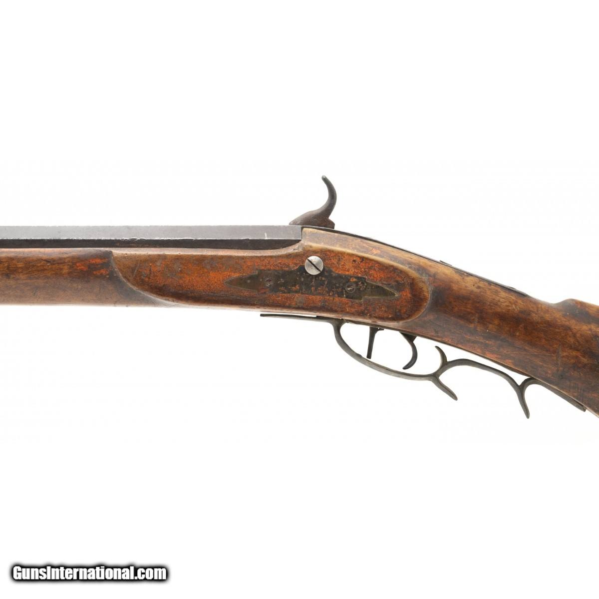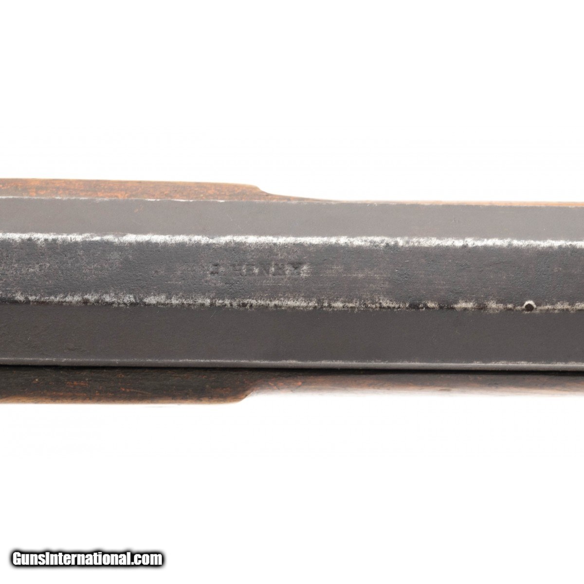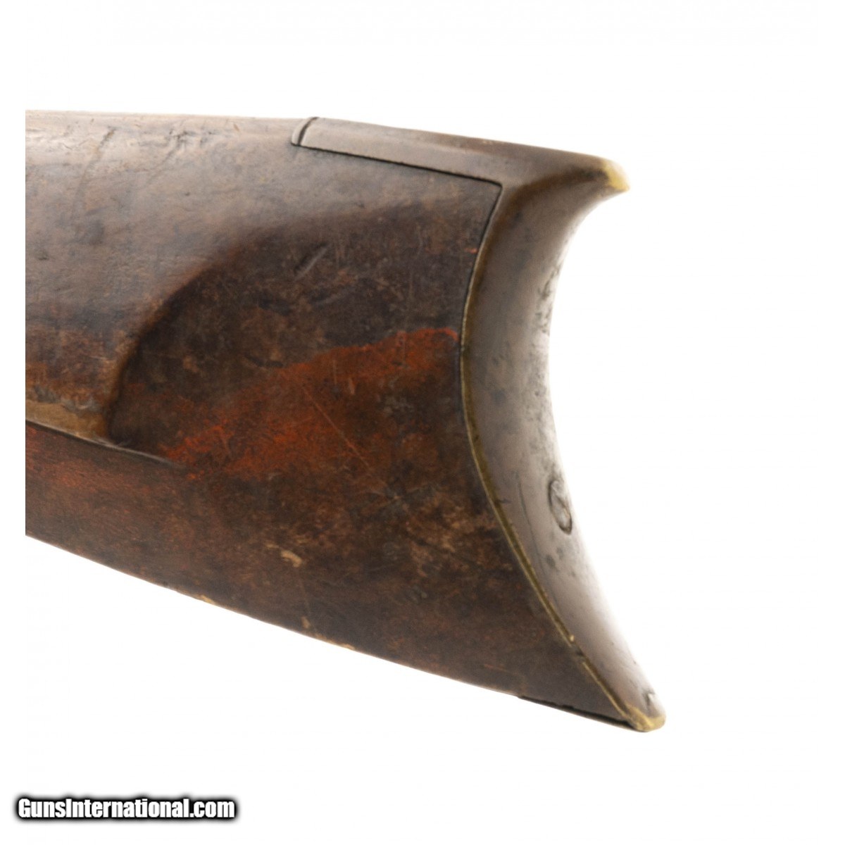 Description: "Made circa 1850. 52 caliber with a 42" heavy barrel. Metal has a dark patina. Barrel is marked “J. Henry" while the lock is indiscernible, Stock is a replacement. Very neat heavy barrel plains rifle! SOLD |
