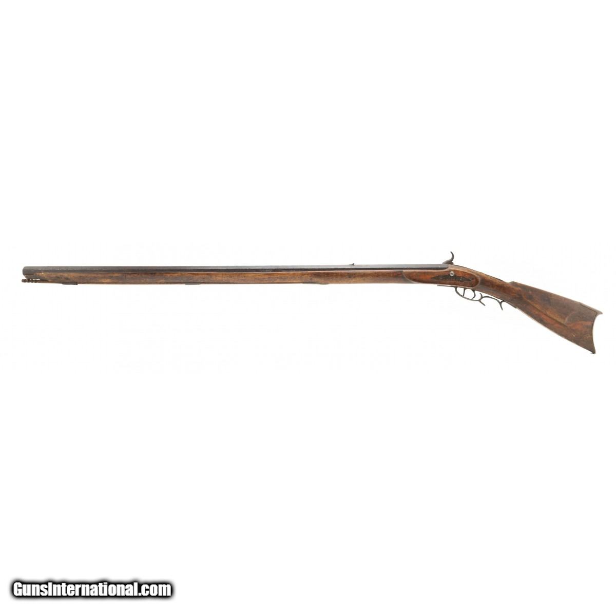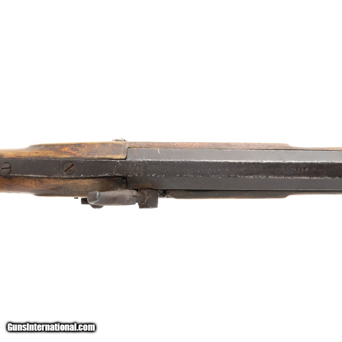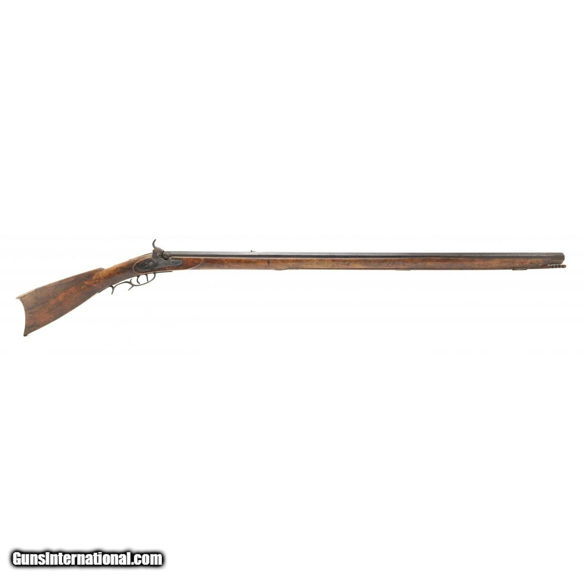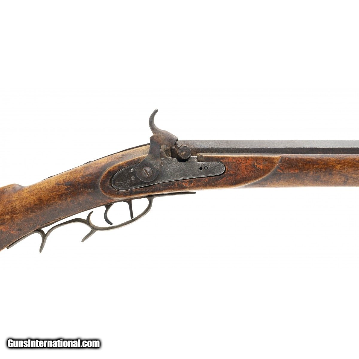 Description: "Made circa 1850. 52 caliber with a 42" heavy barrel. Metal has a dark patina. Barrel is marked “J. Henry" while the lock is indiscernible, Stock is a replacement. Very neat heavy barrel plains rifle! SOLD |