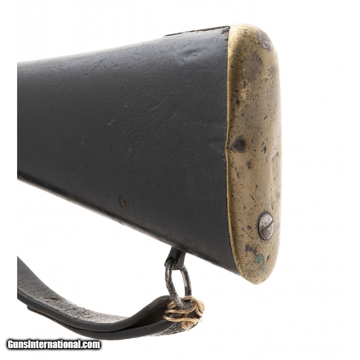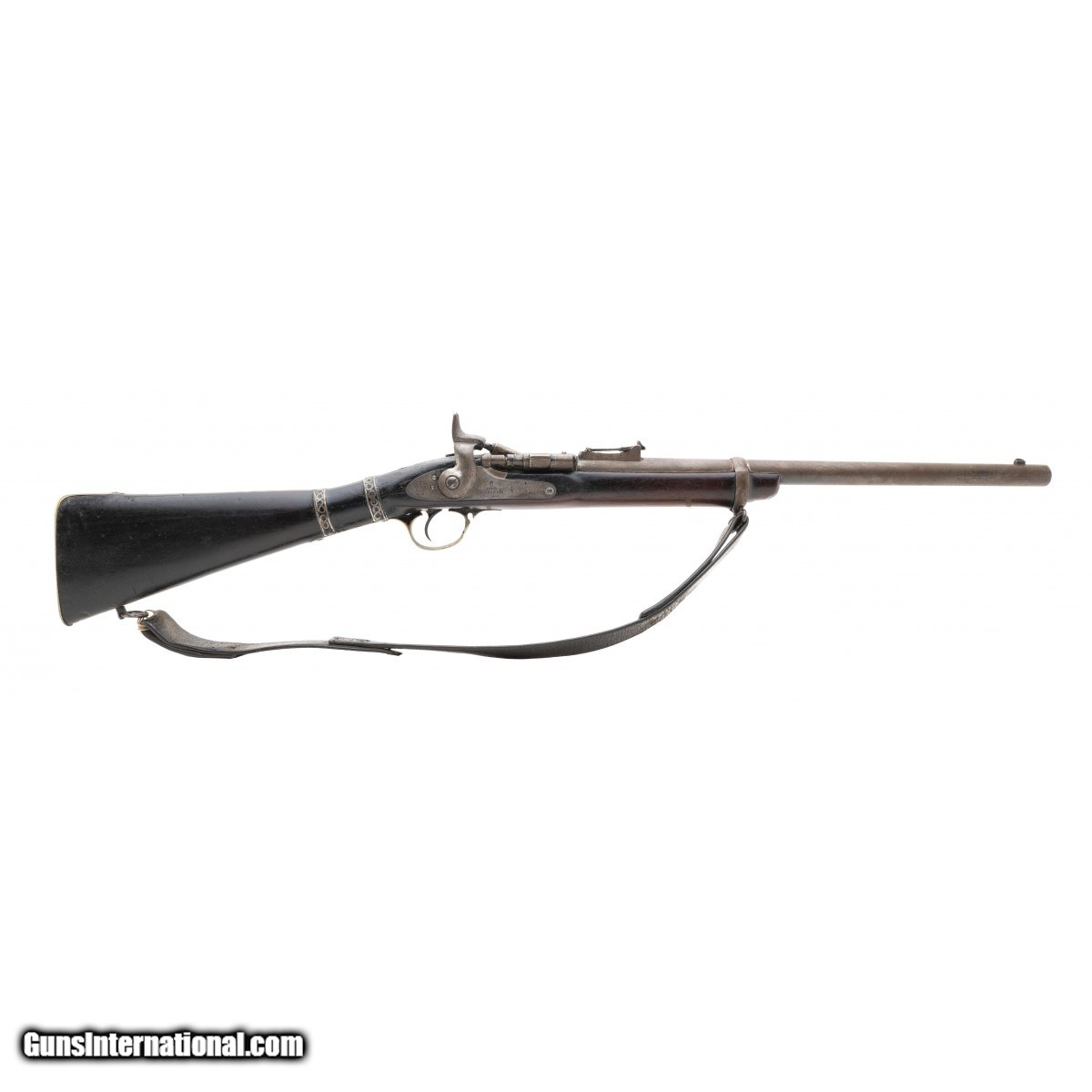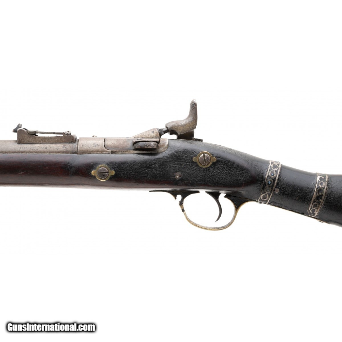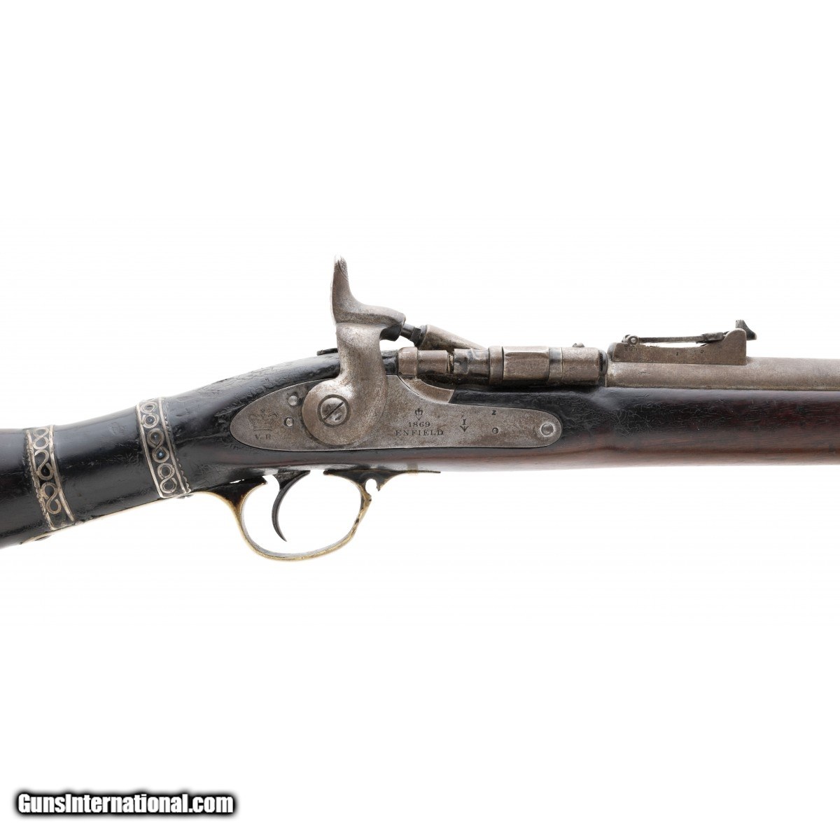 Description: " This 1869-dated British Pattern 61 Mark III Snider carbine was cut down from an Artillery Carbine, Pattern 61 Mark III, probably to make it handier for mounted operations. The overall length is 37"". The approx. 18.75"" round 577 centerfire caliber barrel has a good bore with visible rifling. It is marked at the left breech reading from the muzzle STEEL over a crown over VR over IR over a crown over E over 10 over a crown over VR over crossed swords over 2P over a crown over E over 10 over a broad arrow over WD (War Department). All the metal has a light brown patina. The left side of the chamber ring has two additional proof marks and the top has III. The breech block has the broad arrow over WD and a crown over E over 12. The lock plate has an I over broad arrow and crown over broad arrow over 1869 over ENFIELD in the center and a crown over VR at the tail. The brass trigger guard and butt plate are good with an aged patina. The unused swivel hole on the trigger guard is broken out. The stock is good with areas of finish crackle, a filled ramro channel, and two decorative Middle Eastern rings around the wrist. The evenly worn rings have a few embedded blue stones remaining. There are two sling swivels with a period leather sling. The action is stiff but functions correctly. If you like Middle Eastern guns, this one is for you. SOLD Antique: Yes |