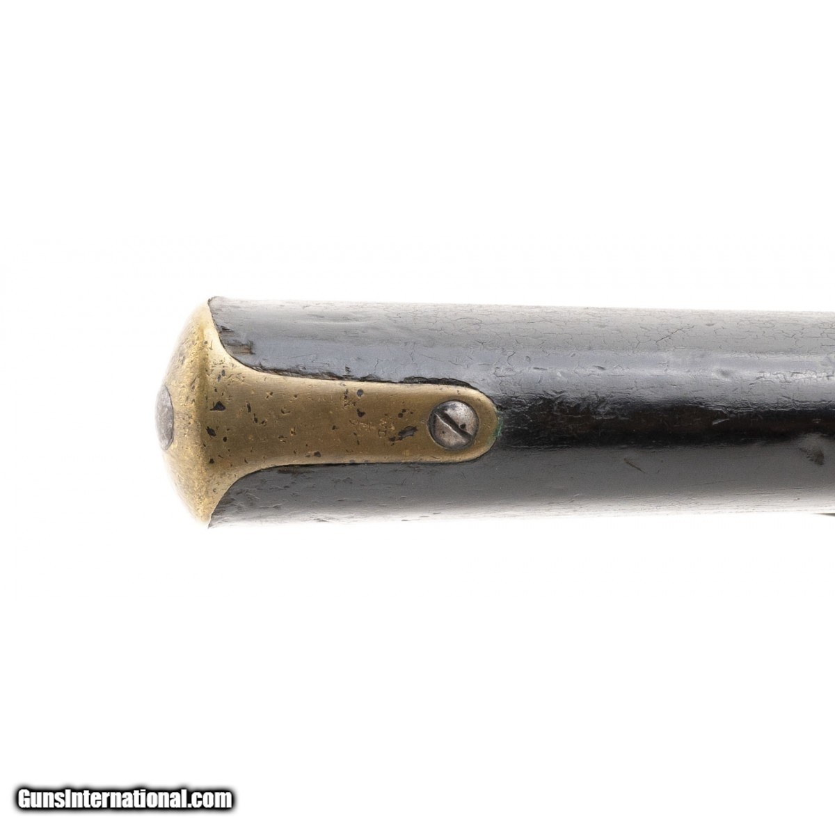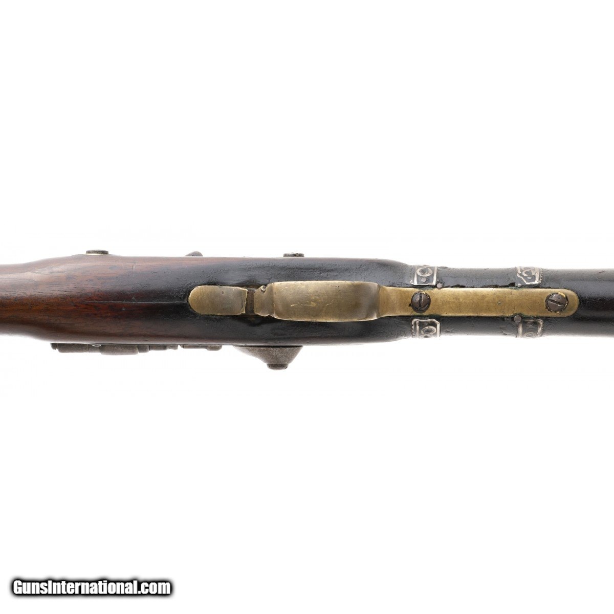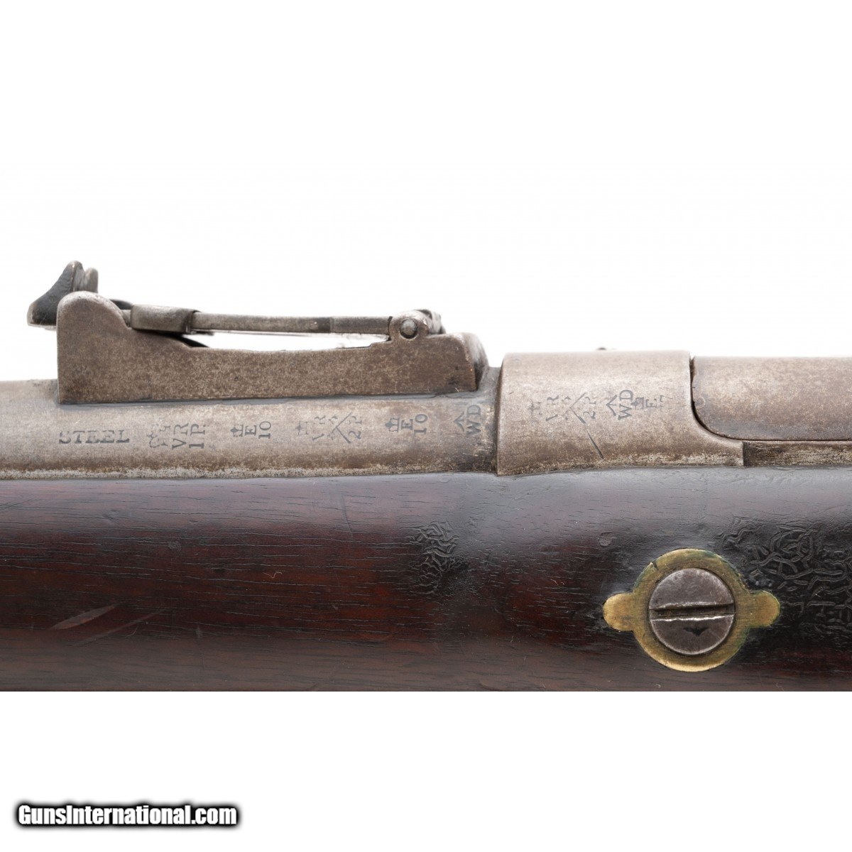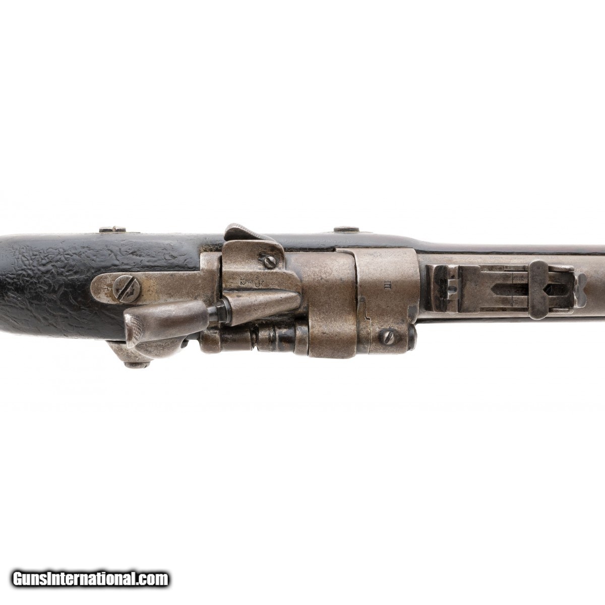 Description: " This 1869-dated British Pattern 61 Mark III Snider carbine was cut down from an Artillery Carbine, Pattern 61 Mark III, probably to make it handier for mounted operations. The overall length is 37"". The approx. 18.75"" round 577 centerfire caliber barrel has a good bore with visible rifling. It is marked at the left breech reading from the muzzle STEEL over a crown over VR over IR over a crown over E over 10 over a crown over VR over crossed swords over 2P over a crown over E over 10 over a broad arrow over WD (War Department). All the metal has a light brown patina. The left side of the chamber ring has two additional proof marks and the top has III. The breech block has the broad arrow over WD and a crown over E over 12. The lock plate has an I over broad arrow and crown over broad arrow over 1869 over ENFIELD in the center and a crown over VR at the tail. The brass trigger guard and butt plate are good with an aged patina. The unused swivel hole on the trigger guard is broken out. The stock is good with areas of finish crackle, a filled ramro channel, and two decorative Middle Eastern rings around the wrist. The evenly worn rings have a few embedded blue stones remaining. There are two sling swivels with a period leather sling. The action is stiff but functions correctly. If you like Middle Eastern guns, this one is for you. SOLD Antique: Yes |