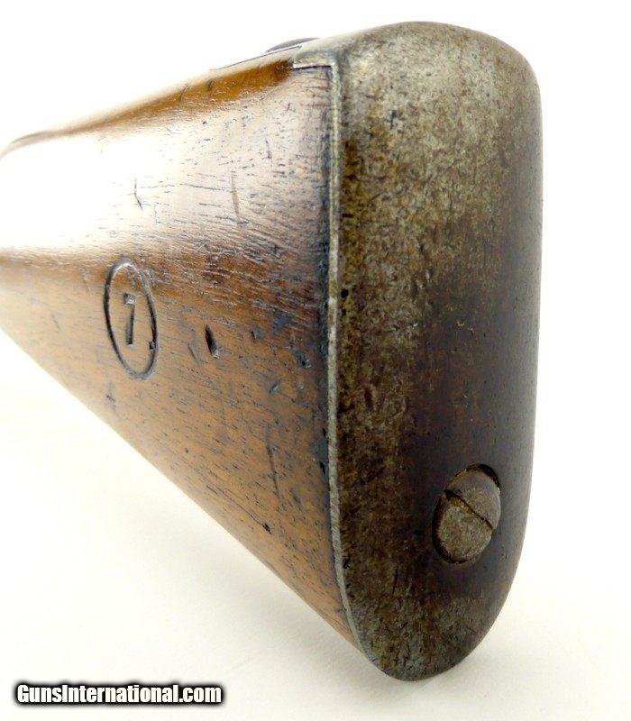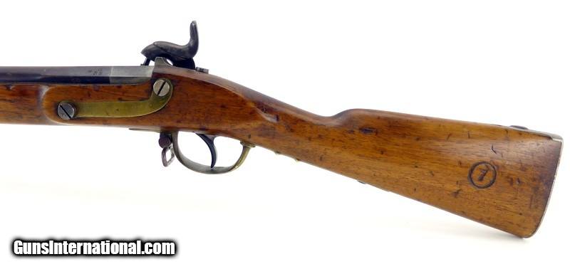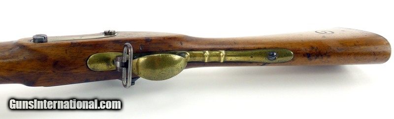 Description: "Percussion European Boys Musket. 25"" barrel. Steel buttplate; all other furniture is brass. Lock is not marked. Stock has been cleaned and has a 7 in a circle. Probably a school gun. Has a French look but could be Belgian. Butt, hammer, and barrel have dark patina. Cupped hammer face nipple is fine. Antique: Yes Price: $2,250.00 Contact Seller |