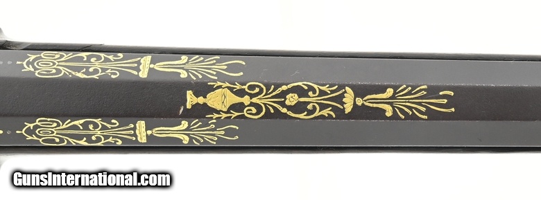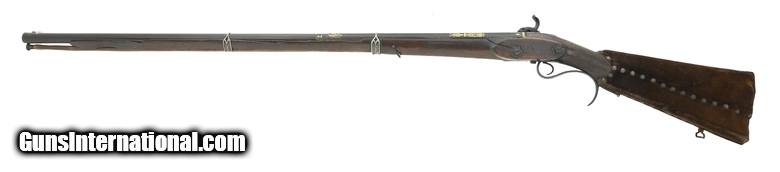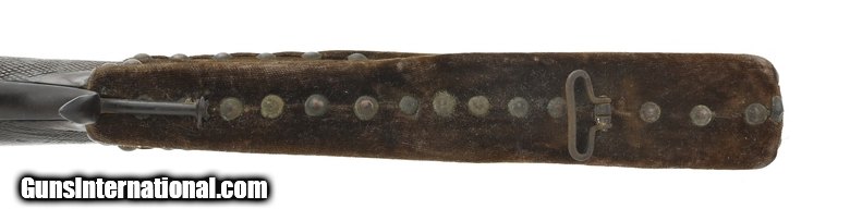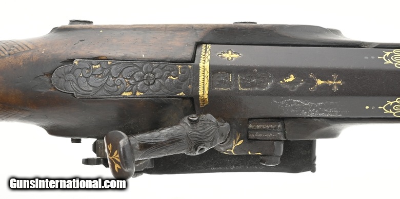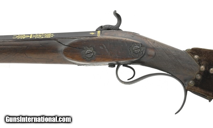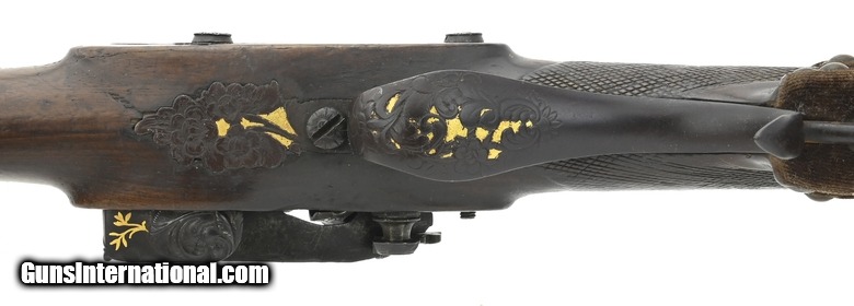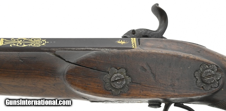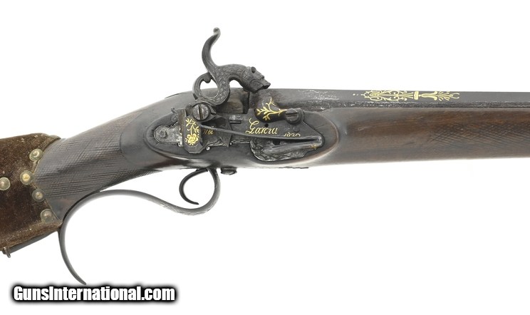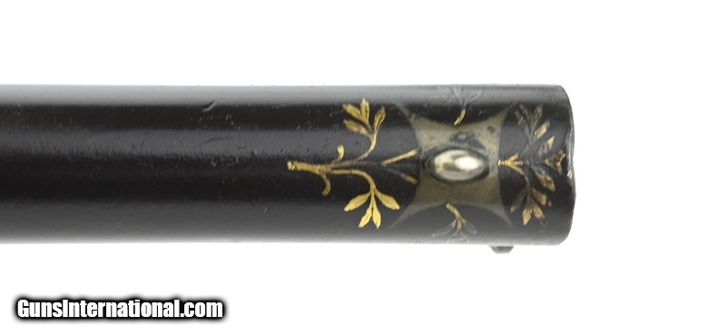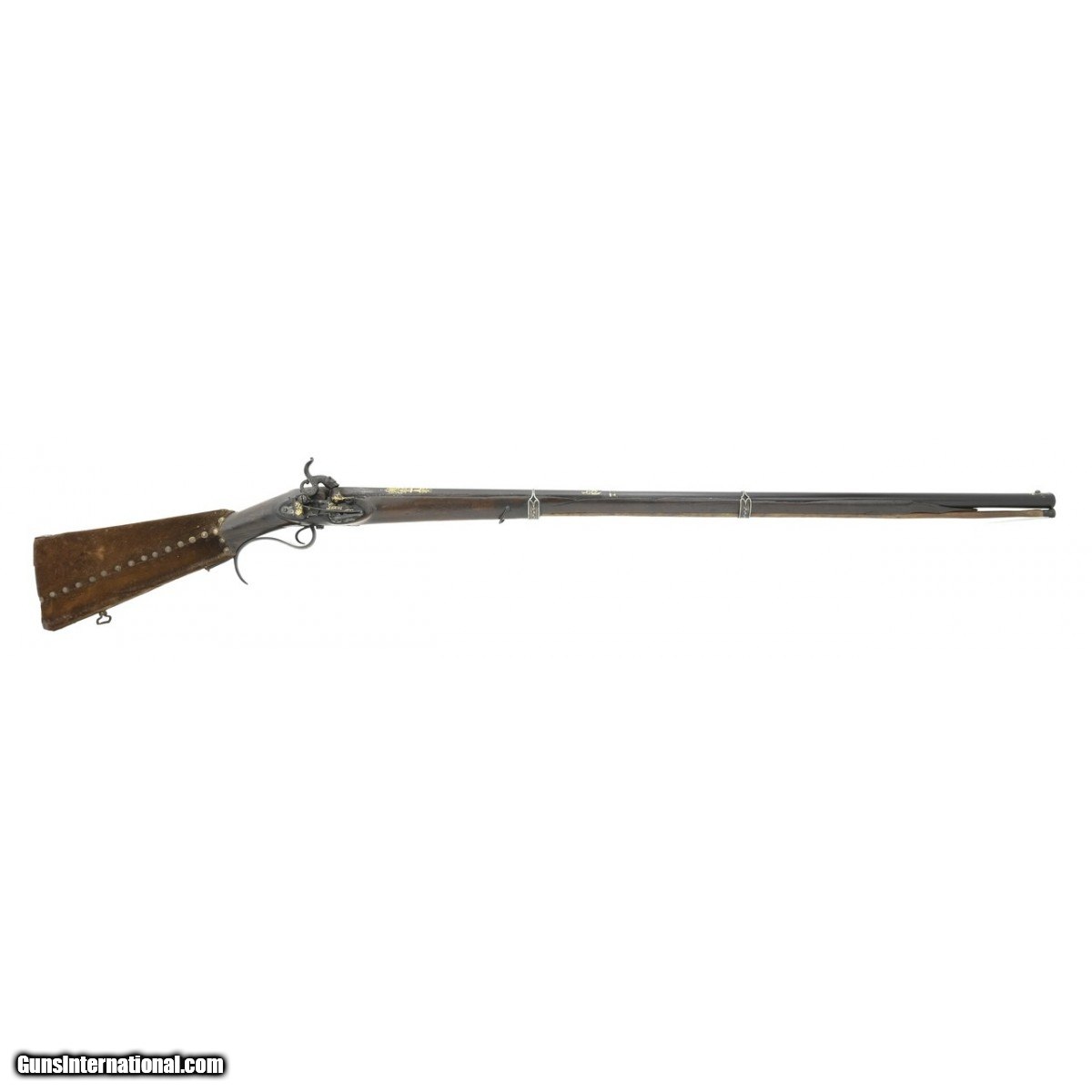 Description: " Percussion Miquelet Lock Fowler by Antonio Garcia. Dated 1830. Antonio was the son of Francisco Garcia, Madrid gunmaker circa 178801793. The overall length is approximately 52½". The 37½ocatgon to round .70 caliber barrel has a fair smooth bore. The barrel has decorative gold inlay at the front sight. Wedding band area, and approximately 7½" of the breech area. The barrel tang is engraved and has some gold inlay. The lock has decorative engraving and gold inlay. Its is marked “Garcia" and “1830" in gold. The hammer is engraved and has an animal head/fantasy creature. The trigger guard has floral engraving with traces of gold inlay. Interestingly, the bottom of the frizzen spring is chiseled and gold inlaid, the metal has an overall smooth brown patina with light pitting around the bolster. The stock is fair with missing wood toward the muzzle and along the barrel and a couple of repairable cracks. The butt has a brown felt/velvet covering tacked over it. The action functions correctly. This is a good example of a very high quality Spanish percussion fowler at an affordable price. Some good wood repairs could easily make this gun worth several hundred dollars more. SOLD Antique: Yes |
