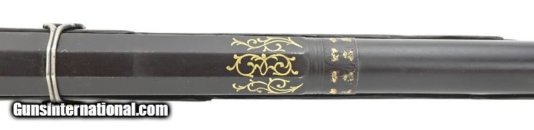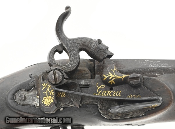 Percussion Miquelet Lock Fowler by Antonio Garcia. Dated 1830. Antonio was the son of Francisco Garcia, Madrid gunmaker circa 178801793. The overall length is approximately 52½". The 37½ocatgon to round .70 caliber barrel has a fair smooth bore. The barrel has decorative gold inlay at the front sight. Wedding band area, and approximately 7½" of the breech area. The barrel tang is engraved and has some gold inlay. The lock has decorative engraving and gold inlay. Its is marked “Garcia" and “1830" in gold. The hammer is engraved and has an animal head/fantasy creature. The trigger guard has floral engraving with traces of gold inlay. Interestingly, the bottom of the frizzen spring is chiseled and gold inlaid, the metal has an overall smooth brown patina with light pitting around the bolster. The stock is fair with missing wood toward the muzzle and along the barrel and a couple of repairable cracks. The butt has a brown felt/velvet covering tacked over it. The action functions correctly. This is a good example of a very high quality Spanish percussion fowler at an affordable price. Some good wood repairs could easily make this gun worth several hundred dollars more.