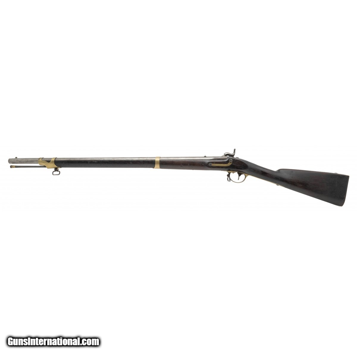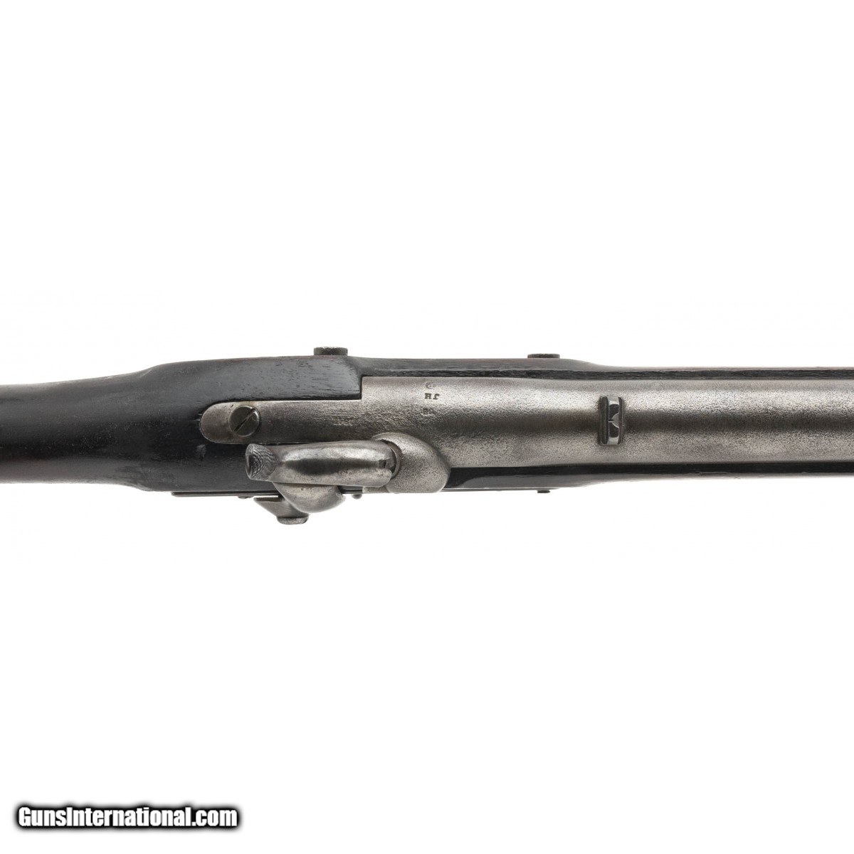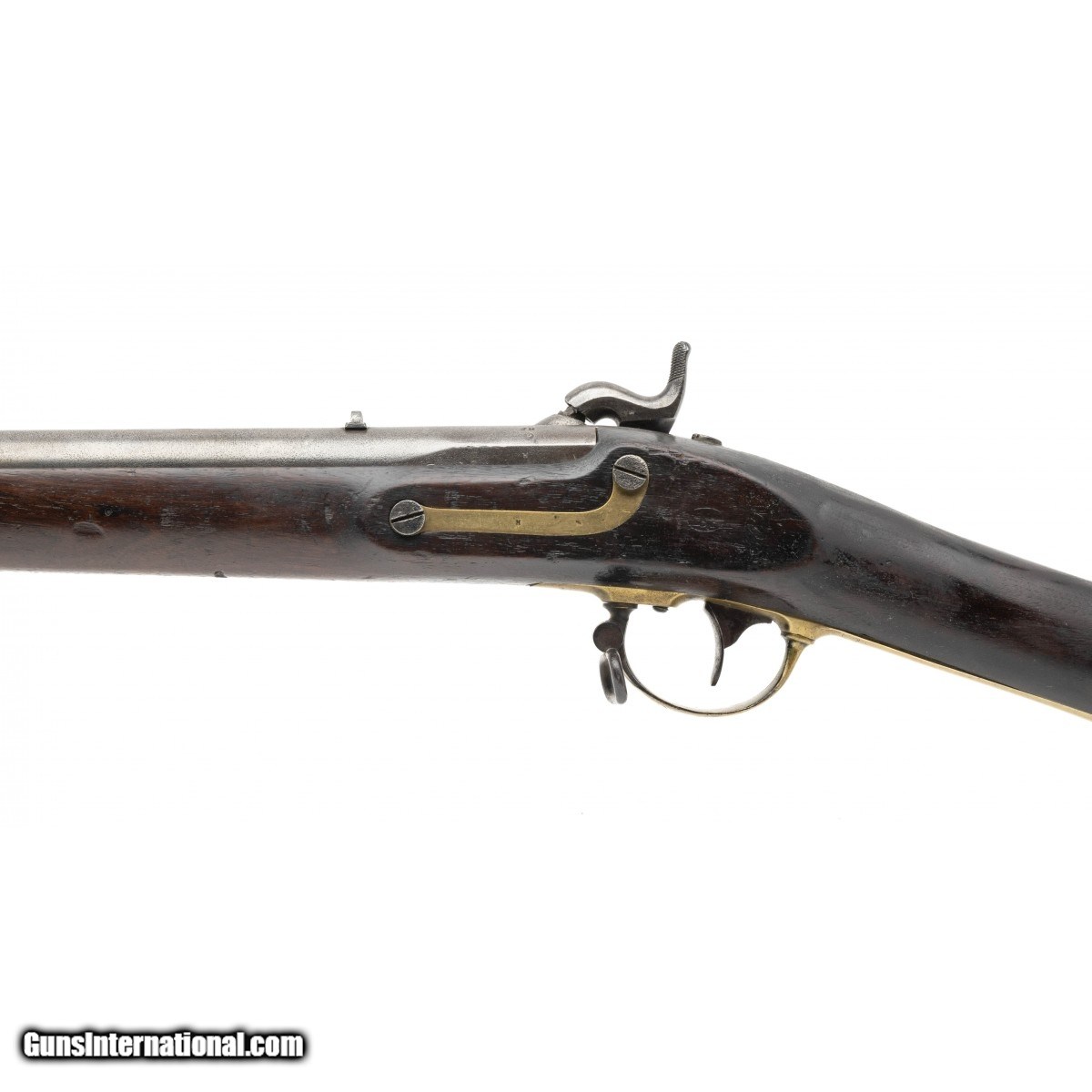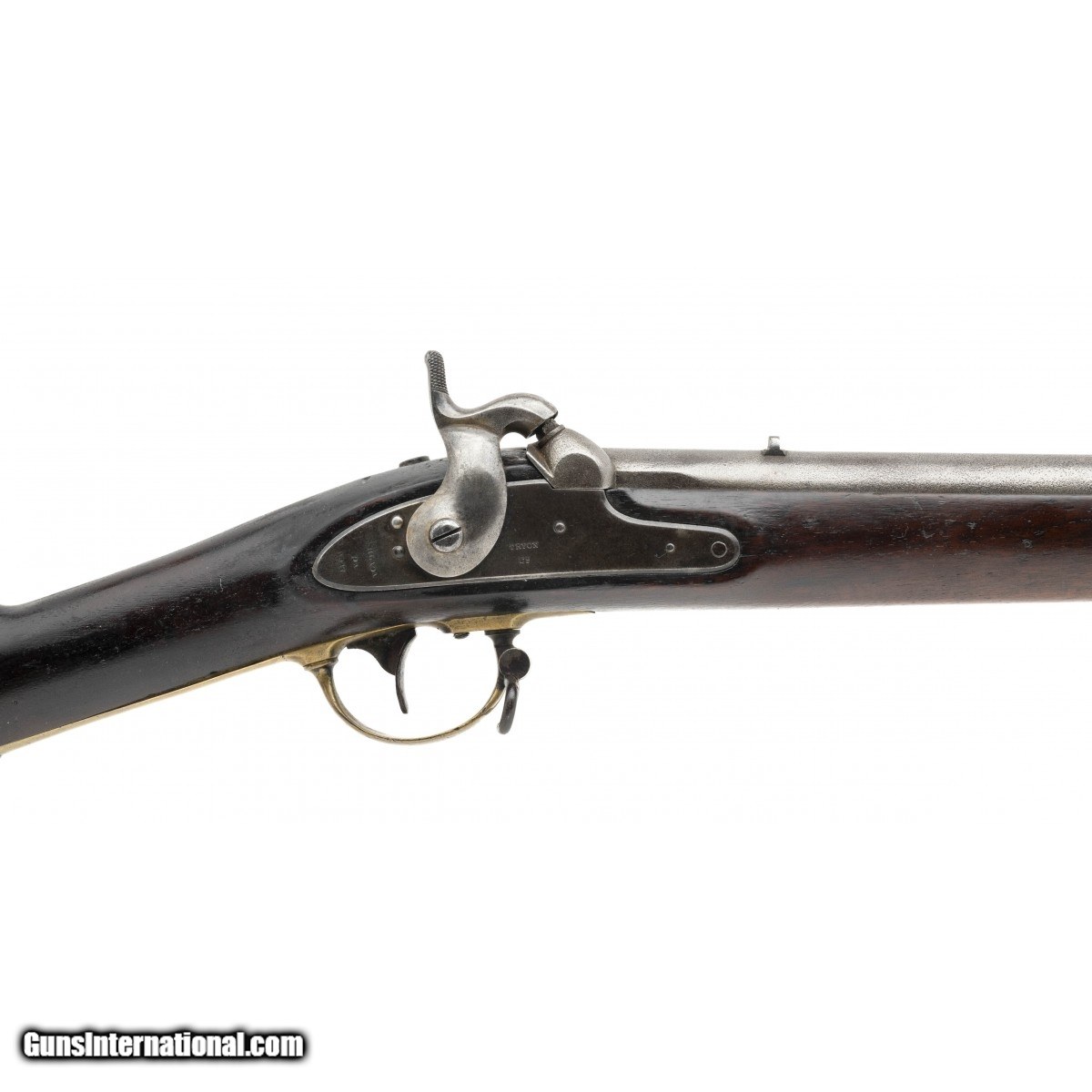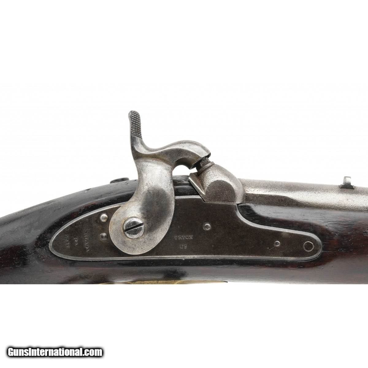 Description: "NSN, made in 1847, .54 caliber, 33"" proofed rifled barrel. Only 5,000 Tryon were manufactured for the Government. Barrel is a light grey patina with pin-prick surface oxidation noted. A faint ""1847"" is visible on the breech with inspector marks noted. Stock shows light handling wear with two handsome cartouches visible. Lock plate is marked ""Tryon/US"" rear of the hammer is marked ""PHILADA/PA/1847"". Action holds at half and full cock. The brass furniture is a nice dull gold color. There is a good chance this rifle saw service in the Mexican American War! Antique: Yes Price: $2,995.00 Contact Seller |