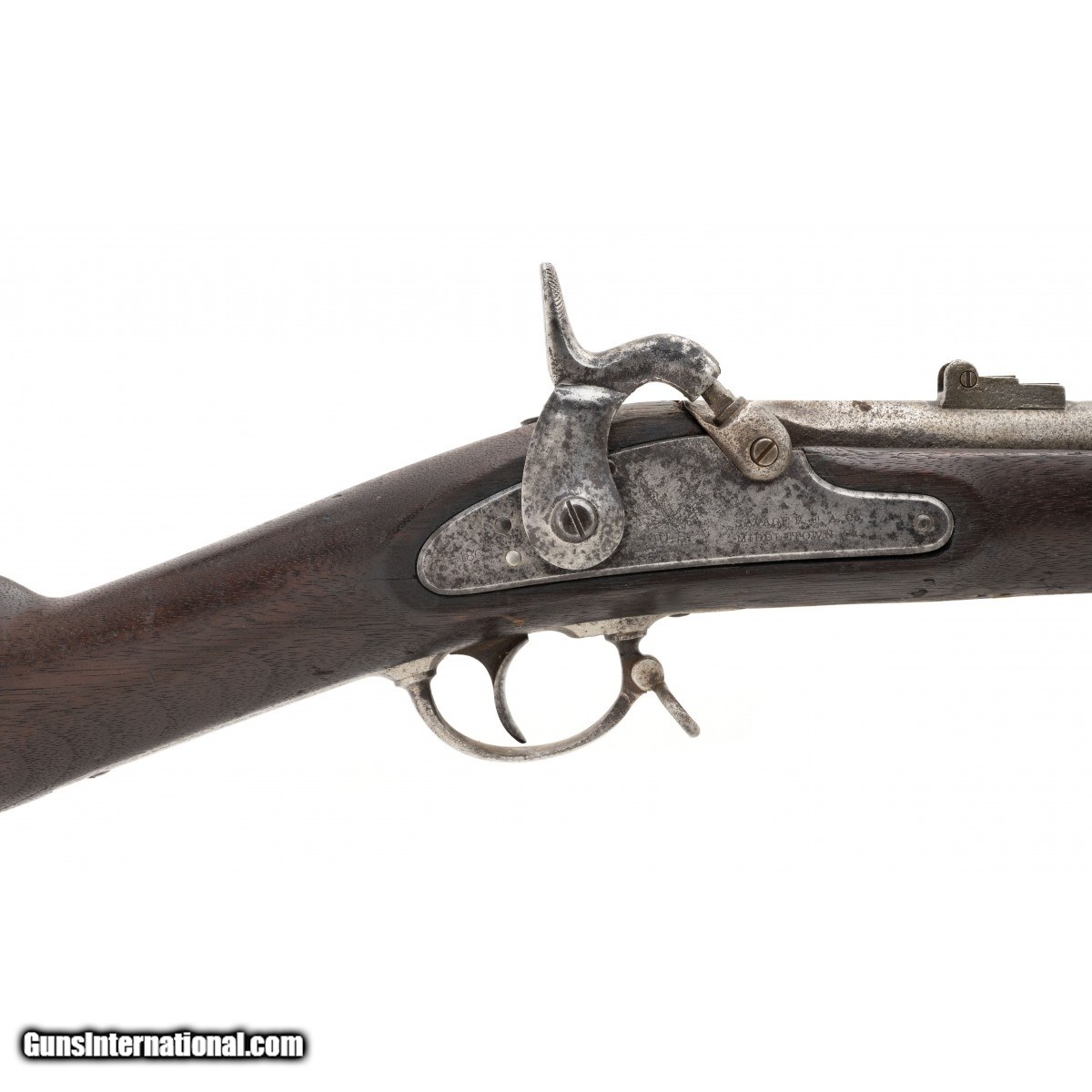 Description: " NSN, .58 caliber, 40"" round rifled barrel contract civil war musket by Savage with a lock plate dated 1863. Metal is a light grey patina with scattered oxidation noted. Action functions correctly, wood is good with some usage and wear noted. SOLD Antique: Yes |