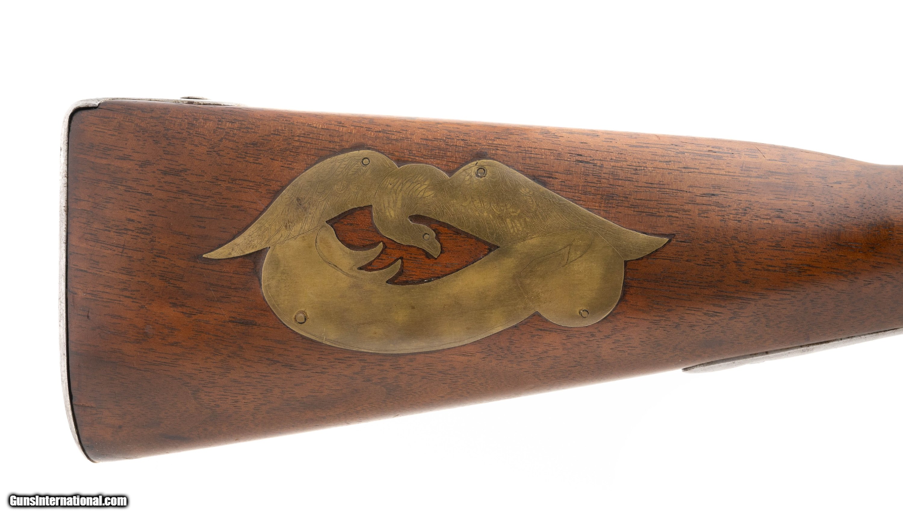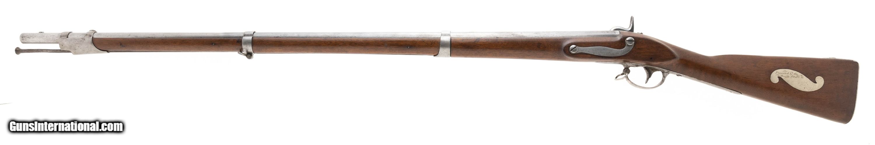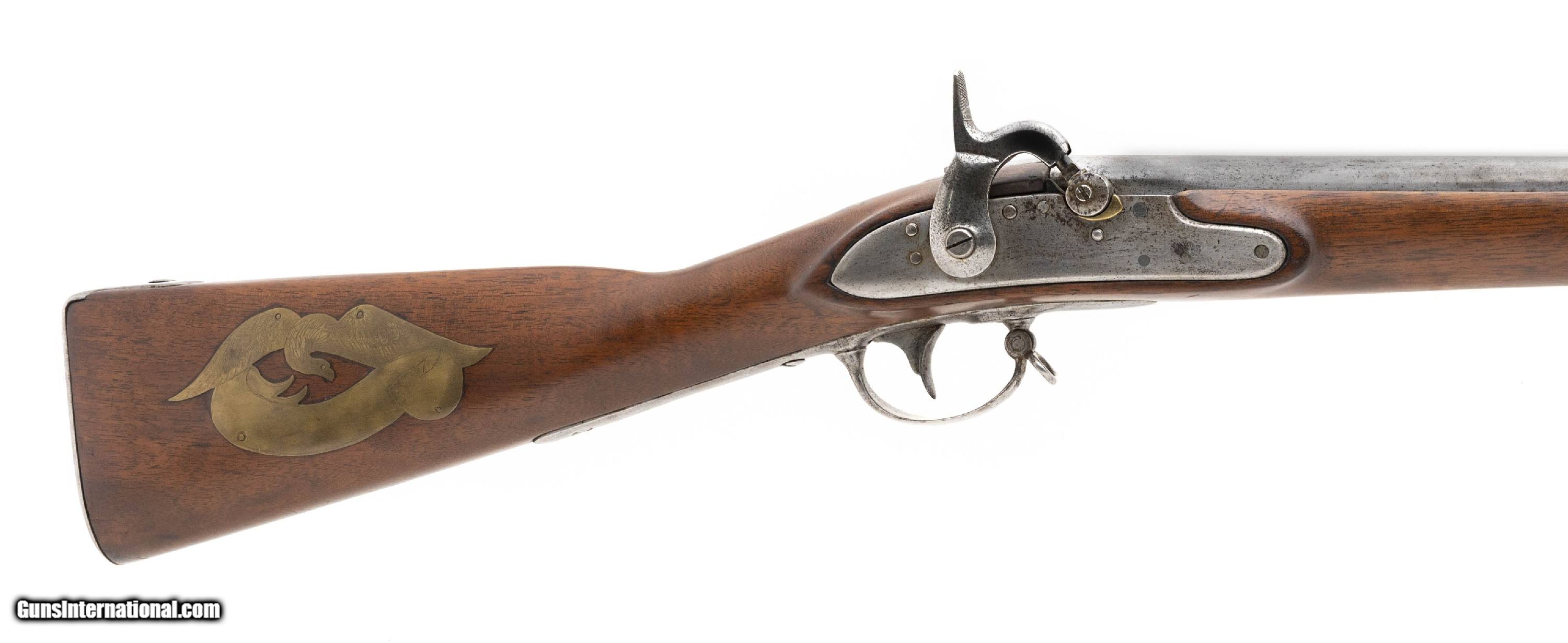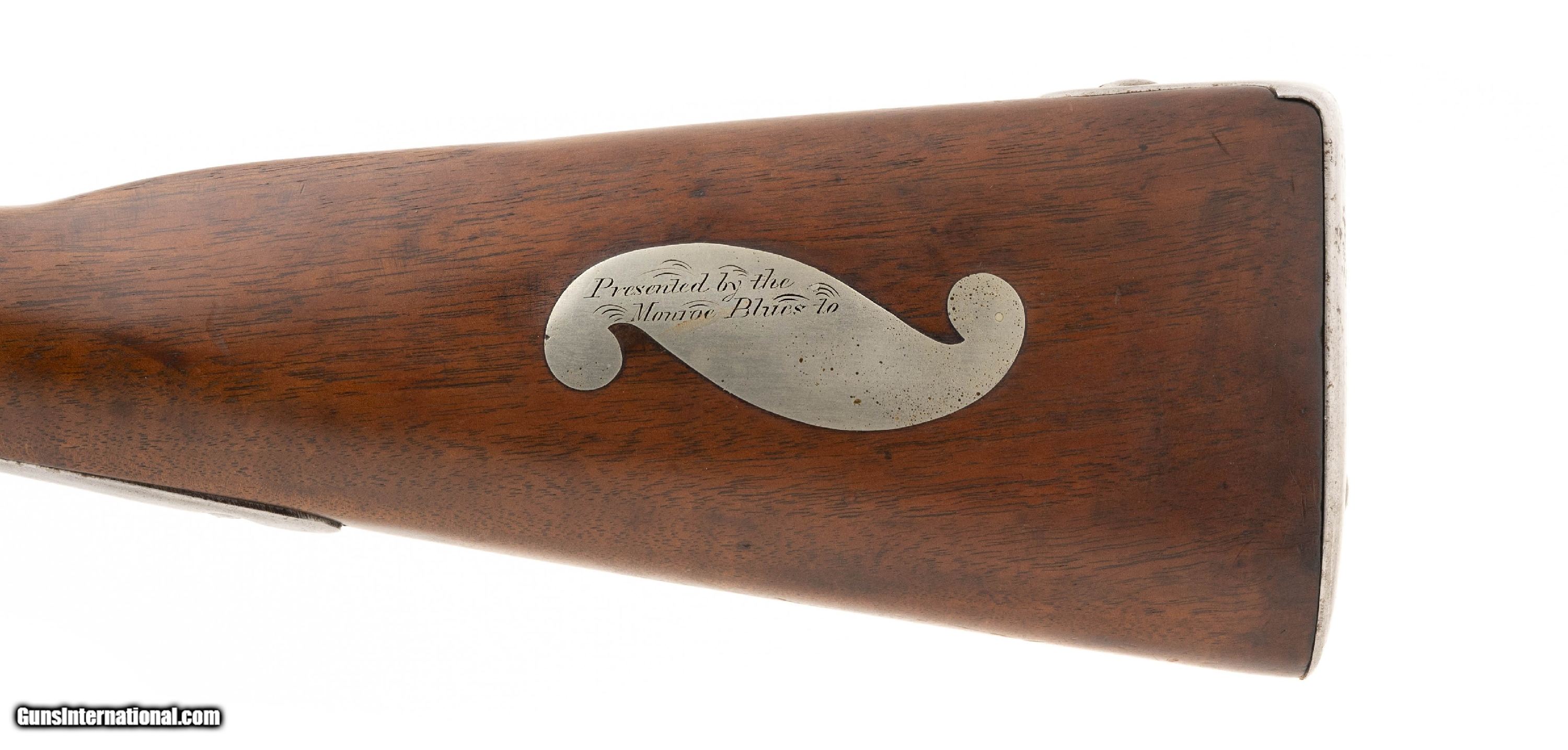 Description: "U.S. Model 1840 percussion conversion rifle marked ""Monroe Blues"". Has a nice inlay on left-hand side of the stock that reads ""Presented by the Monroe Blues to (there is space to be filled in)"".The reverse side of the stock has an eagle in flight brass inlay. Both the Union and the Confederacy had Monroe Blues units, the eagle leads us to believe this was probably Union. The Union Monroe Blues were theĀ 12th Militia of New York. Very interesting gun that could be further researched. Antique: Yes Price: $4,750.00 Contact Seller |