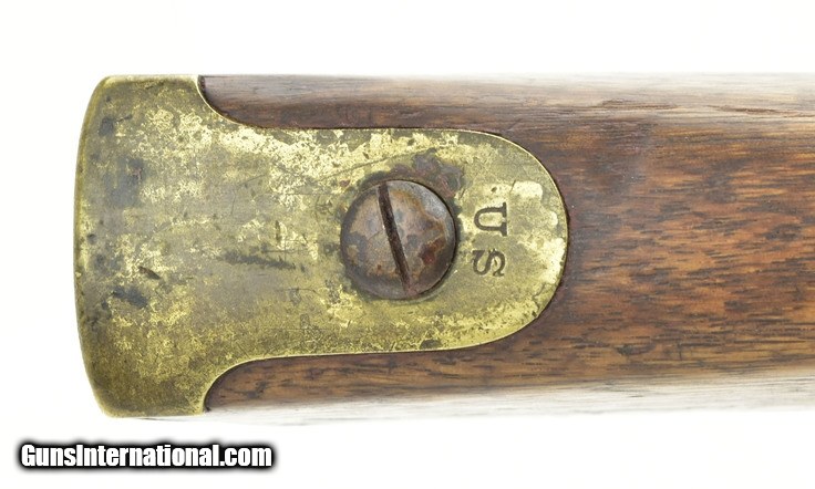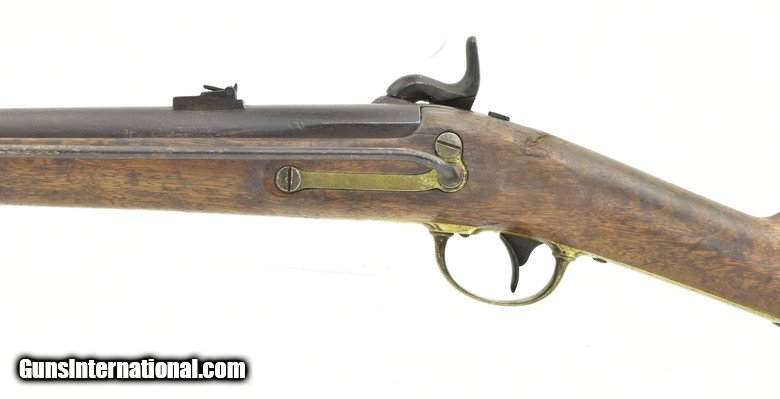 Description: "U.S. Model 1847 Cavalry Musketoon. Rifled and sighted .69 caliber 26" round barrel with barely visible rifling. “1848" dated Springfield lock with eagle over “U.S" at center “VP" over eagle on barrel. No visible barrel date. 9¼" Sling bar with no ring. Two-leaf rear sight with the right end of the short-range leaf missing. Sleeve type chain ramrod retainer missing sleeve and chain. Ramrod is a blacksmith made replacement. The nipple is broken flush to the bolster. Metal is an even brown patina with the lock and hammer a gray bright patina. Action functions correctly. Wood is good with a visible cartouche and a gouge forward of the rear band. There are no cracks or chips. The furniture has an even aged patina. The Cavalry Musketoons were heavily used during the Mexican War and are hard to find today, especially the sleeved chain variant. SOLD Antique: Yes |