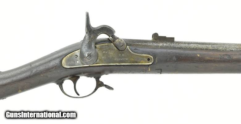 Description: "U.S. Model 1861 Percussion Contract Rifle. Manufactured by Norwich Arms Co. Metal is gray with some areas of surface pitting by the nipple and rear sight. Lock is dated 1863 with “US" over “Norwich". Stock has dings and letters carved in the wood. The letter “N" is in the butt stock and “E" is forward of the trigger guard. Affordable Civil War musket! SOLD Antique: Yes |