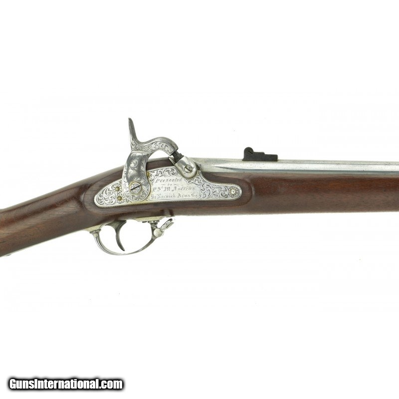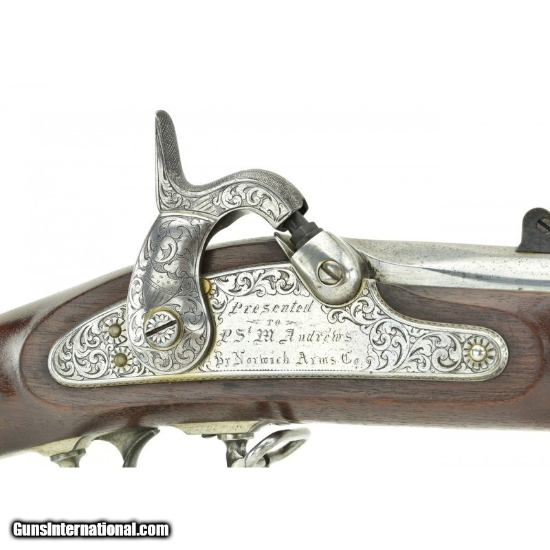 Description: "U.S. Model 1861 Percussion Rifle-Musket with Engraved Lock. Beautiful model 1861 percussion rifle by Norwich Arms Co. Musket is in excellent condition! Lock is engraved “Presented to P. St. M. Andrews by Norwich Arms Co.". Research shows that Mr. Andrews was a superintendent for the railroad. He was 44 years old when he was drafted in 1863. Metal is in armory bright. Lock and hammer are beautifully engraved. Stock is excellent. A very beautiful Civil War engraved musket! SOLD Antique: Yes |
