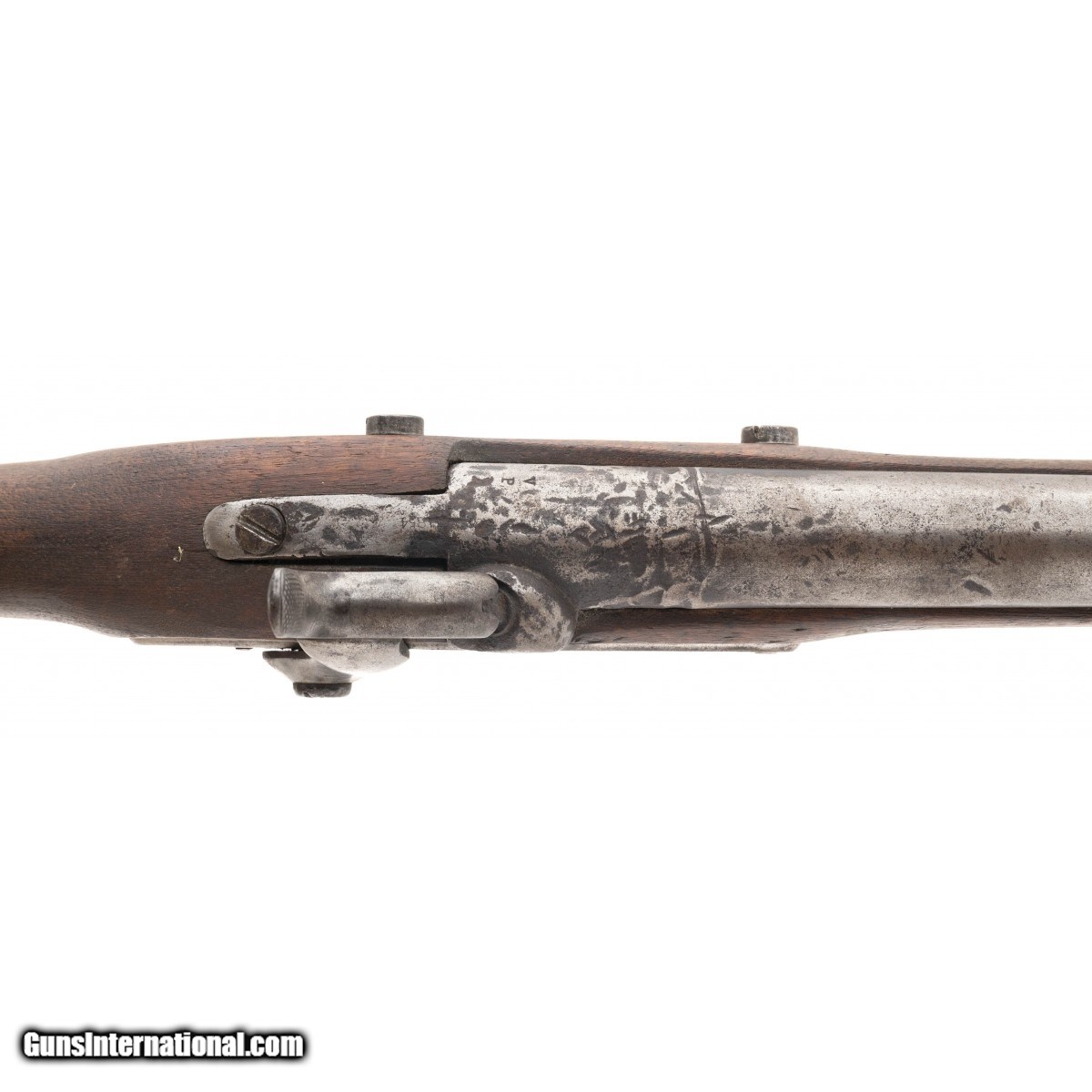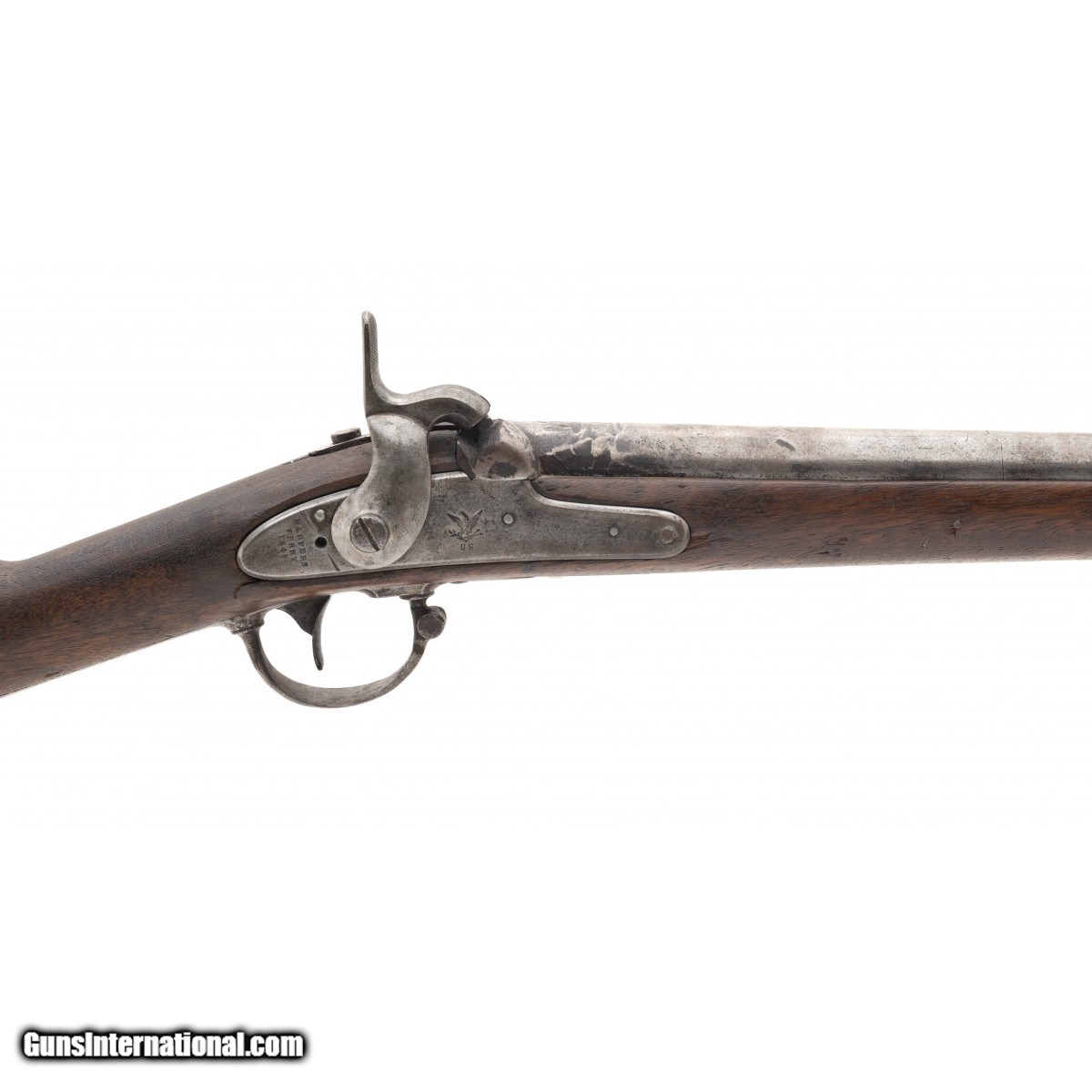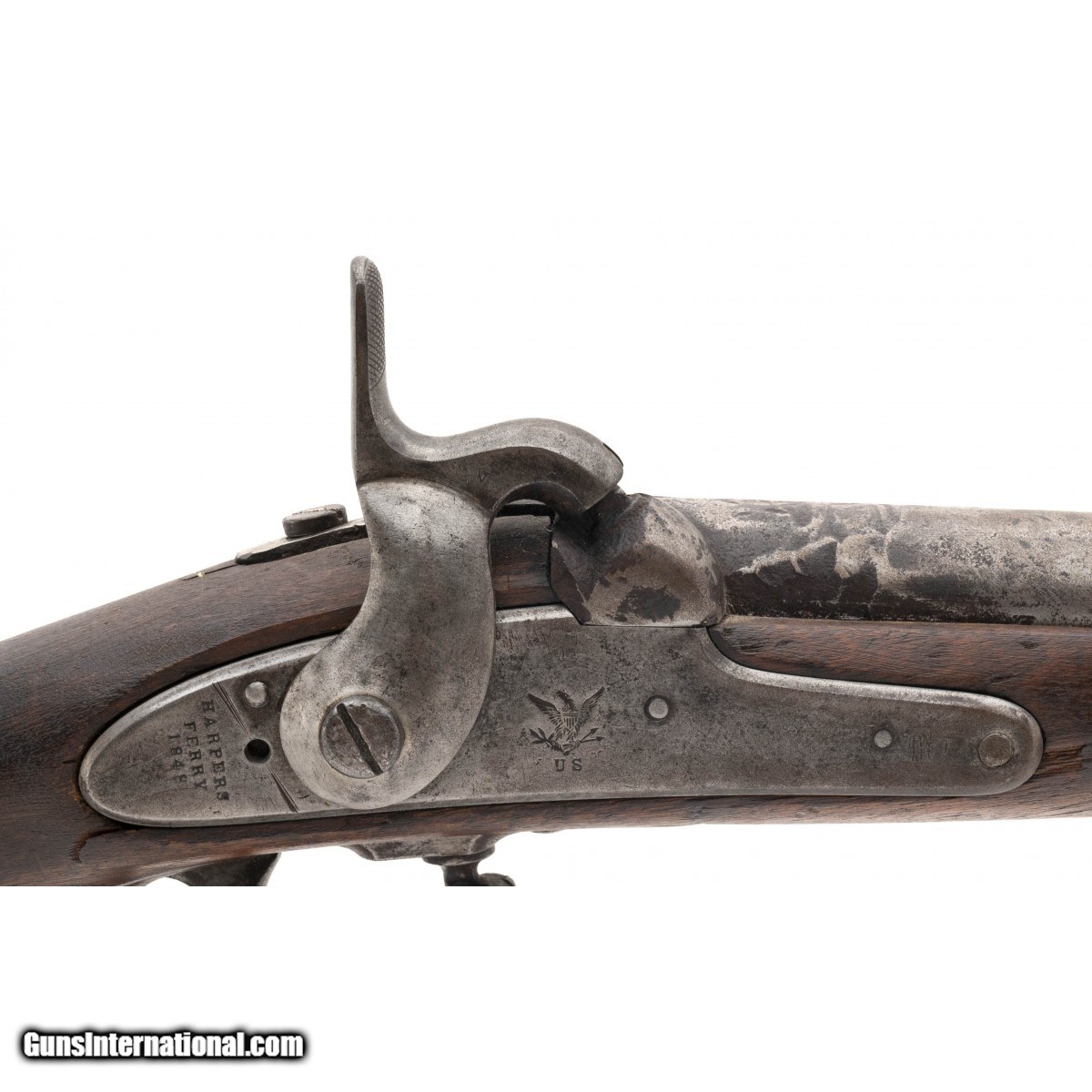 Lock is dated 1848 and marked ""Harpers Ferry"". Barrel has been shortened to 26"". Metal has a greying patina. Stock has an unusual arrow symbol on right hand side. Action works perfectly. Very reasonably priced.