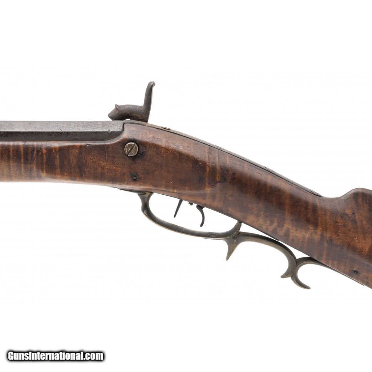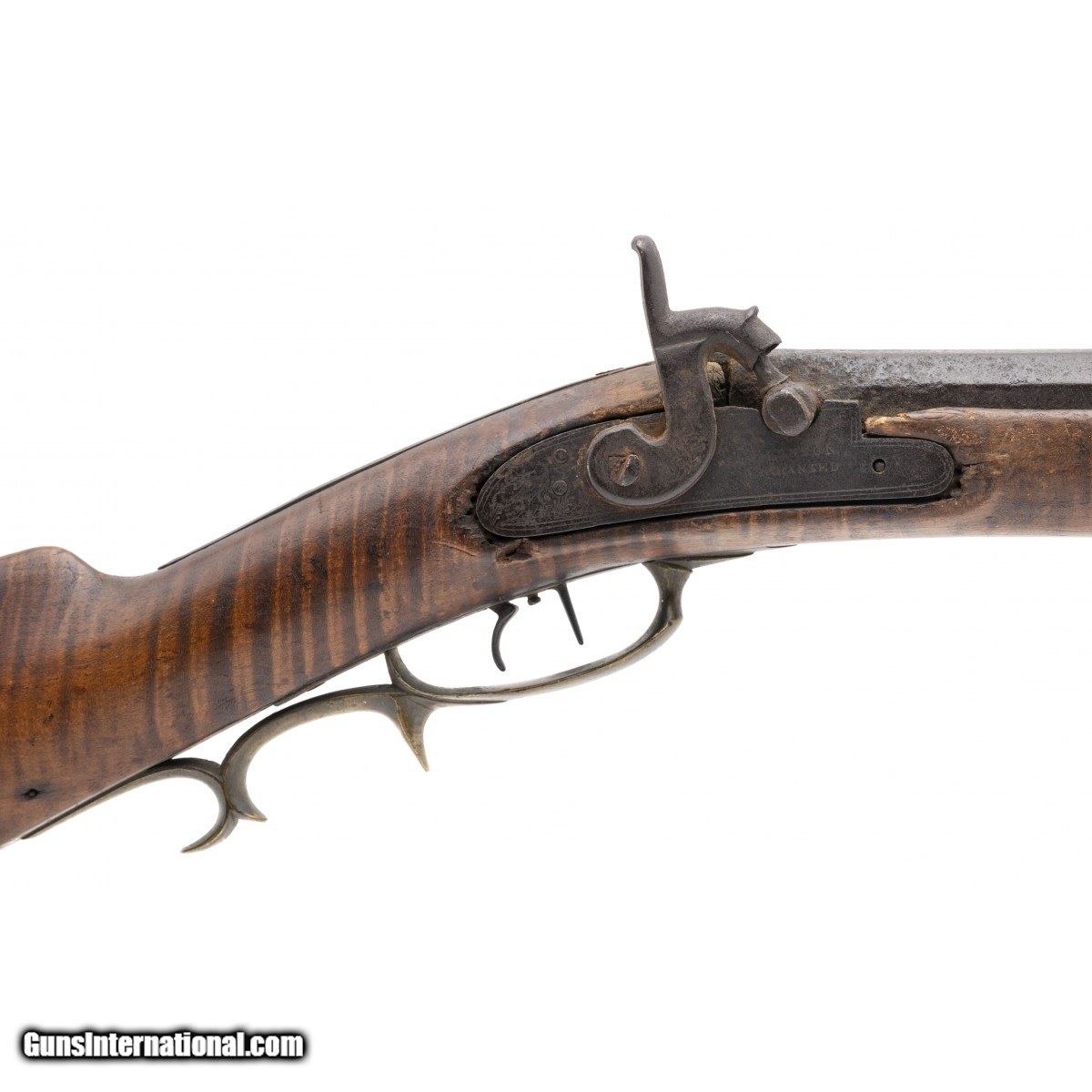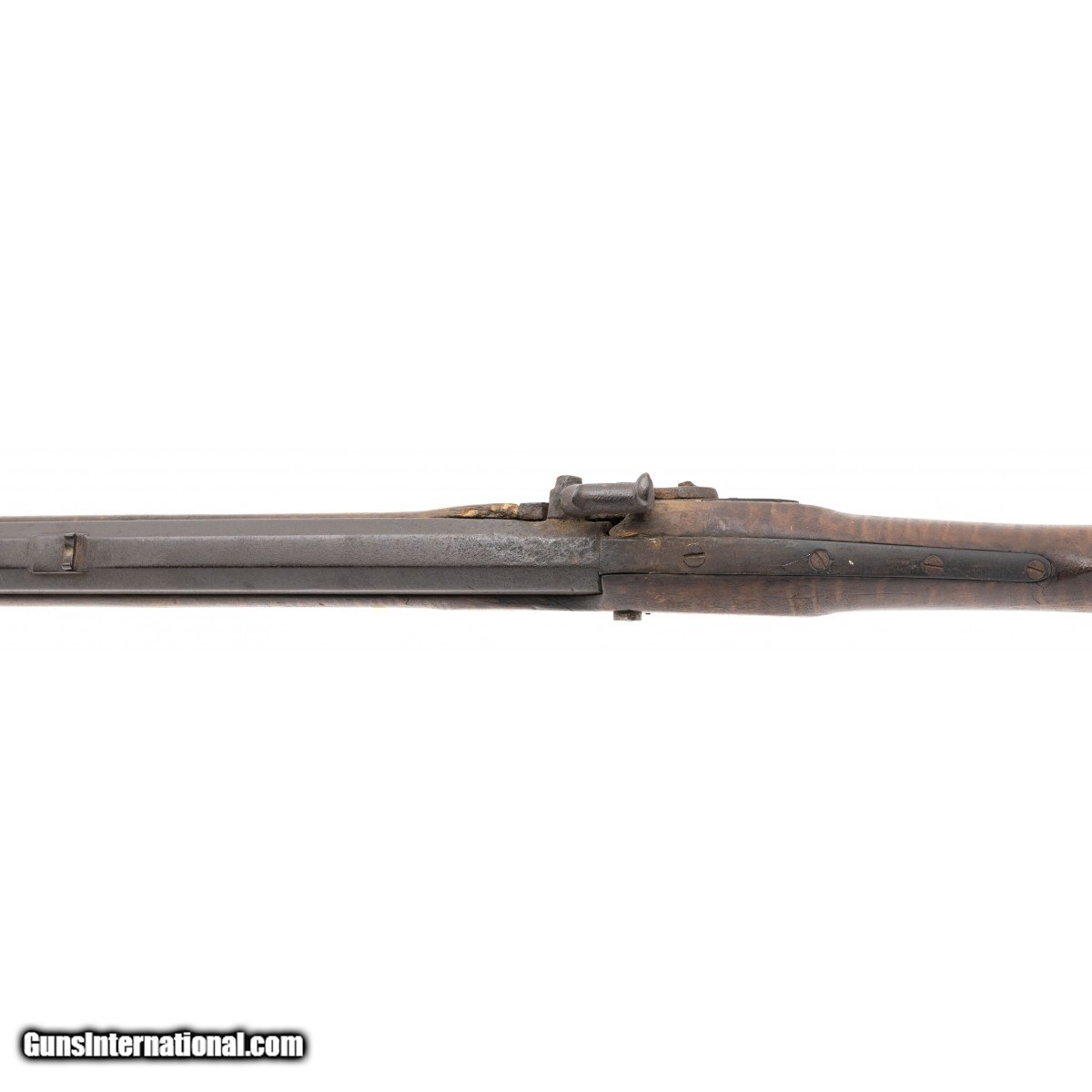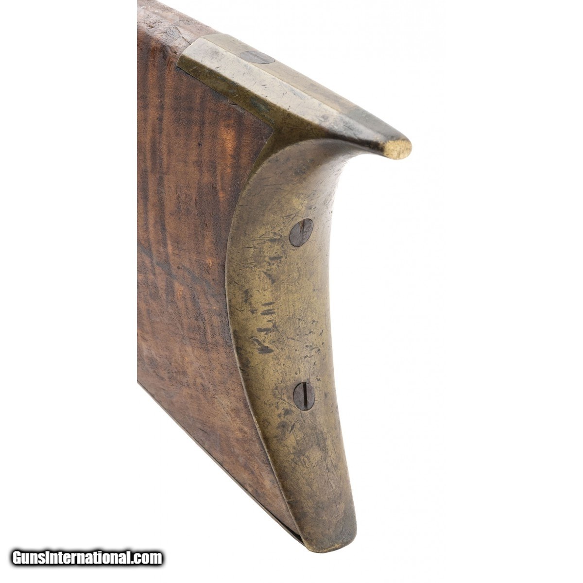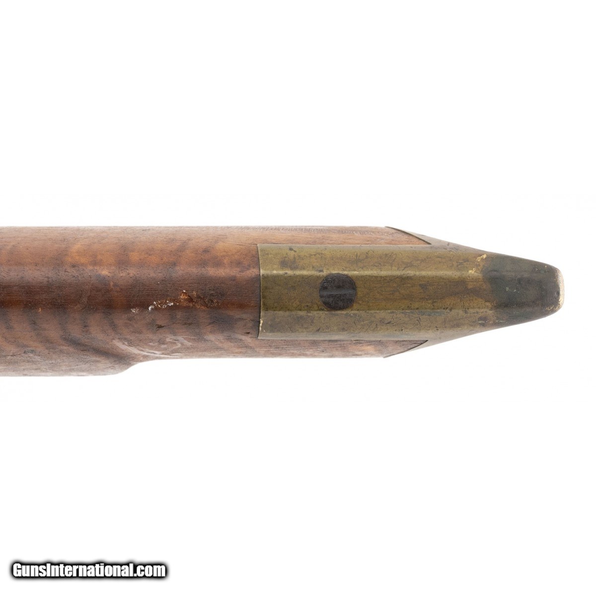 Description: "NSN, circa late 1830's to 1850's, .44 caliber, 32.25"" unmarked octagonal barrel. Barrel and other metal parts are a dark brown/grey patina with surface oxidation visible, bore has oxidation visible in the grooves with strong rifling remaining. Lock plate looks to have ""Wilkinson/WARRANTED forward of the hammer with floral scrolling at the rear. Wood loss is noted above the bolster, stock has expected nicks, dings and scratches. Action is loose and will hold at full cock. Consignment SOLD Antique: Yes |